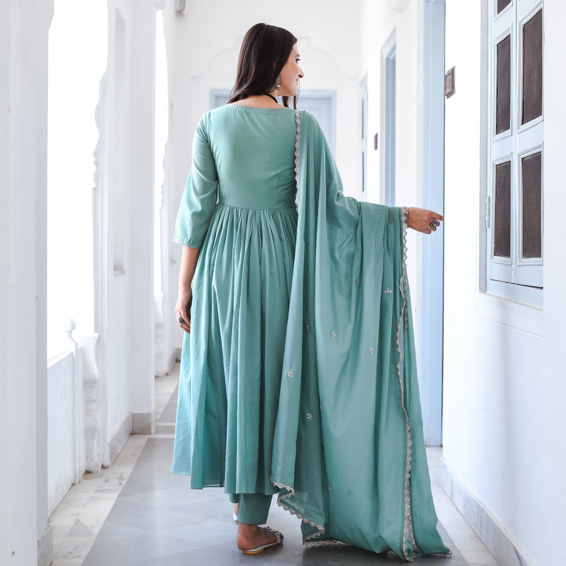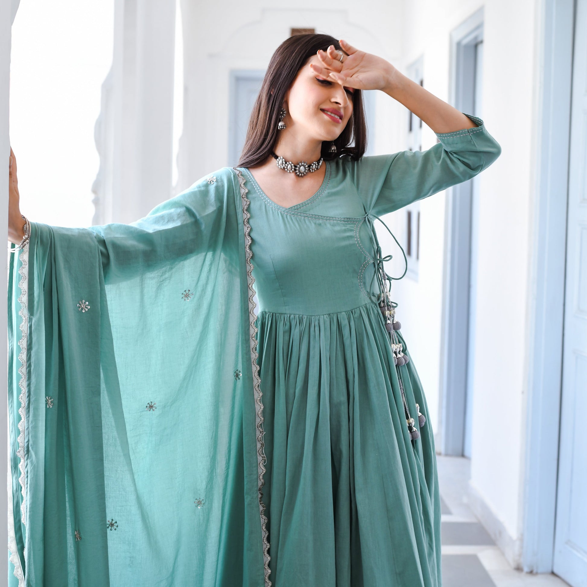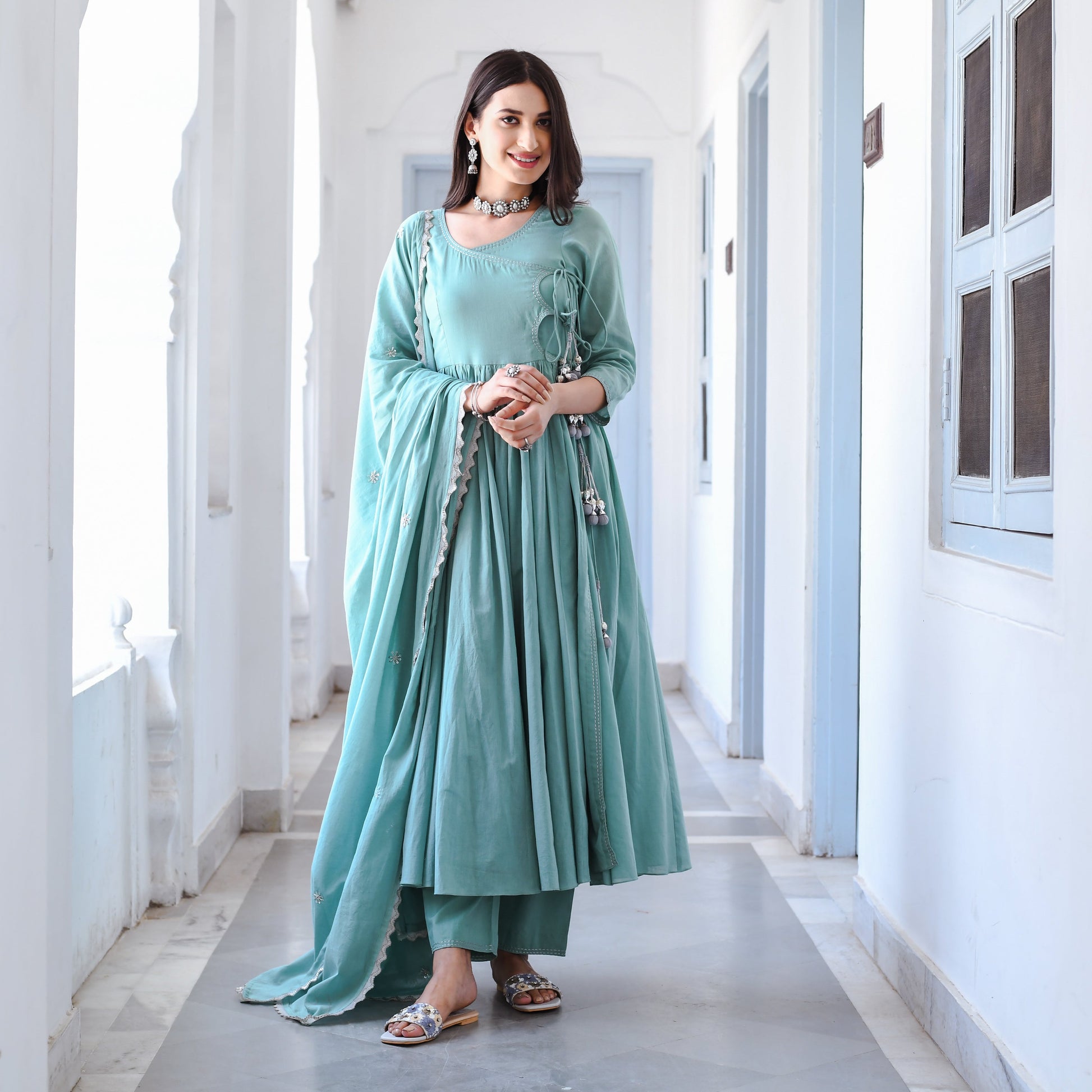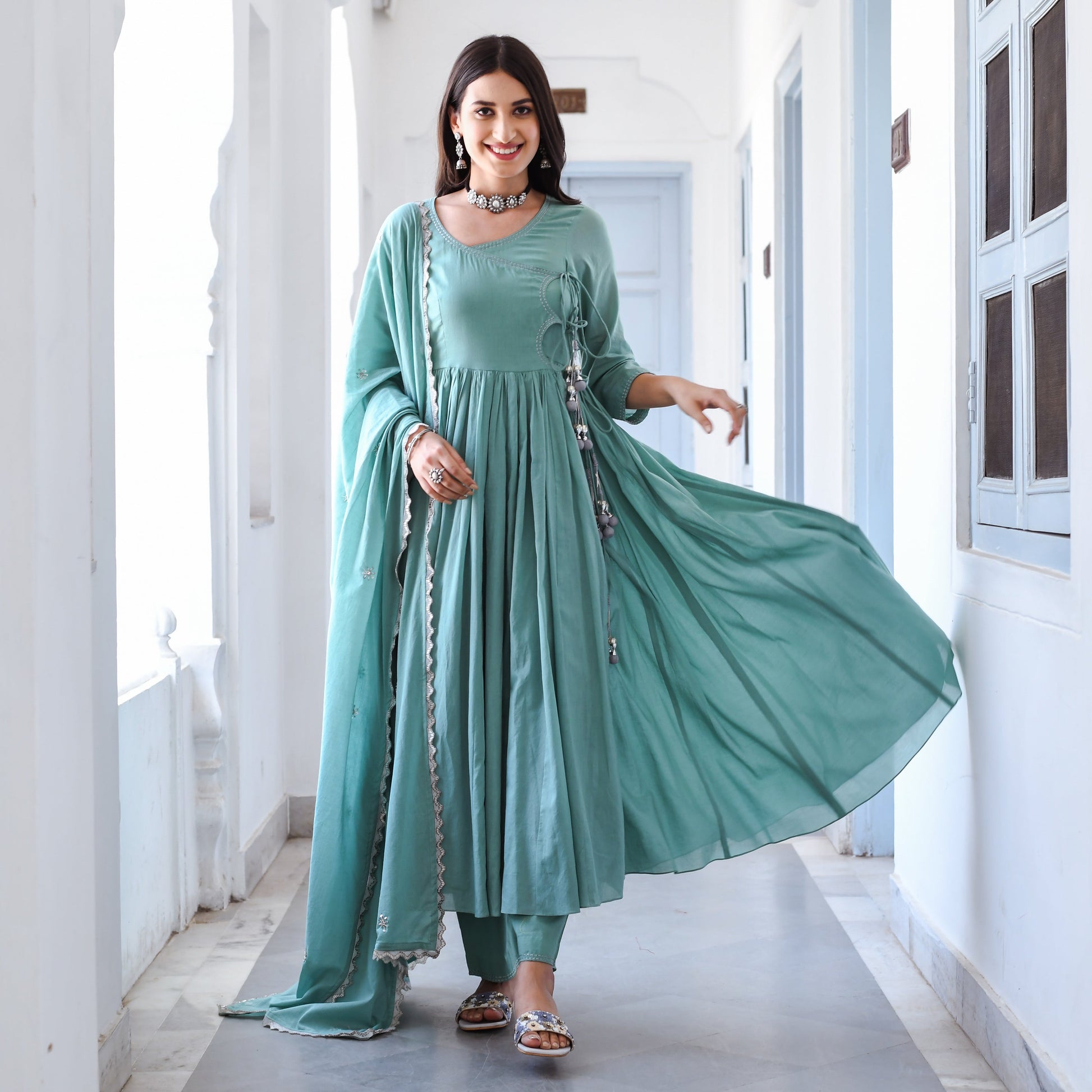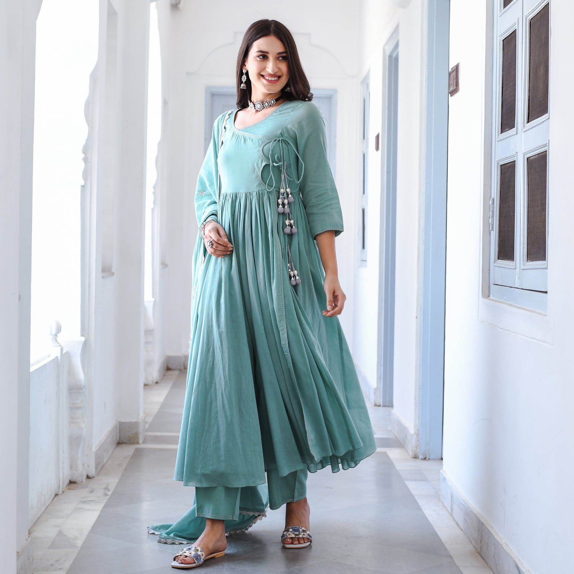 Introducing our premium Aadarshini Suit Set with a matching dupatta that exudes elegance and grace. This Set features a beautifully designed Angrakha-style top with delicate detailing and a flattering silhouette that will accentuate your curves. The soft and breathable mulmul fabric feels comfortable against the skin, making it perfect for all-day wear. The set comes with a matching dupatta that adds a touch of sophistication to the ensemble. The light-teal colour of the Set is refreshing and calming, making it perfect for any occasion, be it a wedding or a festive celebration.