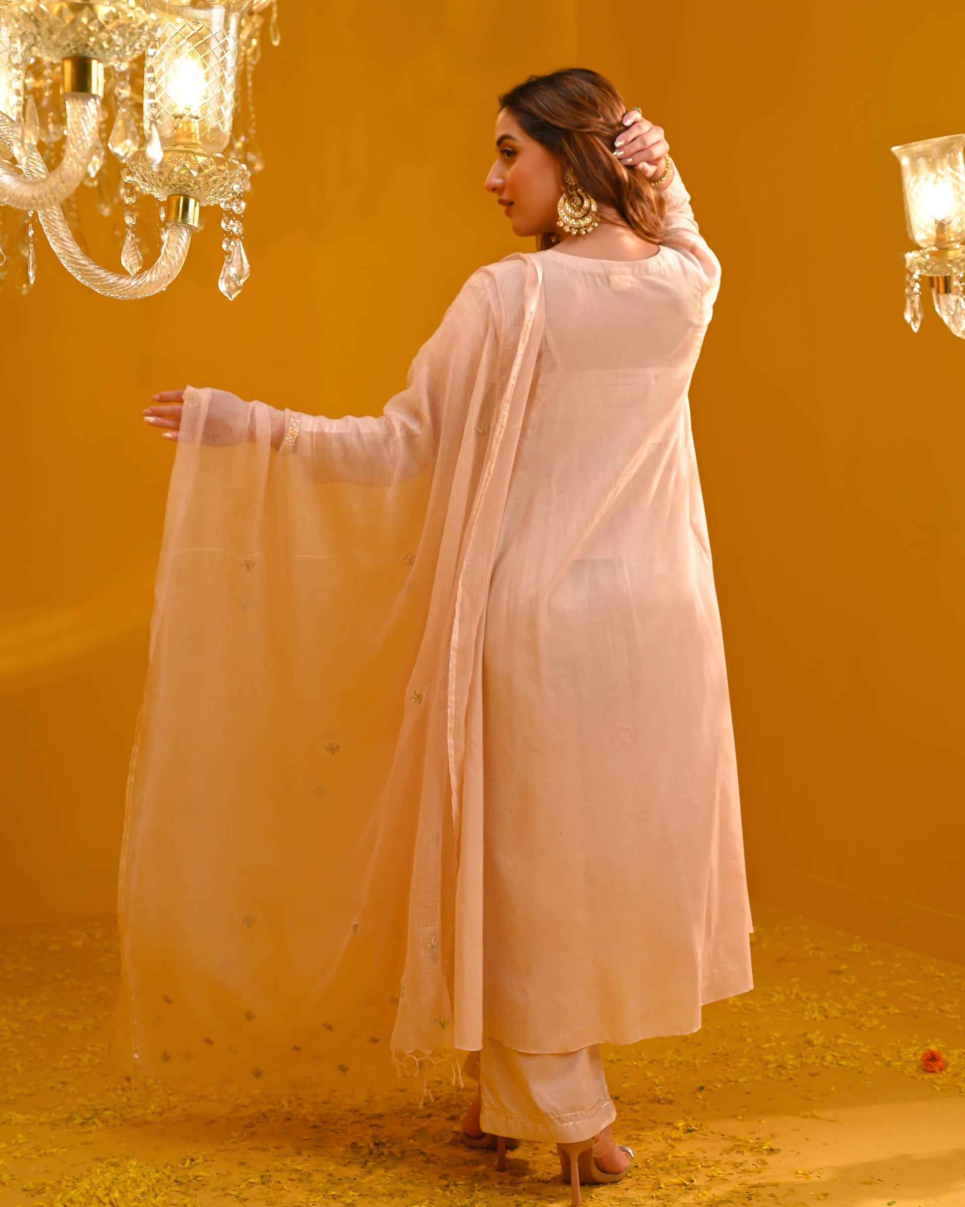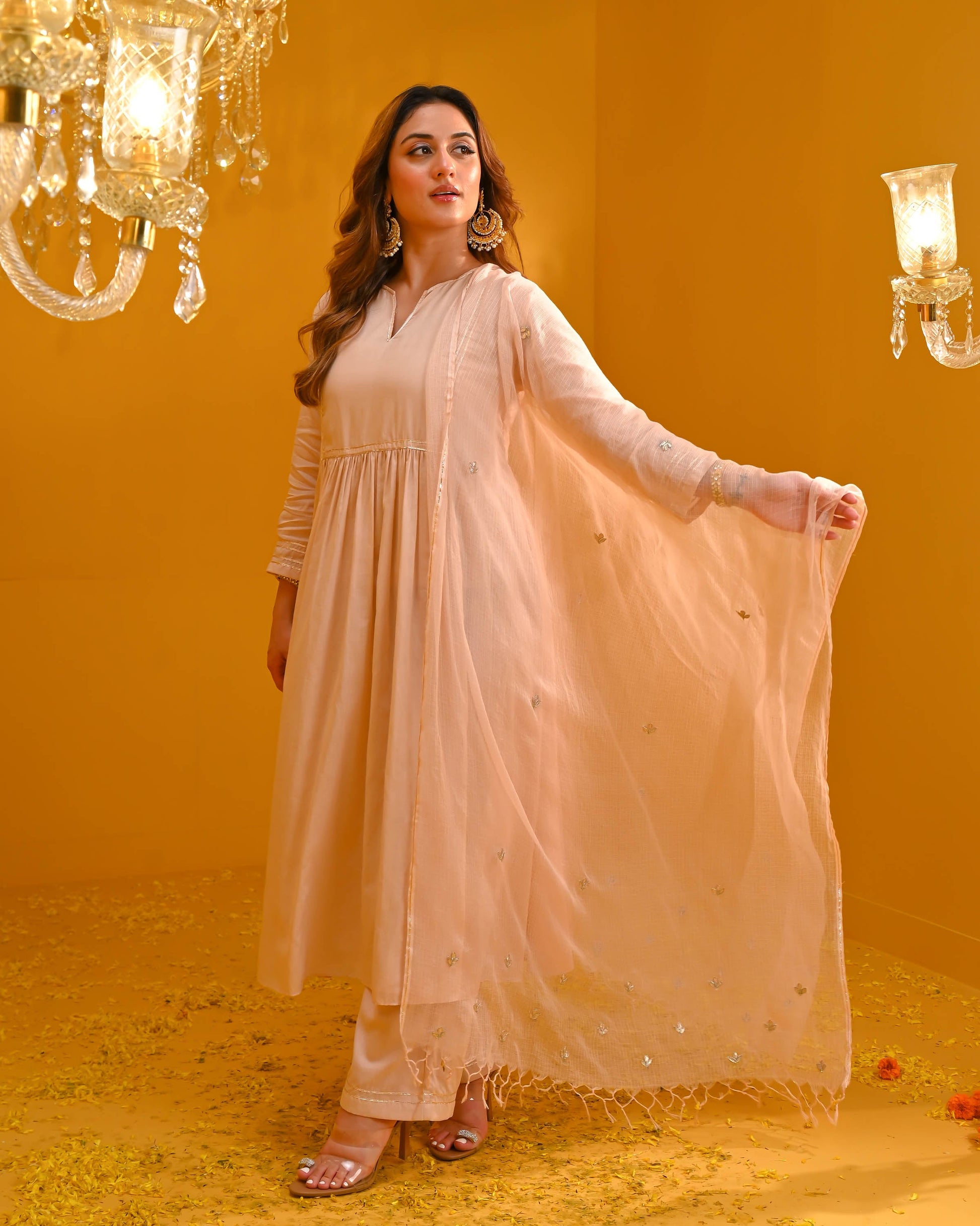 Elevate your ethnic wardrobe with the Aaradhya Cotton Suit Set, crafted from plush cotton in a beautiful peach hue. The flared Anarkali-style kurta features a round neck with a notch and gota lace detailing on the yoke, along with three-quarter sleeves. Paired with matching pants and a Kota Doriya dupatta adorned with gota embellishments, it's perfect for any festive occasion.