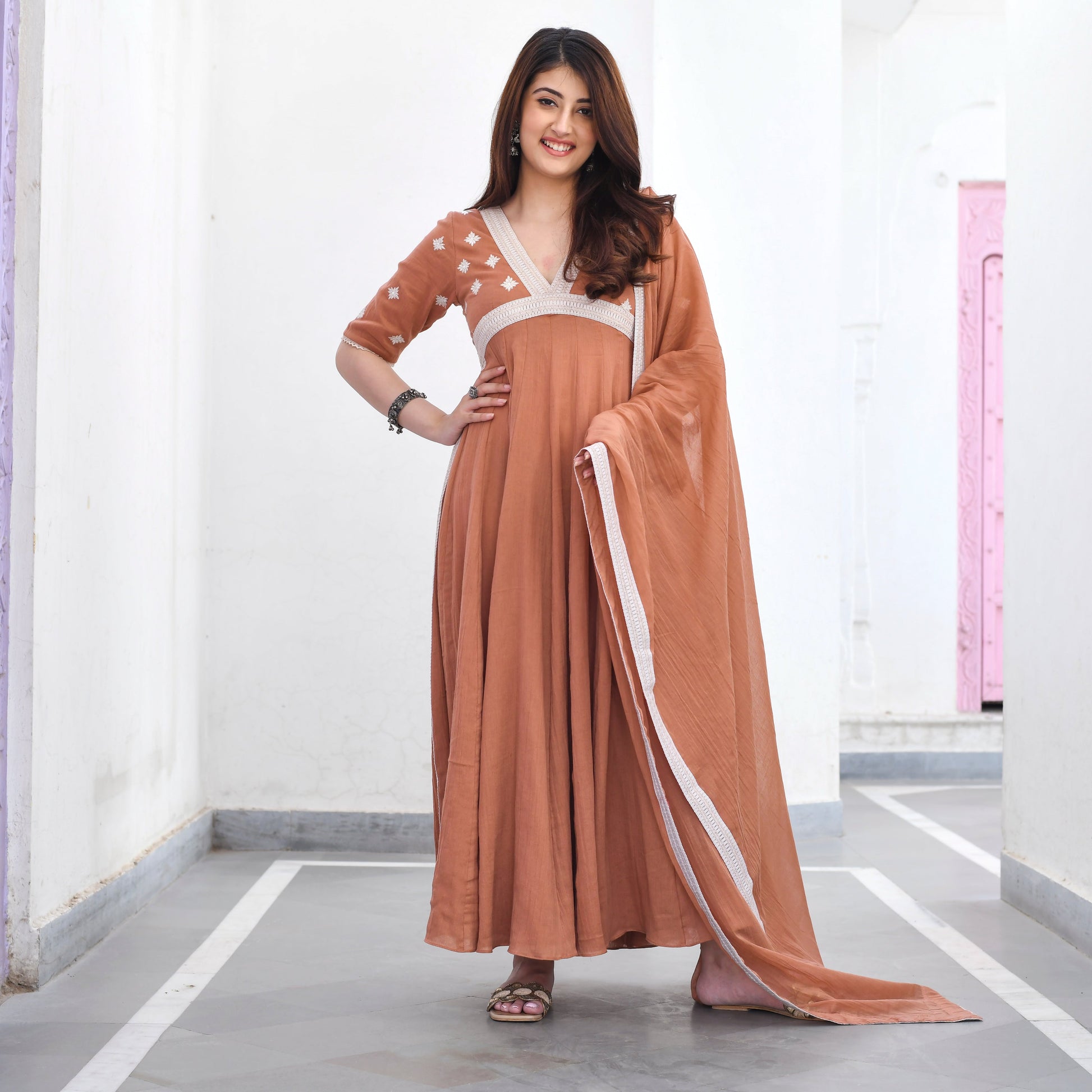 Get ready to embrace a comfortable and stylish look with our Aaritra Suit Set! Crafted from the softest cotton, this kurta set feels incredibly comfortable against your skin, making it ideal for all-day wear. The soft tan colour gives it a timeless appeal while the V-neck adds a touch of sophistication to the overall design. But what sets this kurta set apart is its schiffli details. With its playful and unconventional design, it's perfect for those who want to add some fun and excitement to their wardrobe.