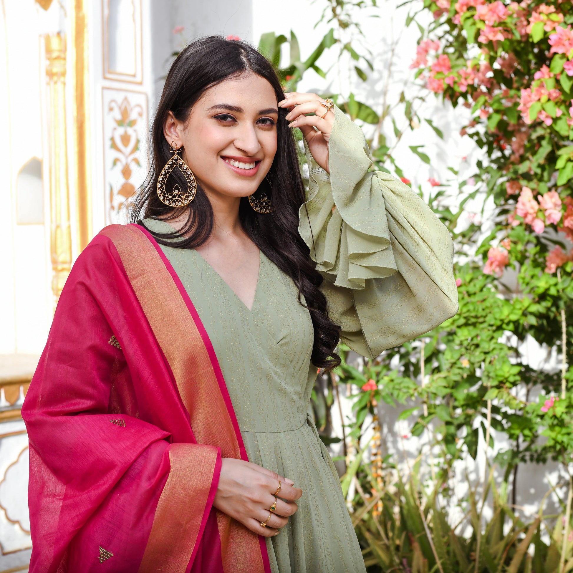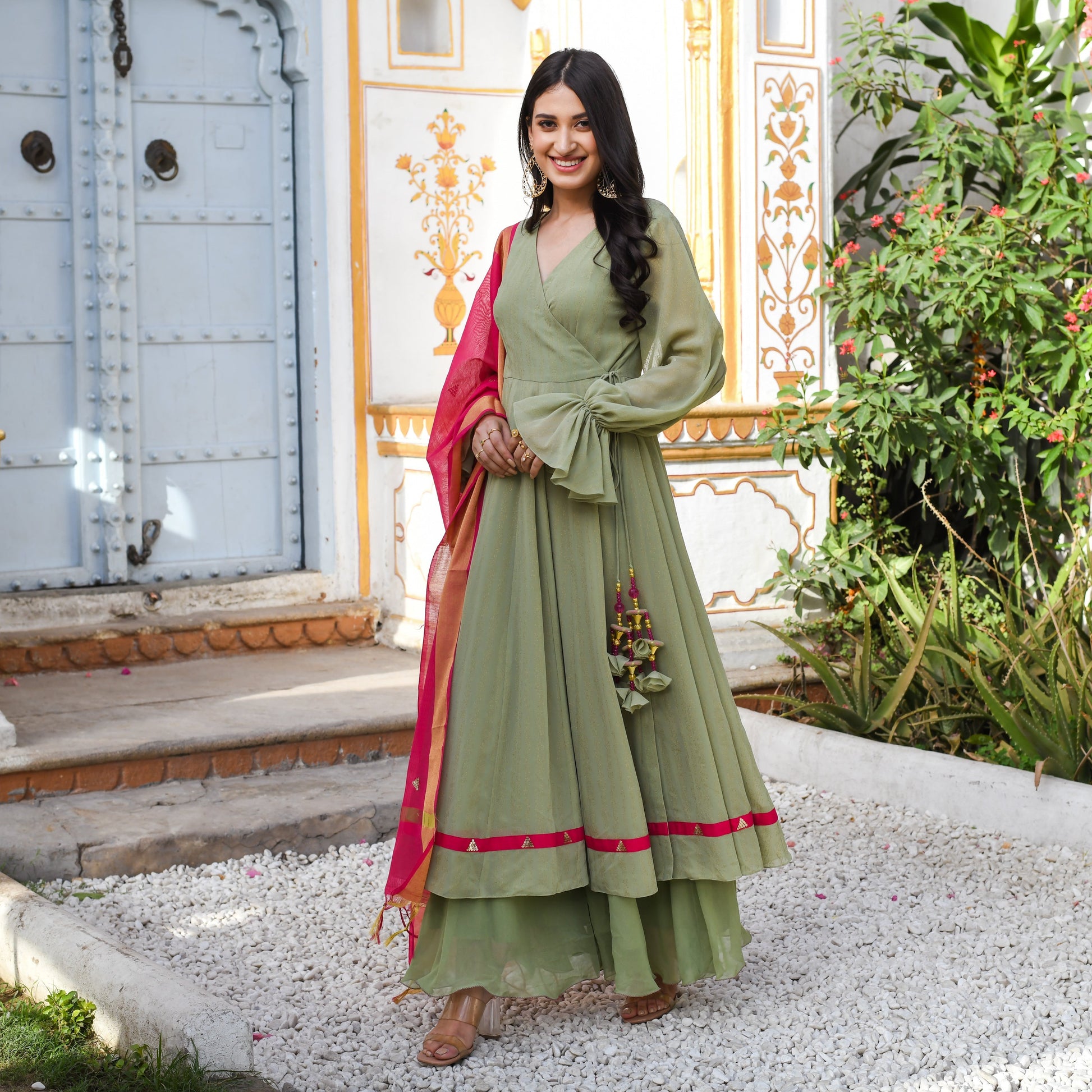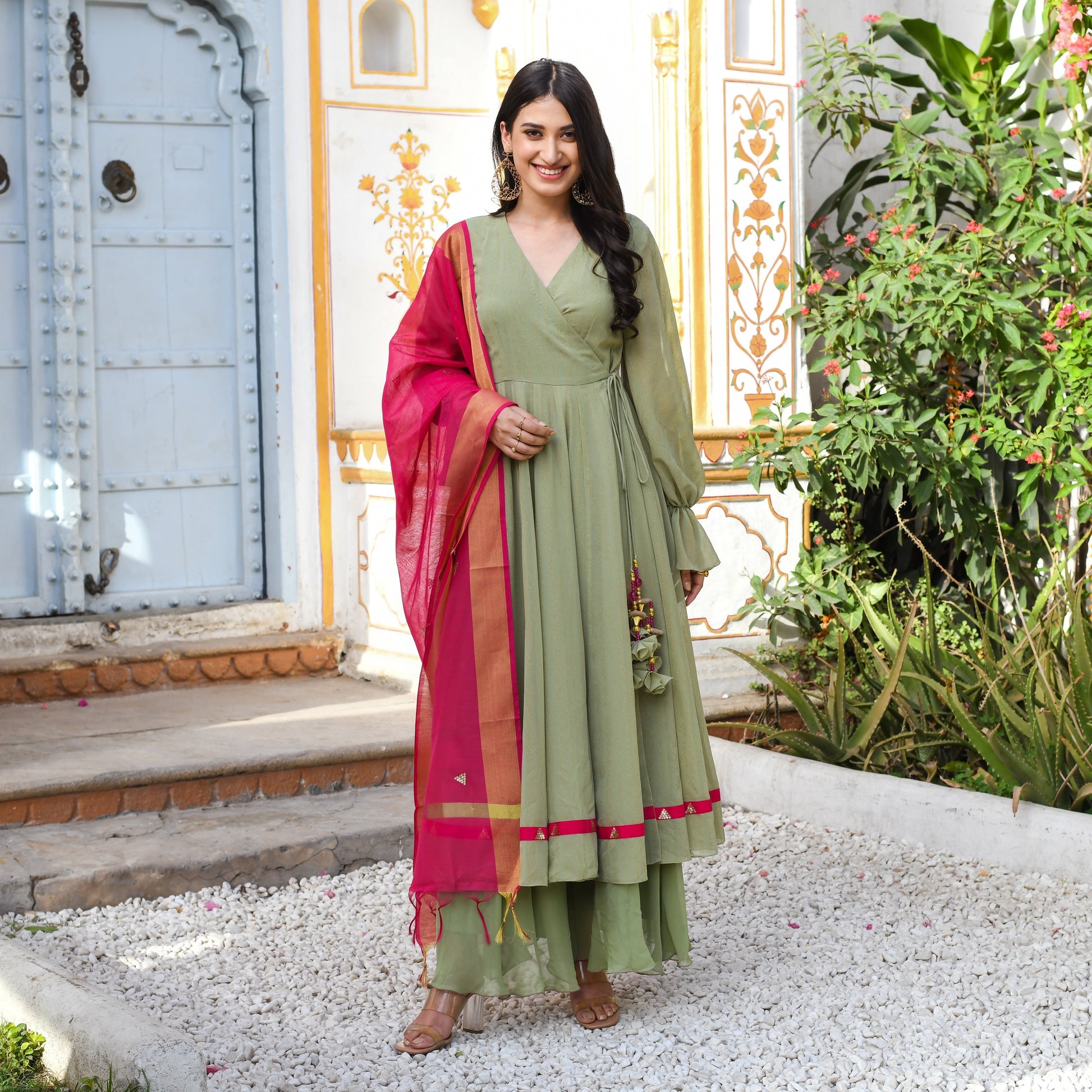 Set in a truly unique contrast of sage green and pink, this Aashika Suit Set beyond outstanding. The Angrakha style bodice with V-neckline and tie-up detailing adds a touch of feminine elegance to the outfit. What makes this Suit Set extraordinary is its one-of-a-kind sleeve. The georgette material allows the suit to flow like water and the complimentary pink dupatta adds a pop of colour to the outfit. It's perfect for weddings, parties, or any festive occasion, and will make you feel confident and stylish all day long. Do not miss out on this beauty!