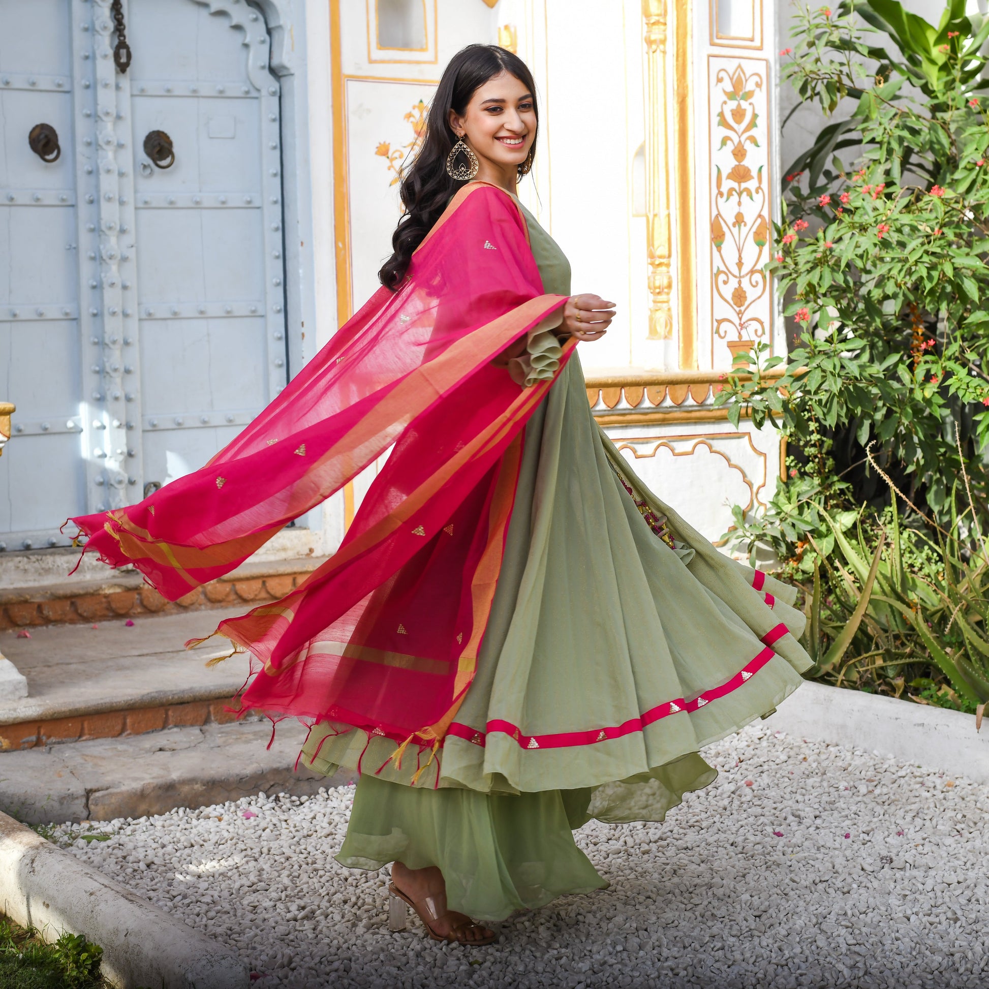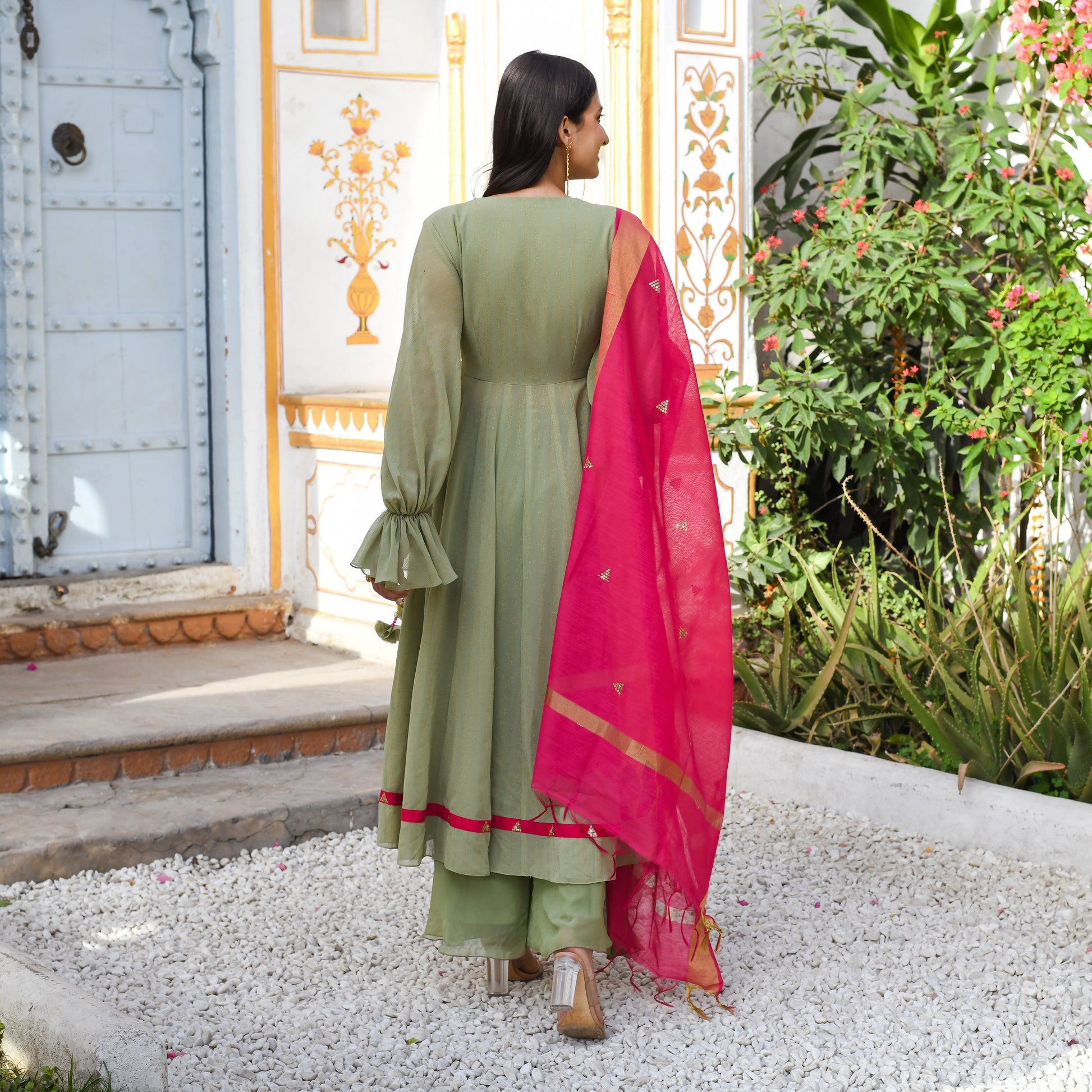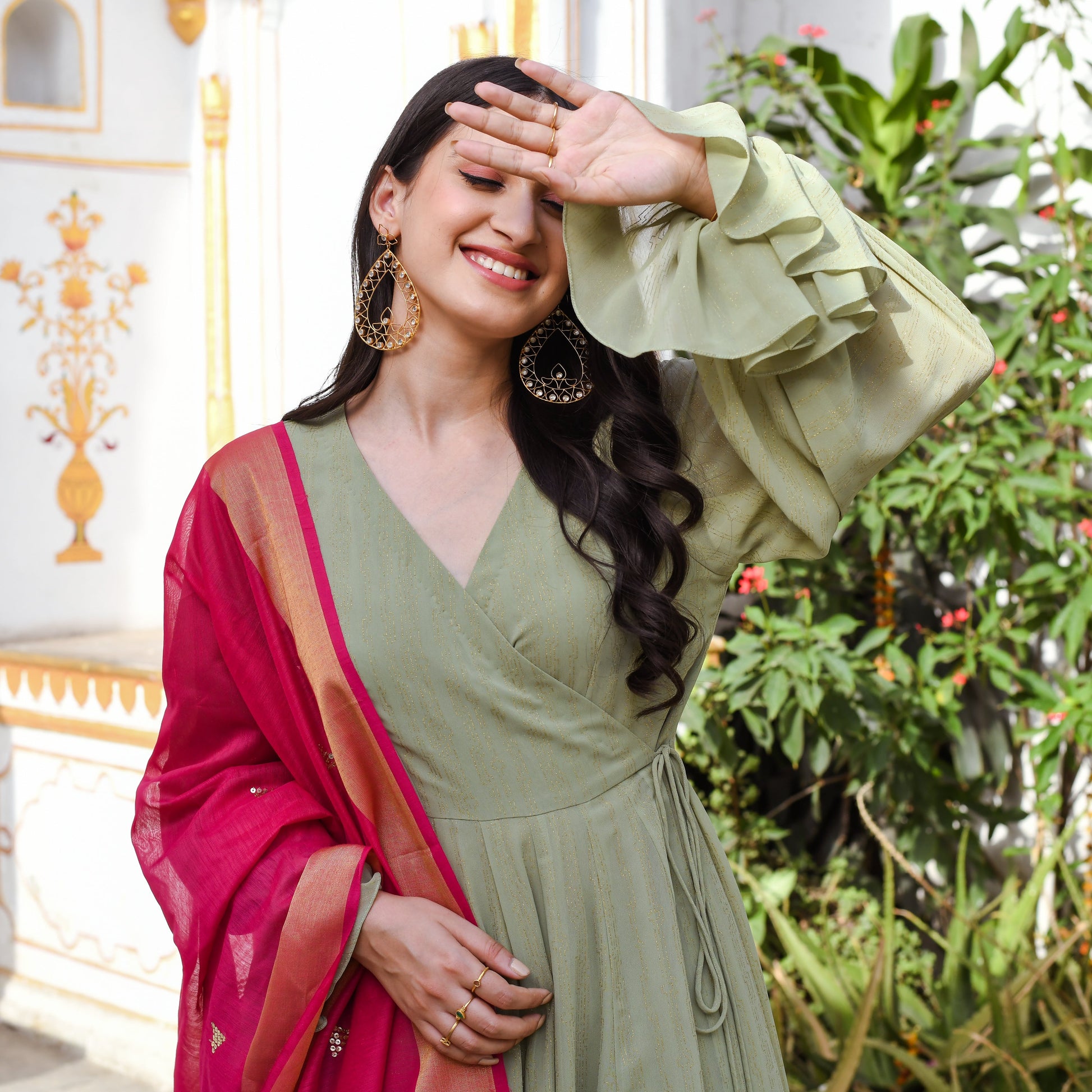 Set in a truly unique contrast of sage green and pink, this Aashika Suit Set beyond outstanding. The Angrakha style bodice with V-neckline and tie-up detailing adds a touch of feminine elegance to the outfit. What makes this Suit Set extraordinary is its one-of-a-kind sleeve. The georgette material allows the suit to flow like water and the complimentary pink dupatta adds a pop of colour to the outfit. It's perfect for weddings, parties, or any festive occasion, and will make you feel confident and stylish all day long. Do not miss out on this beauty!