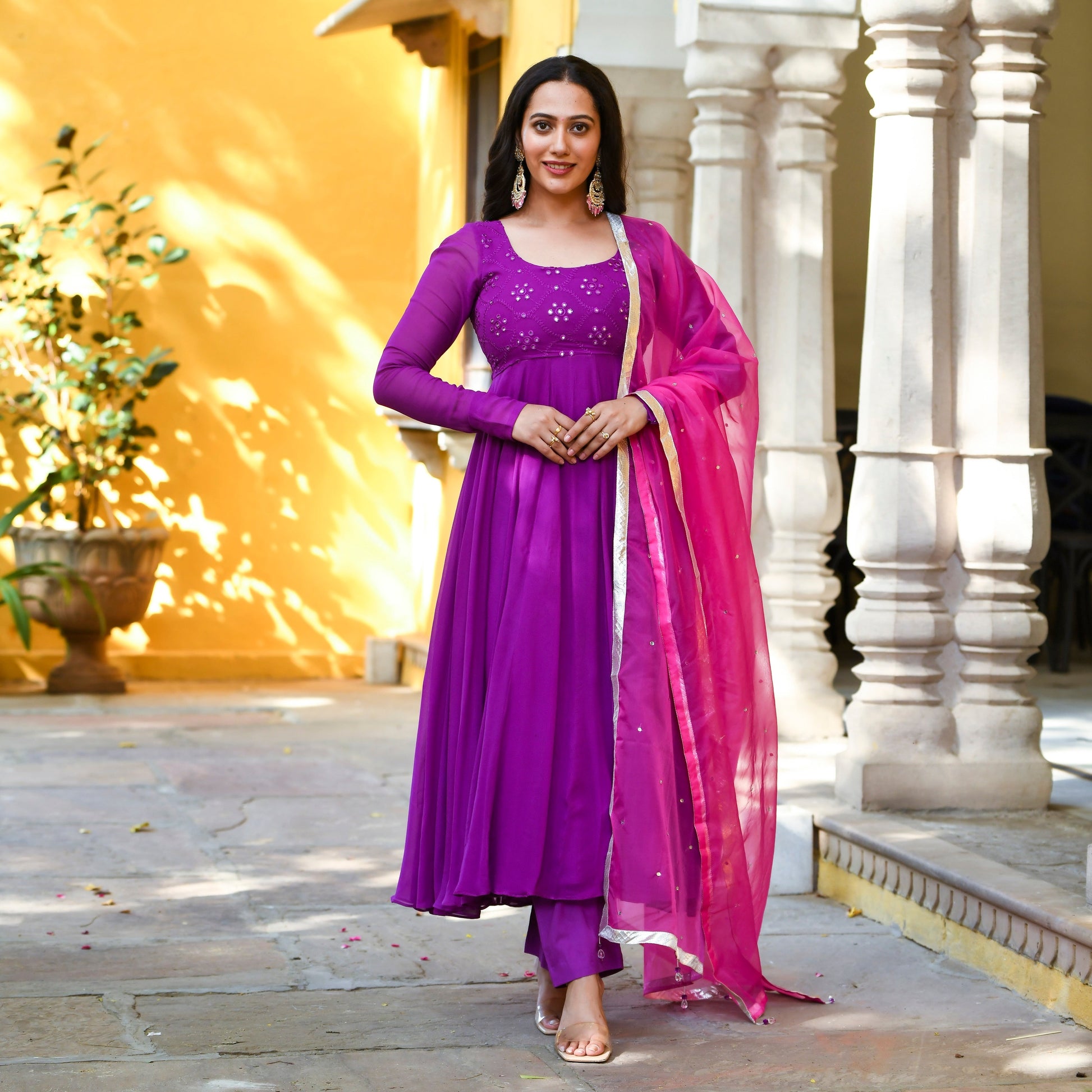 From the magnificent Mauve colour to the stunning fit and flare design of the kurta, our Anushka Suit Set is all set to steal hearts. We love the full-sleeved aesthetic of the outfit and the mirror-work details add the perfect amount of dazzle to the outfit.