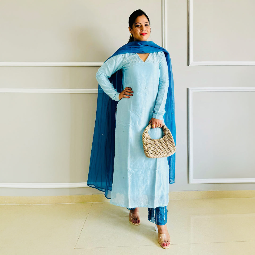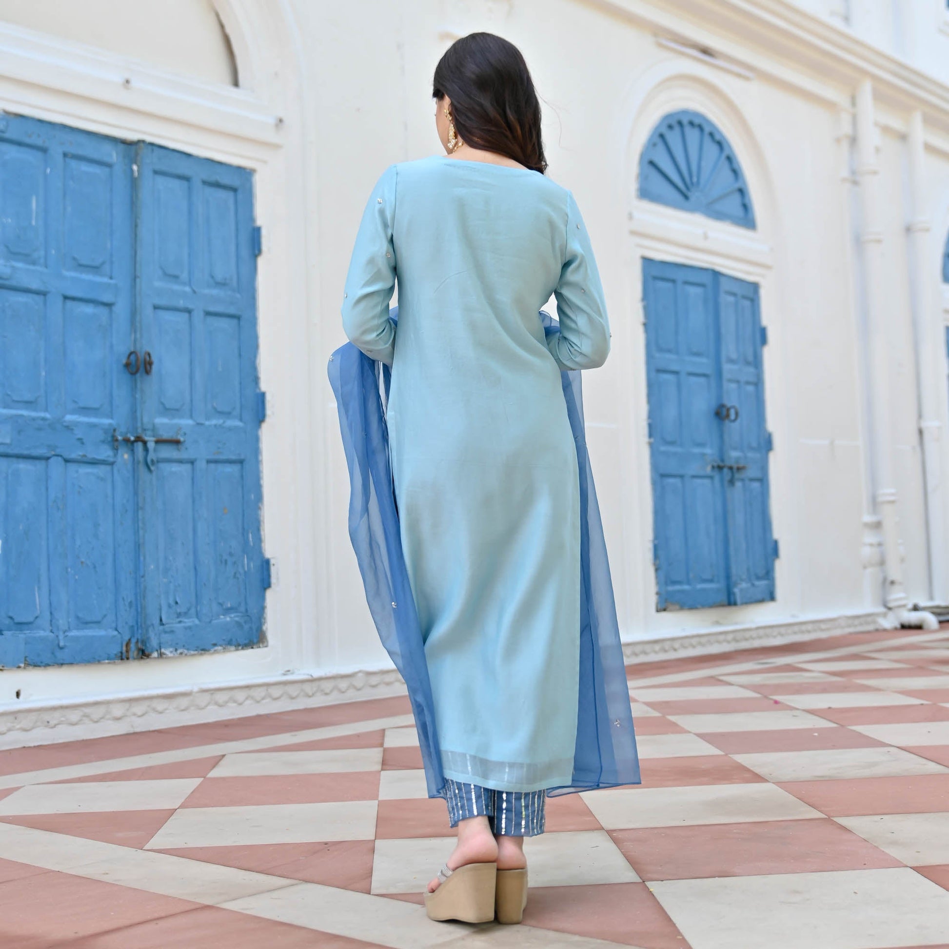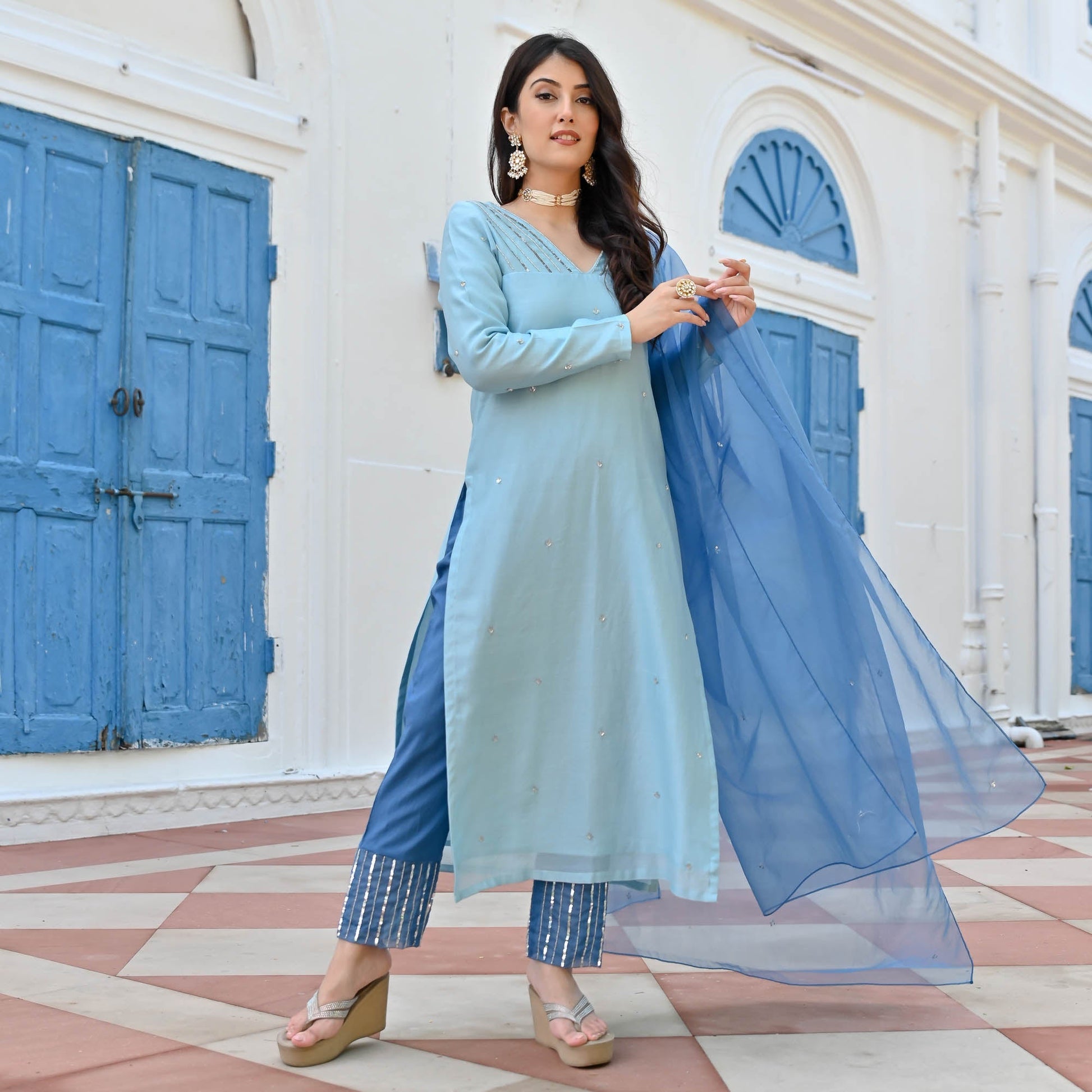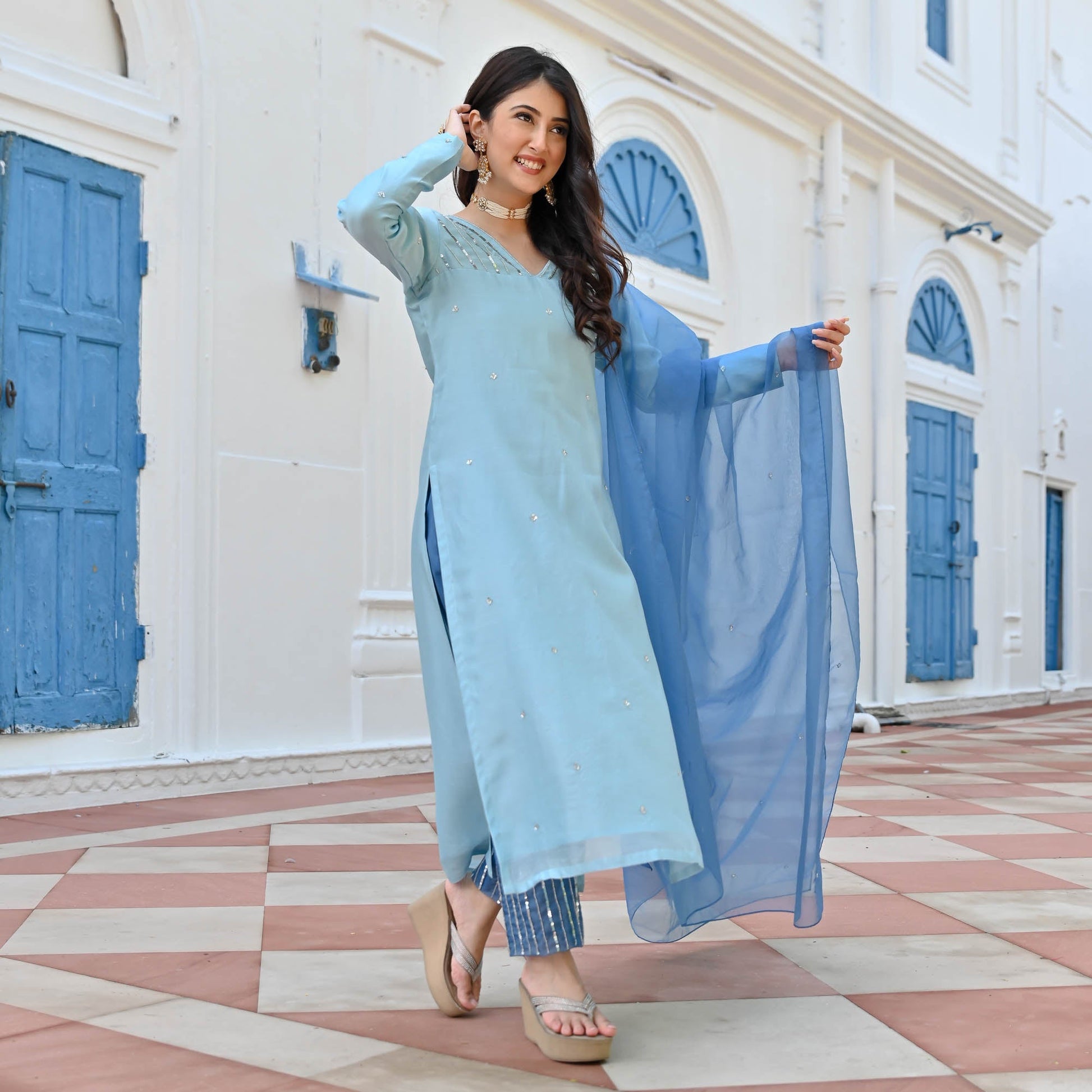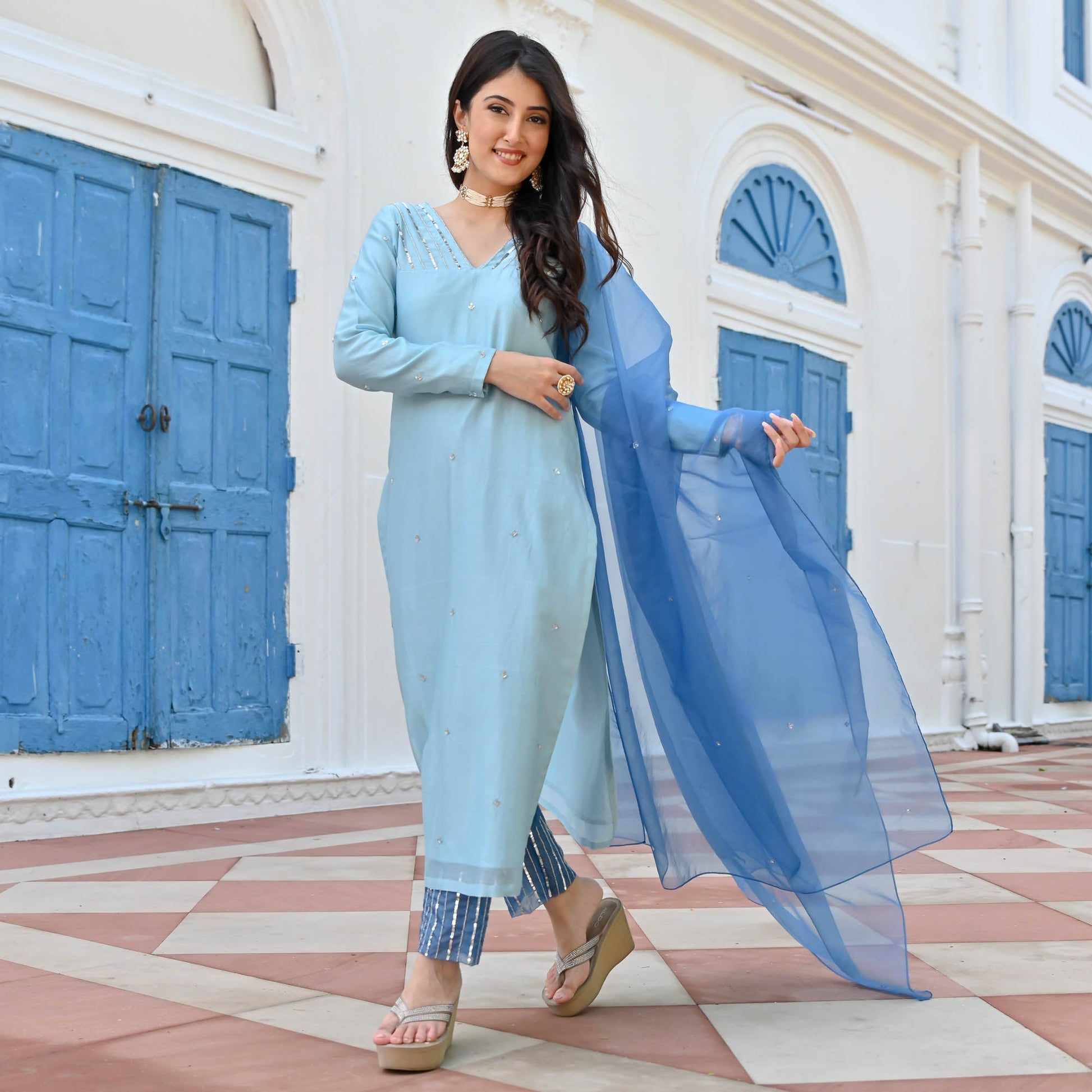 Get ready to rock the fashion world with the Arsh Suit Set. This set features delightful shades of light blue, as dreamy as a cloud on a summer's day. Crafted from luxurious Chanderi fabric and embellished with cut-dana and sequin work, it's the perfect blend of sophistication and sass.