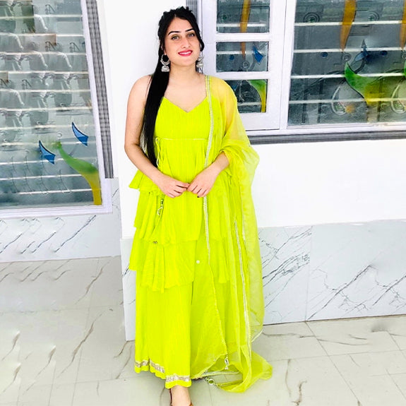 Introducing our gorgeous and vibrant Asfar Suit Set, the perfect combination of comfort, style, and sophistication. Crafted from high-quality crepe fabric with a hint of shimmering lurex, this Set is designed to flatter all body types and provide a comfortable, breathable fit. The Set also features delicate thin straps that give it a chic and modern touch, while the intricate lappa placement work adds a touch of traditional charm and elegance. The organza dupatta is the perfect finishing touch, providing a touch of softness and grace that complements the Suit Set beautifully.