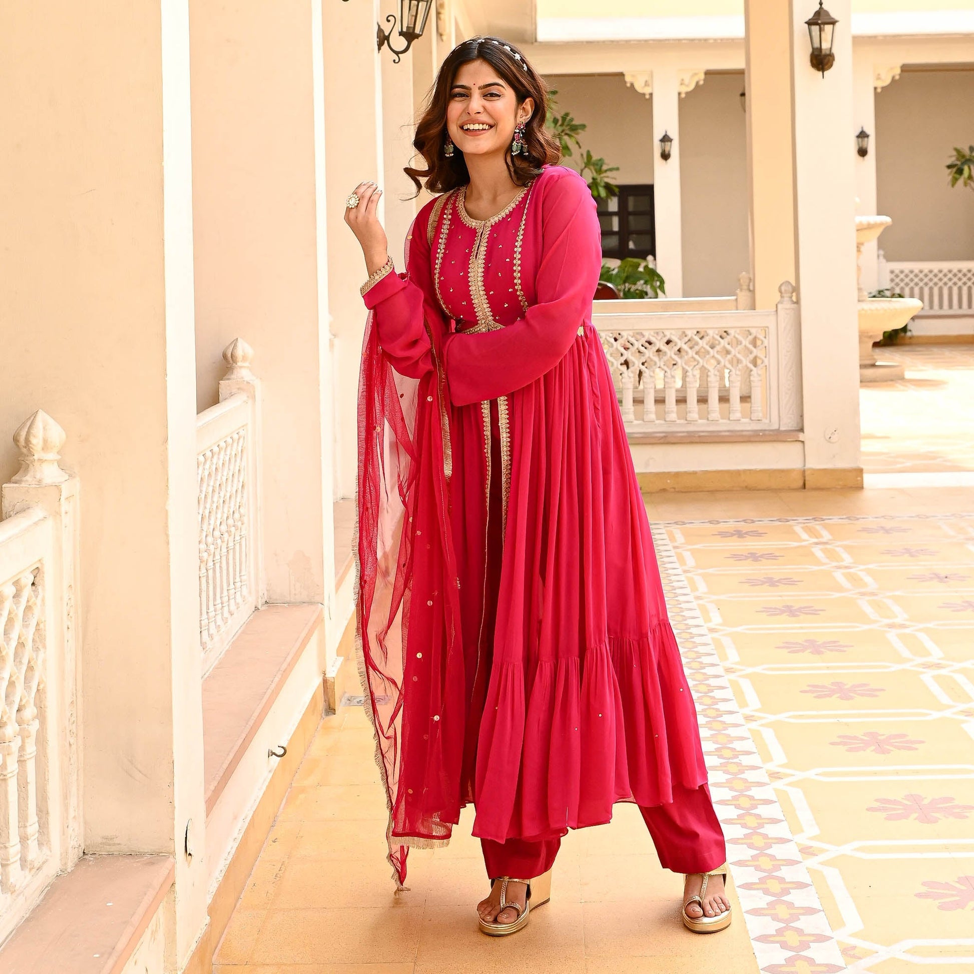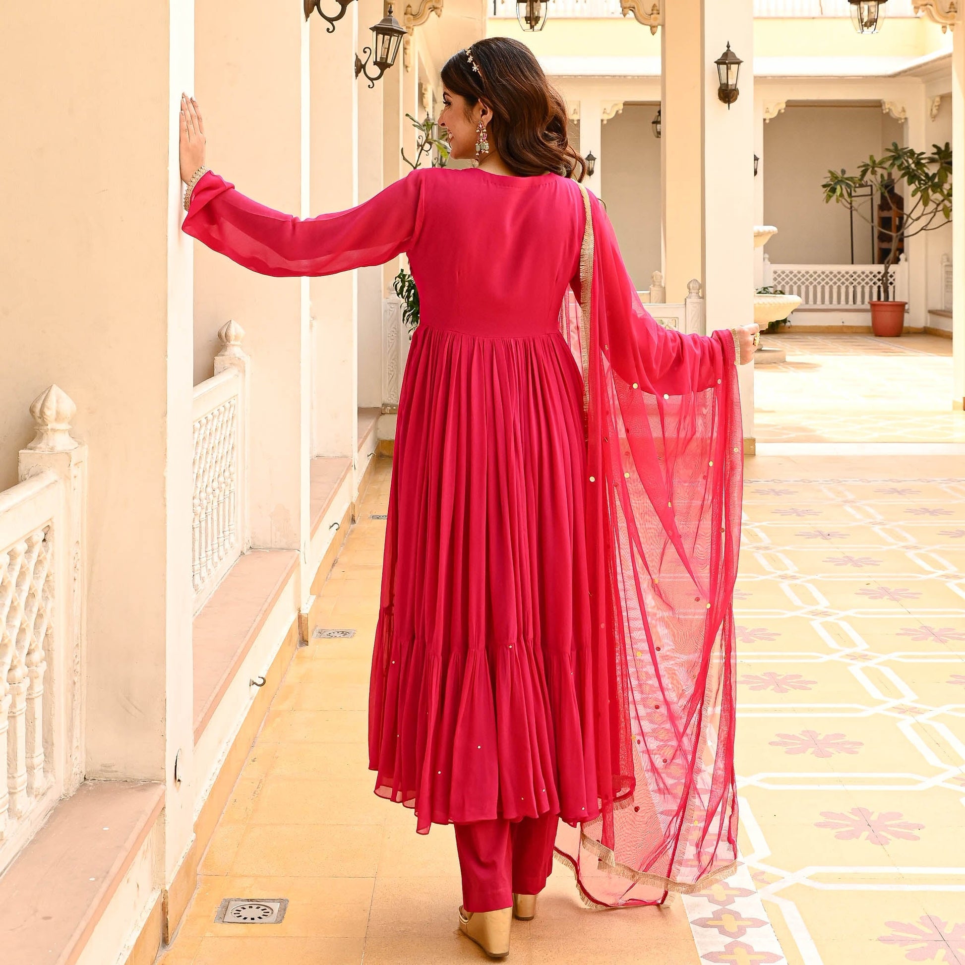 Dive into a world of vibrant elegance with our Avni Suit Set! Crafted from luxurious georgette, it boasts stunning hot pink hues adorned with intricate sequin and cut dana handwork along the front yoke and placket. Featuring a round neck, full sleeves, and a tantalizing slit down the middle, it's paired with matching pants and a net dupatta, embellished with sequins and fringe lace for a touch of whimsy. Flaunt your style with every step!