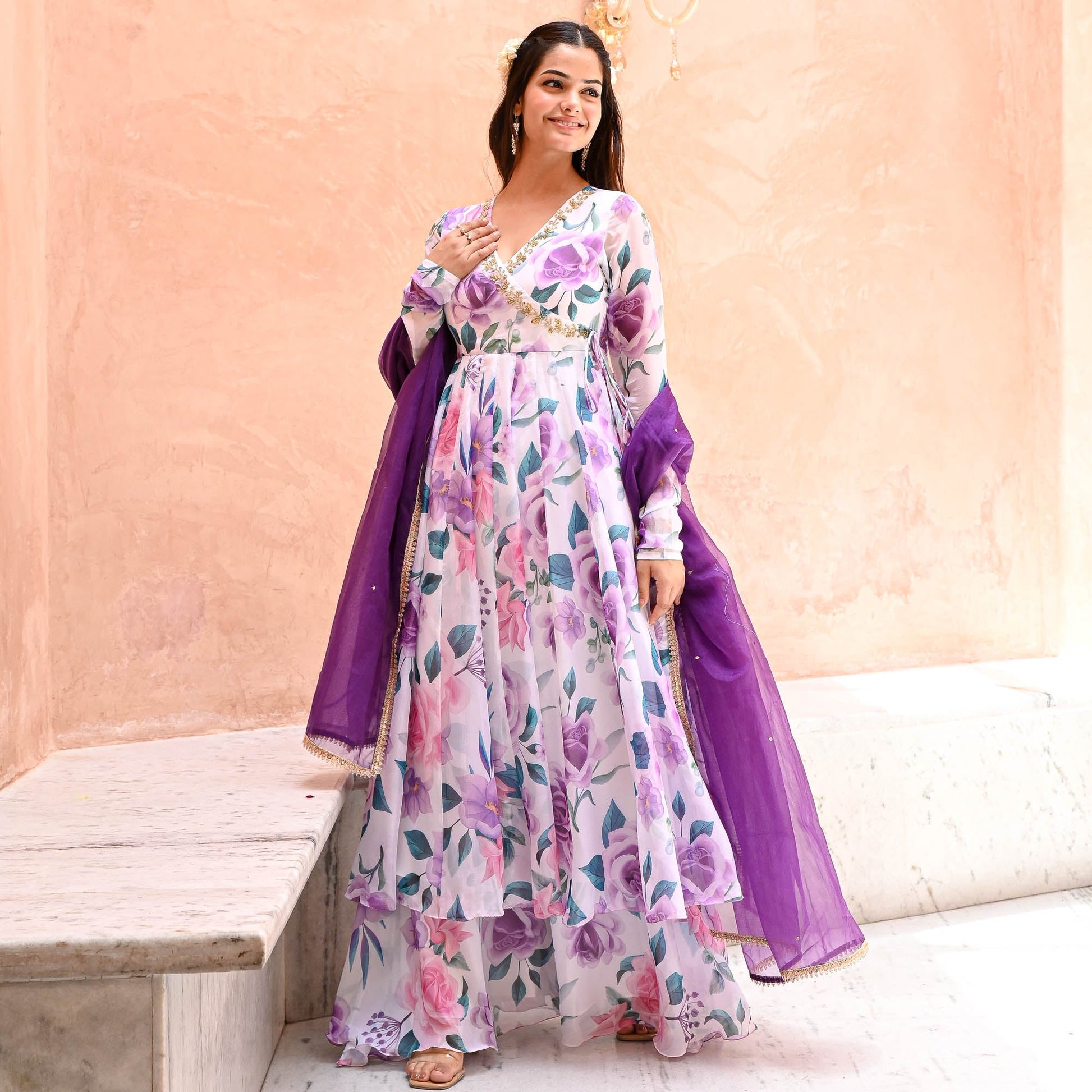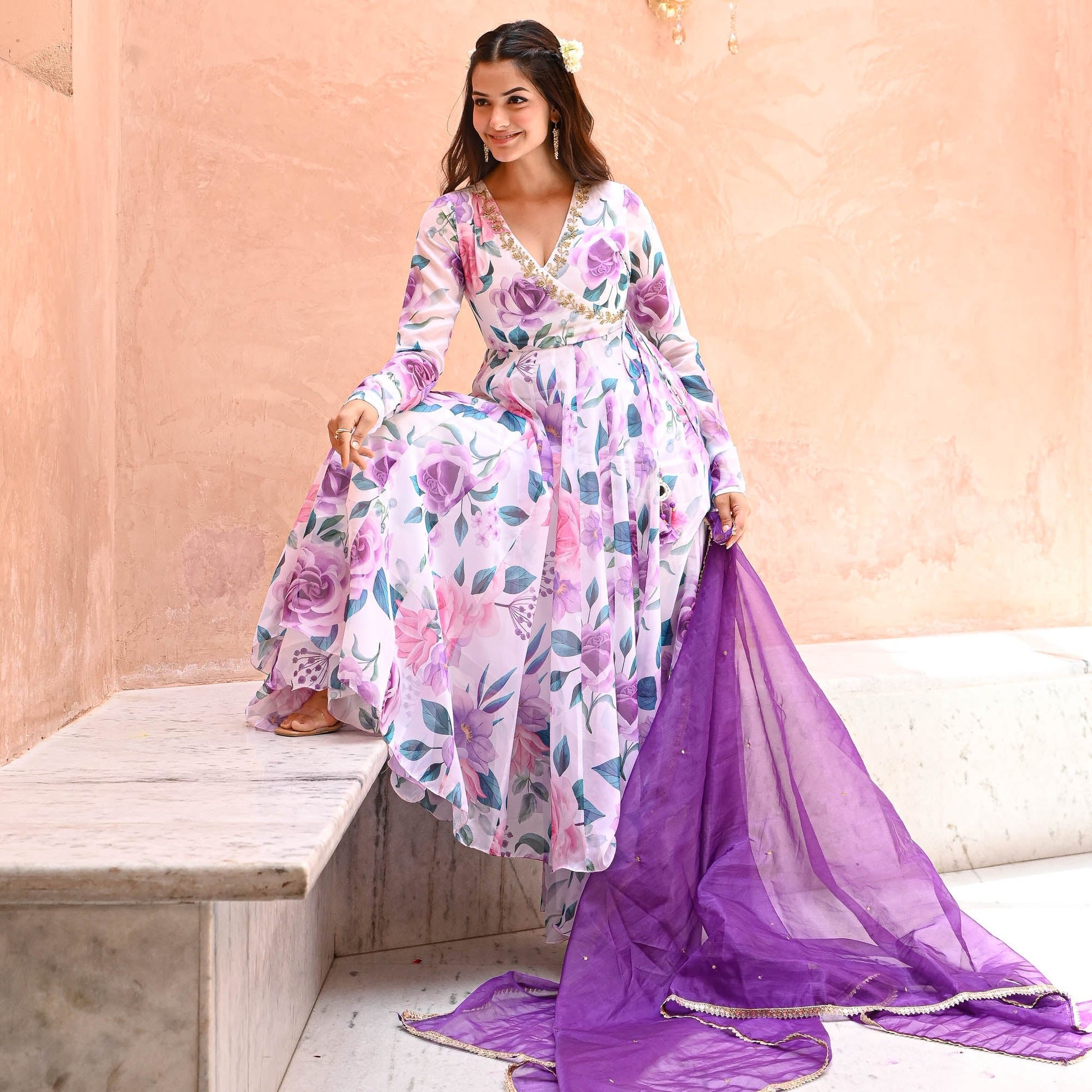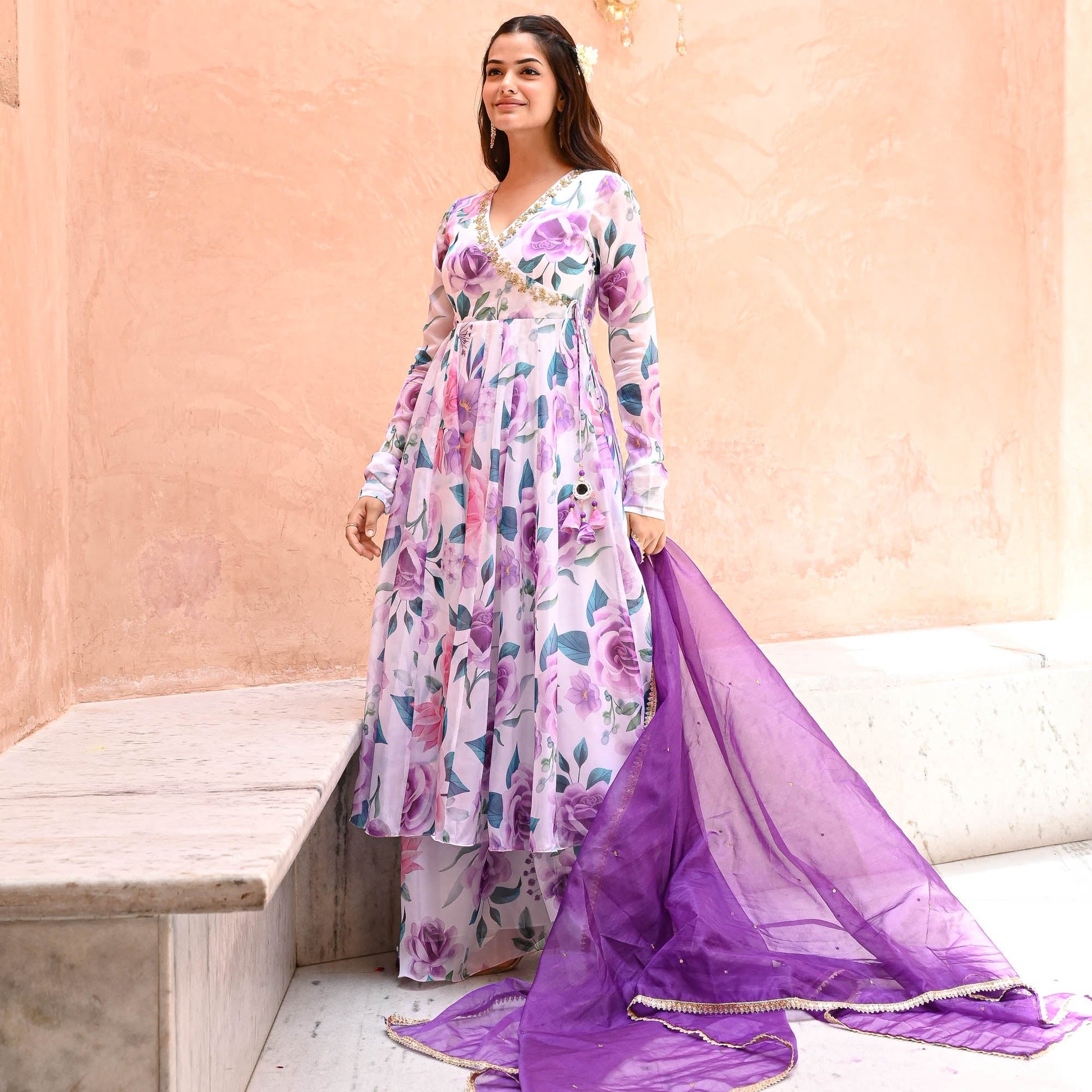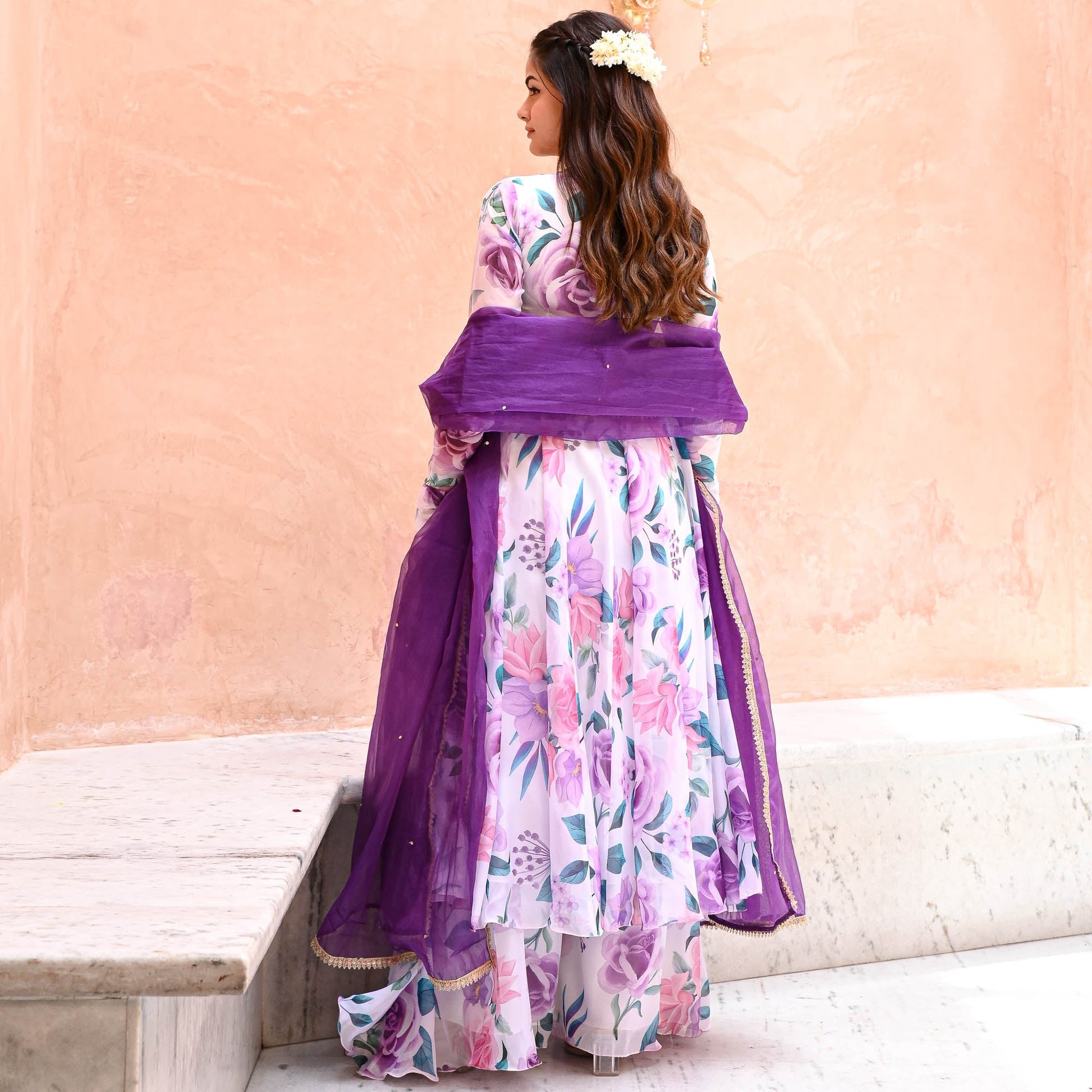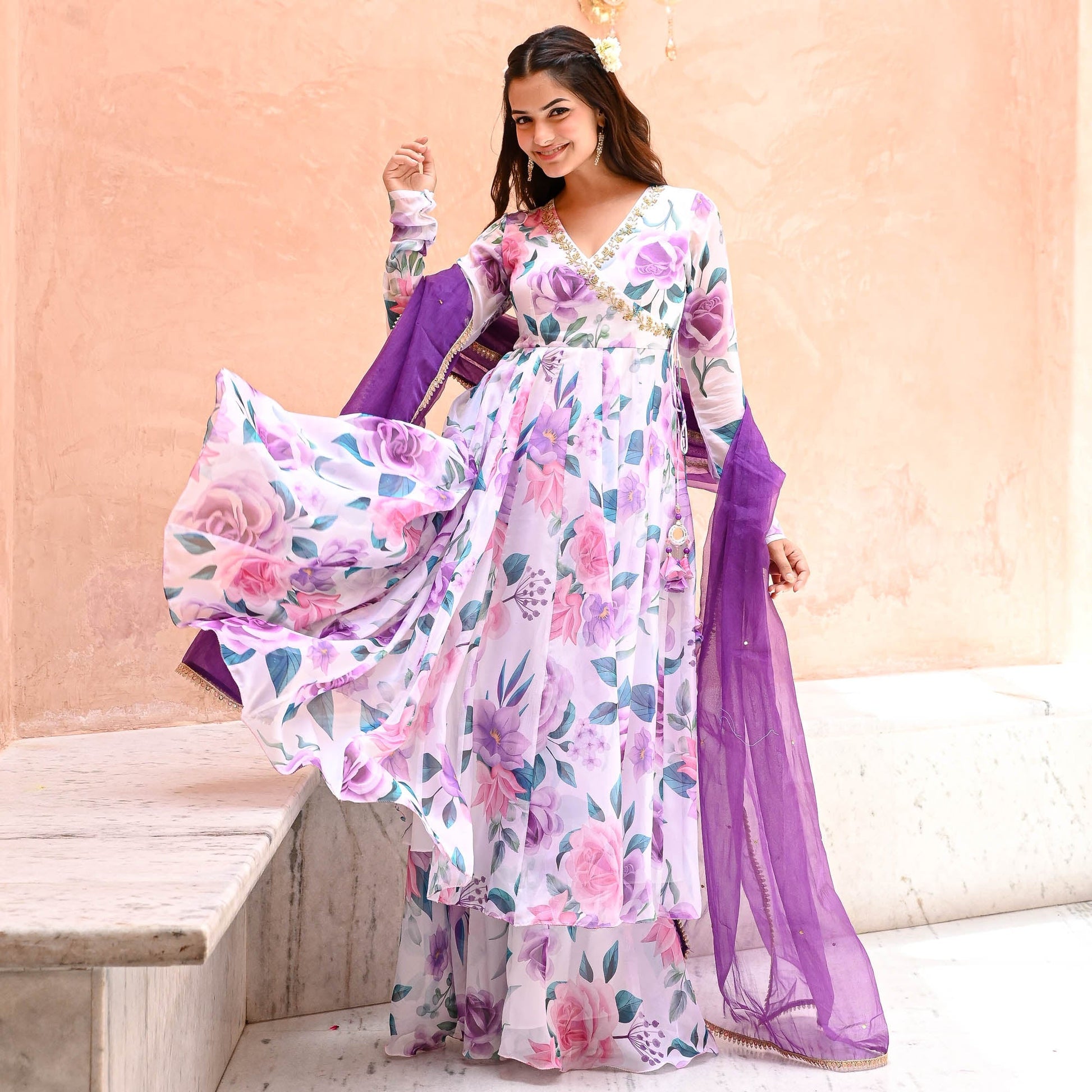Bagicha Suit Set showcases opulence in luxurious digitally printed vibrant white organza with lively floral prints. The Angrakha style flared kurta features an embellished V-neckline and elegantly bunched full sleeves. Paired with matching flared palazzo pants, the ensemble is completed by a purple organza dupatta adorned with intricate lace details, perfect for making a sophisticated statement.