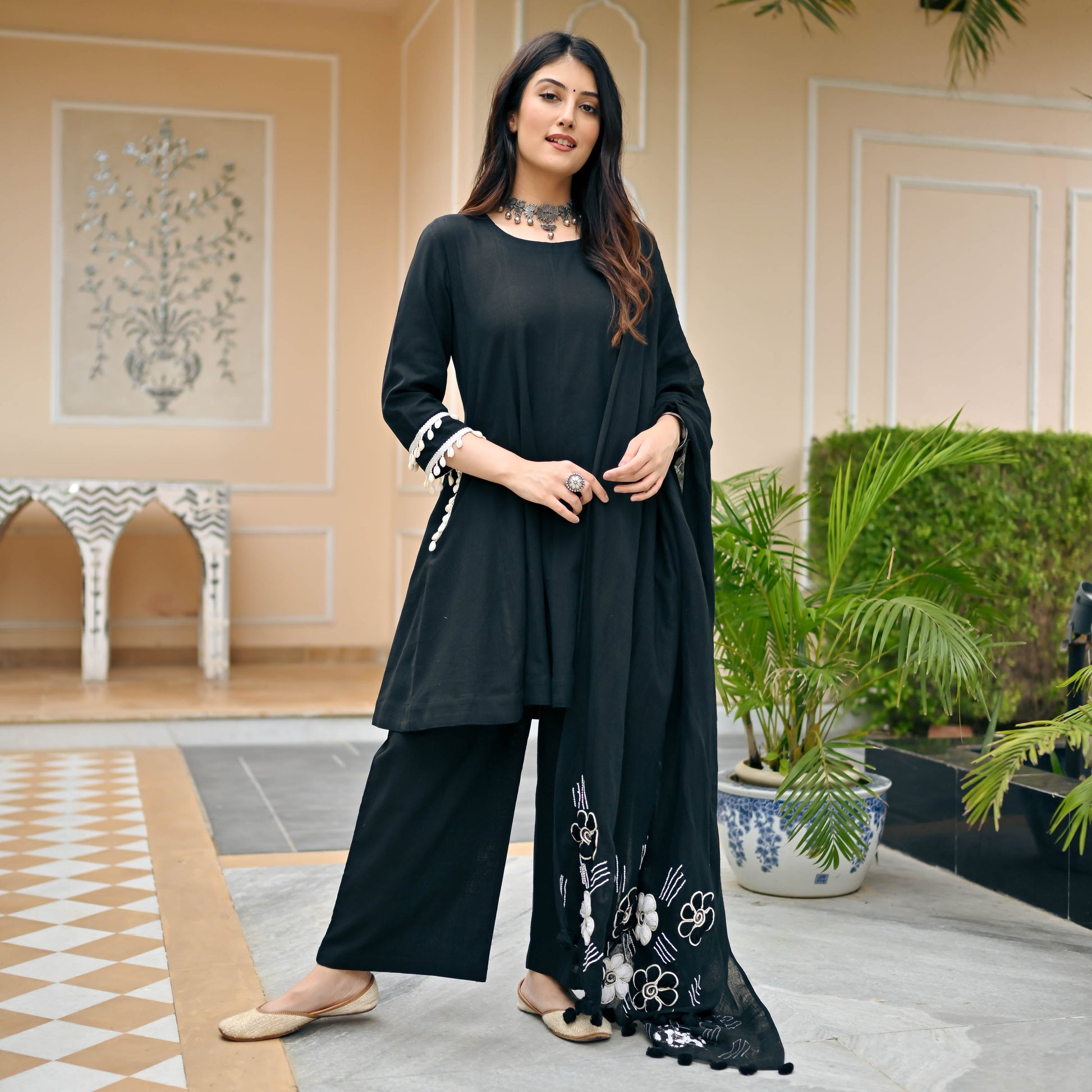 Indulge in the allure of understated glamour with our Black Noir Suit and Embroidered Dupatta. This exquisite ensemble, crafted from rich black cotton slub fabric, is a timeless expression of sophistication. The delicate white embroidery on the dupatta adds a touch of grace, making it the ideal accompaniment for any special occasion.