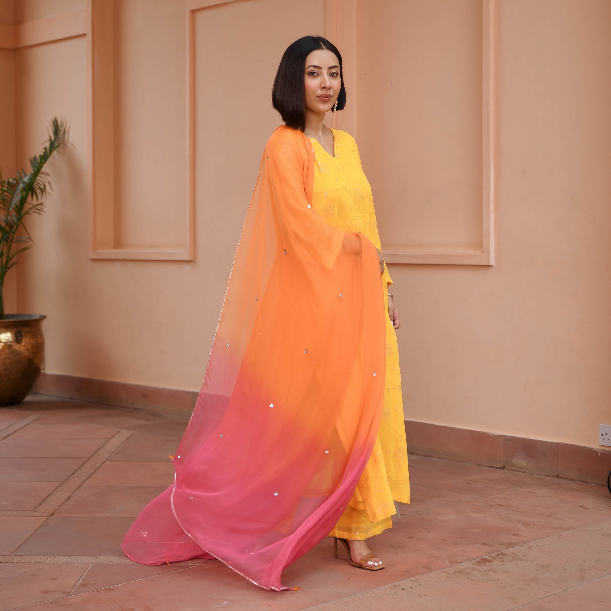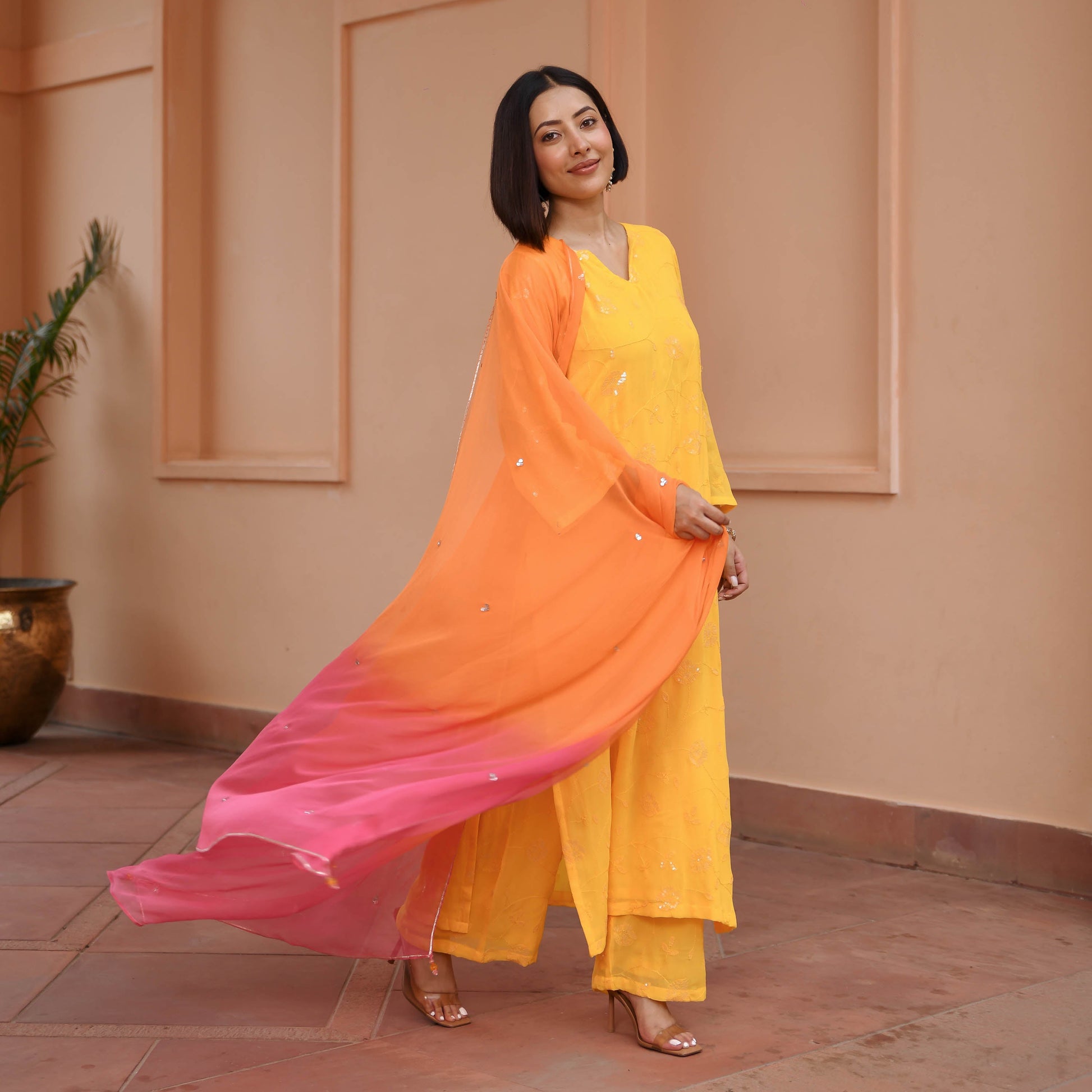 Brighten up your wardrobe with the Blossoms Georgette Embroidered Suit Set. This vivid yellow straight-fit kurta is fully adorned with sequin embroidery, featuring a round neck with a notch, a slightly loose fit, and three-quarter sleeves. Paired with matching pants and a contrasting ombre dupatta, this set combines dazzling details with modern elegance for any festive occasion.