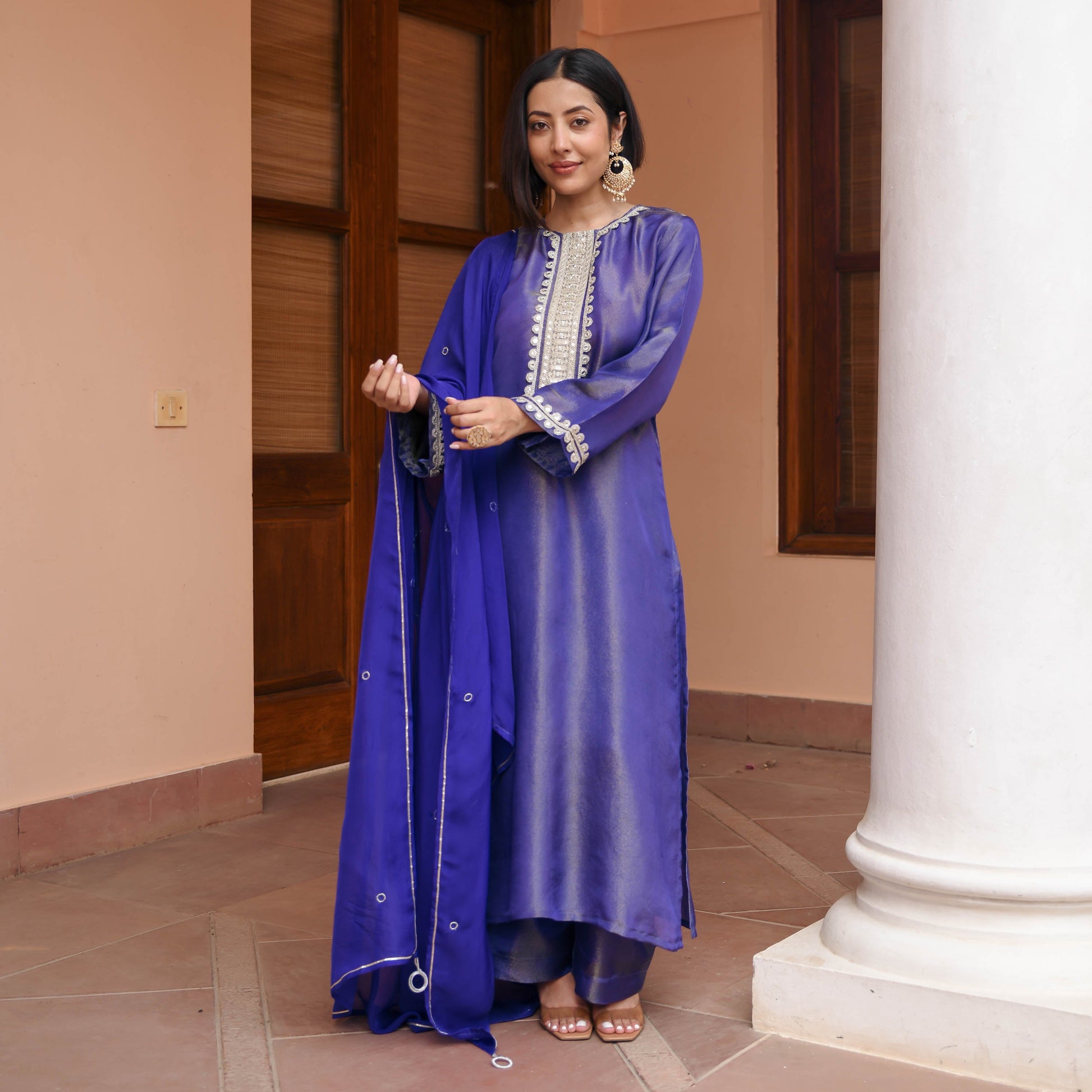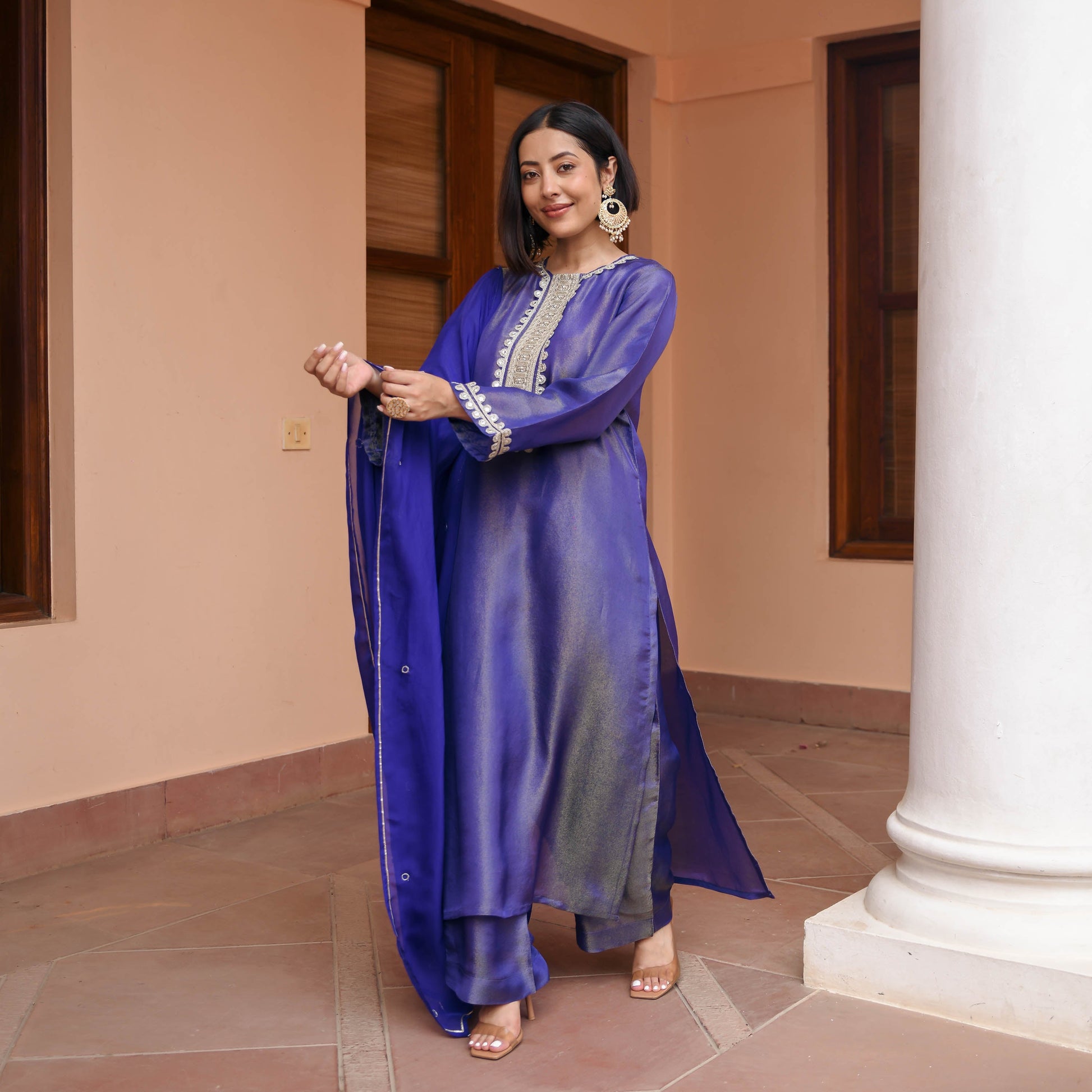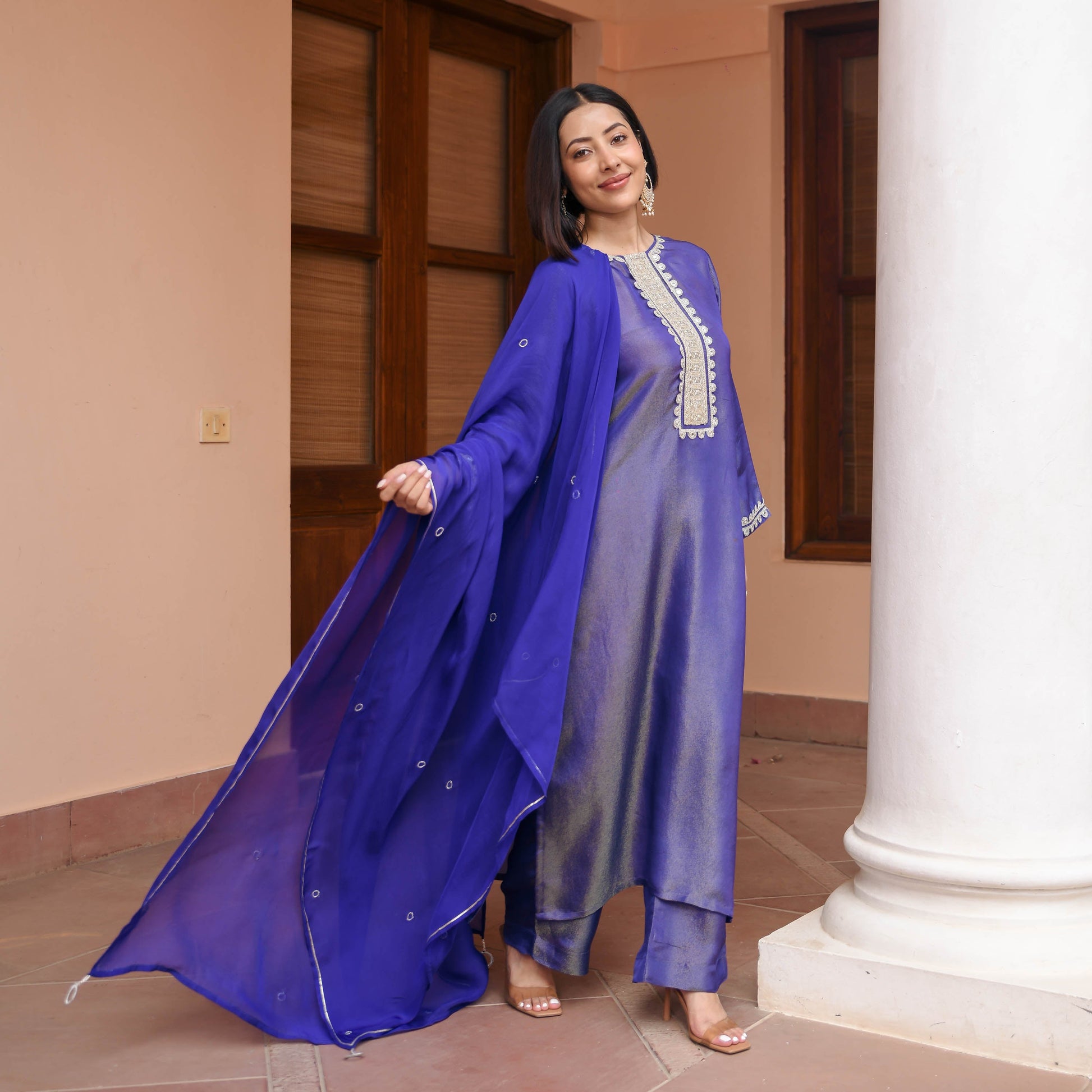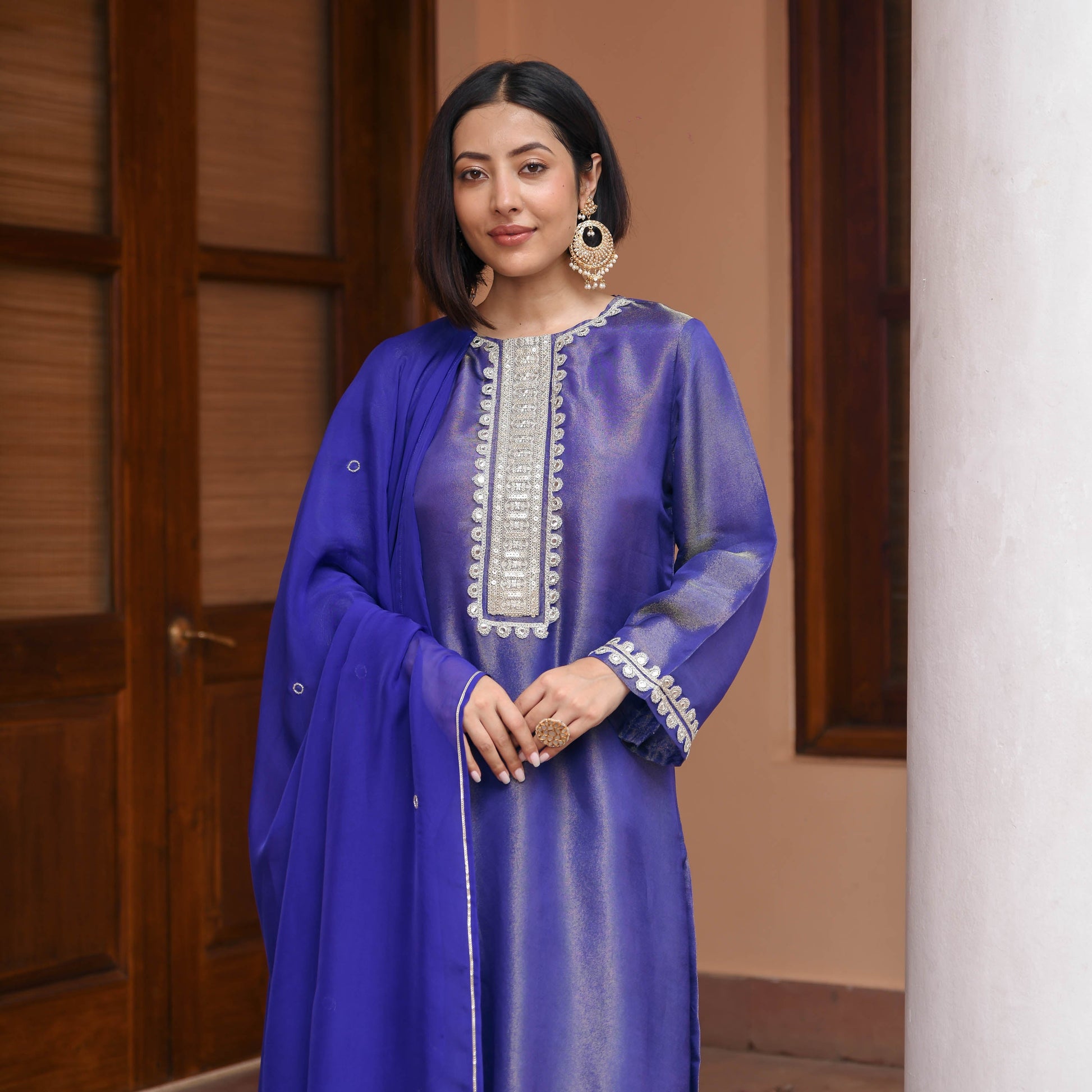 Elevate your style with the Blue Tissue Silk Suit Set. Featuring shimmering blue hues, this straight-fit kurta boasts gota and sequin detailing on the round neck and yoke. Complete with full sleeves, matching pants, and an embellished dupatta, it offers a blend of elegance and sparkle perfect for any occasion. Shine bright and make a statement!