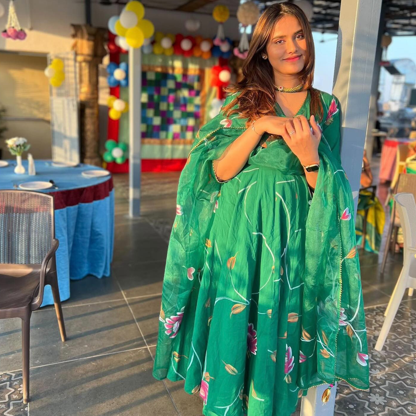 A gorgeous handpainted piece that's perfect for festive wear, this green suit set is made of cotton fabric. It features an elegant dupatta, a V-neckline and a beautiful floral design to complete the look. The perfect festive wear for this season!