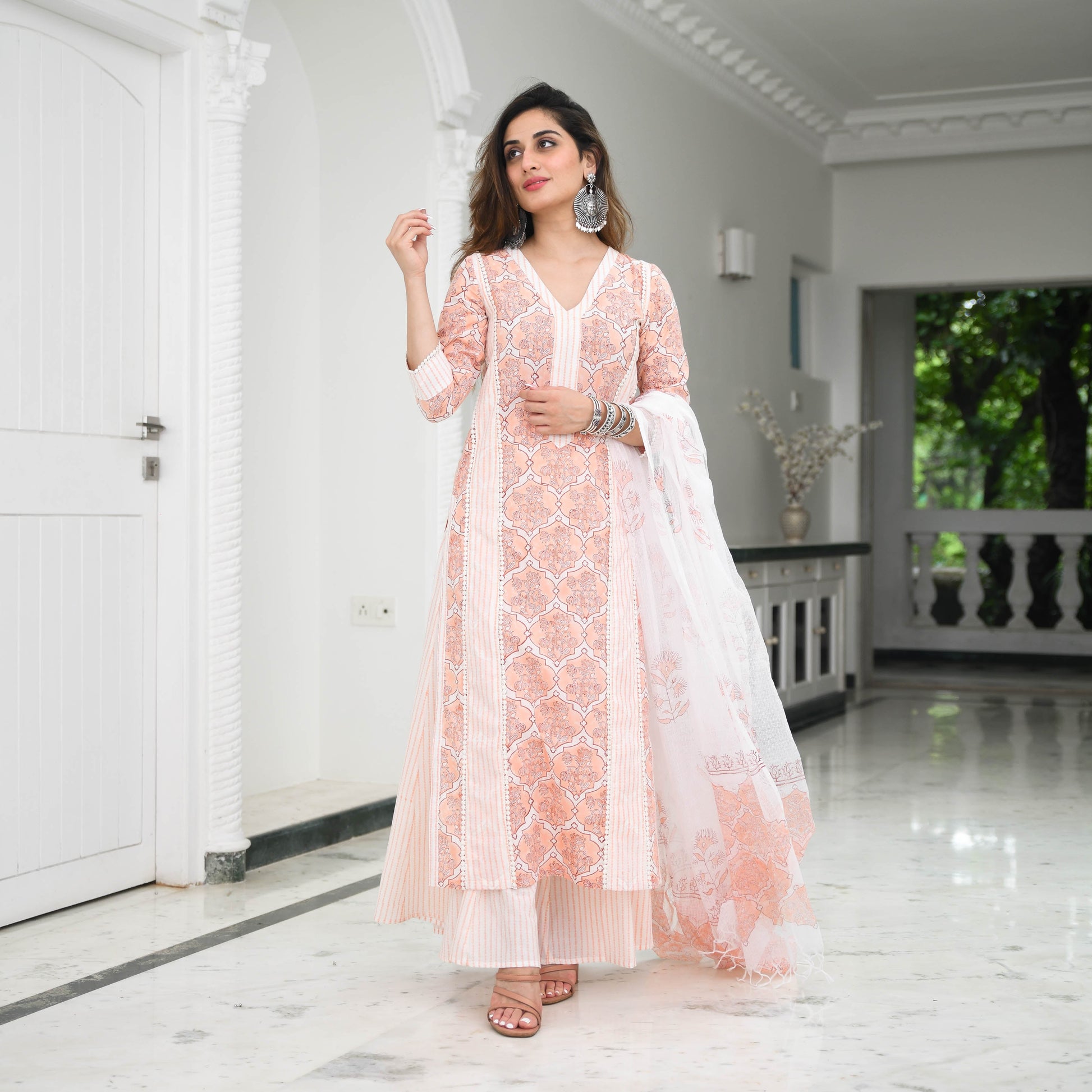 The suit of your dreams is right here! This peach and white suit set features a straight fit kurta with a stunning floral print, a pair of striped pants and a gorgeous dupatta. Pair it with some jhumkas and bangles and you’re ready to go!