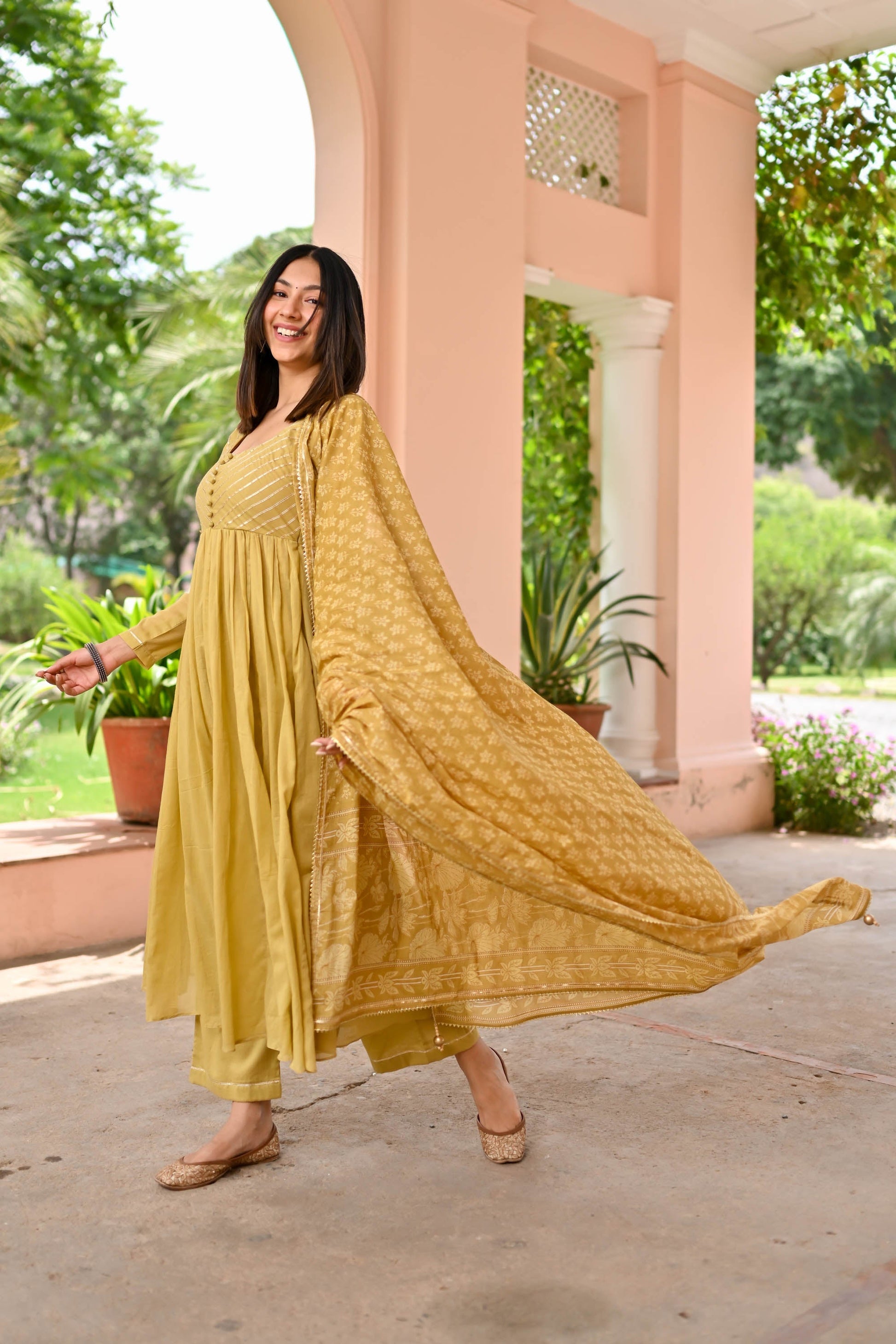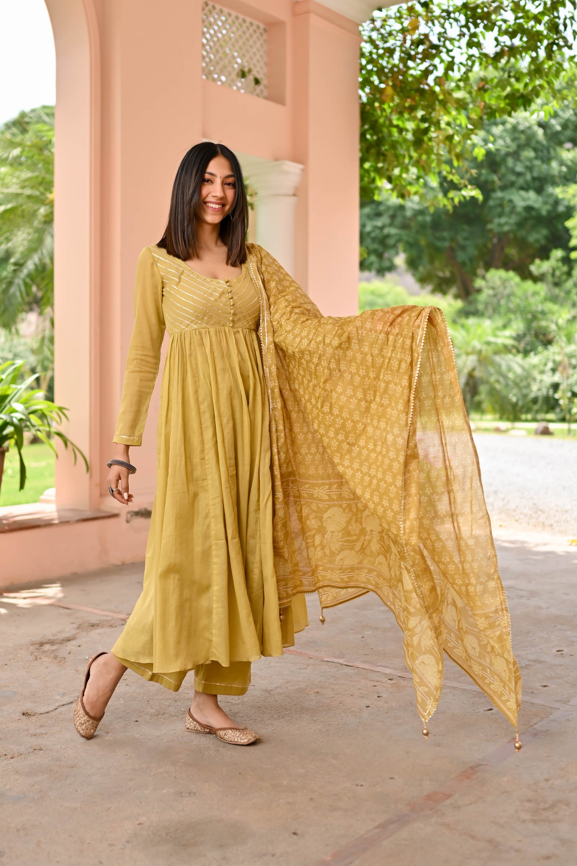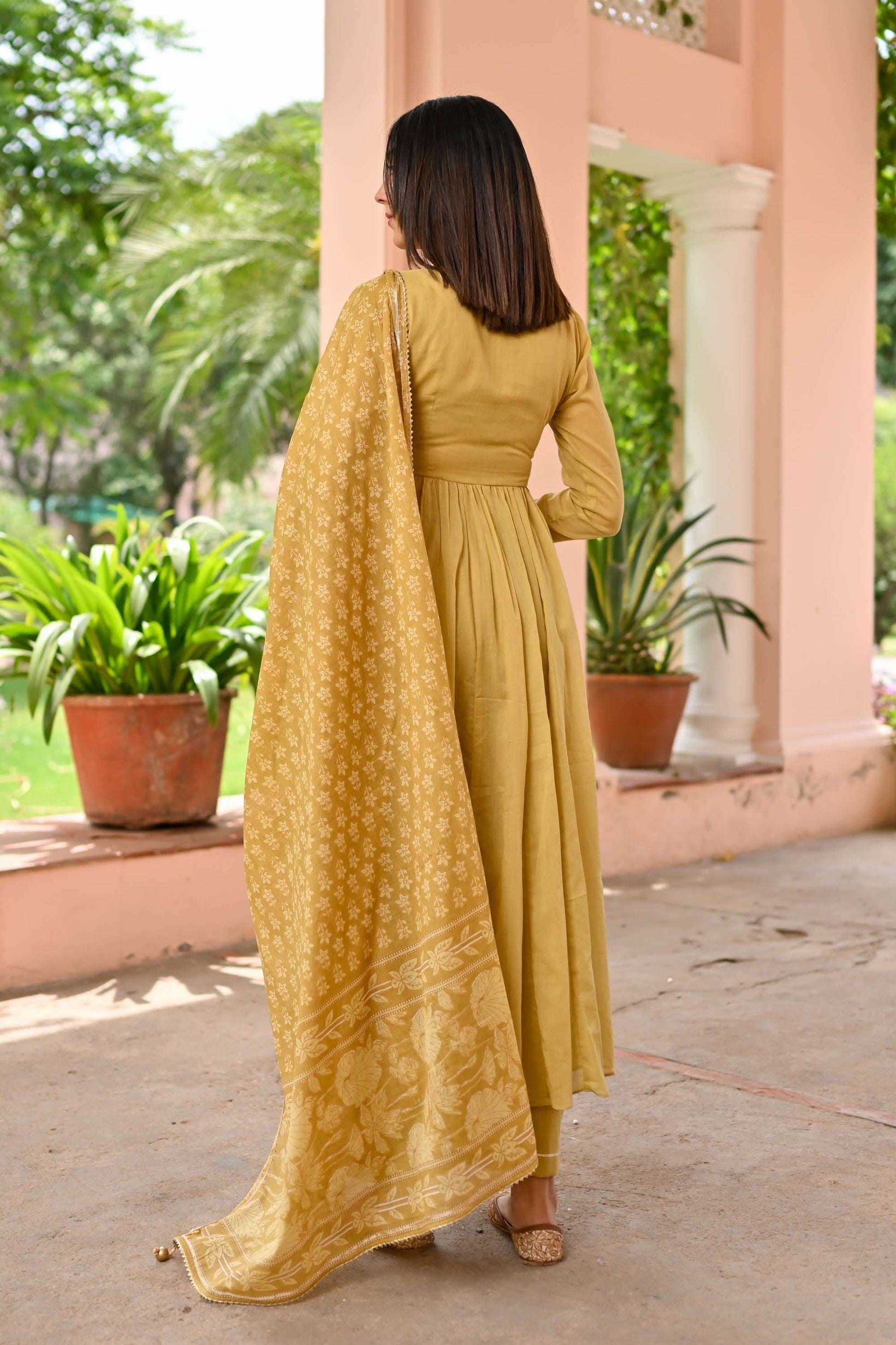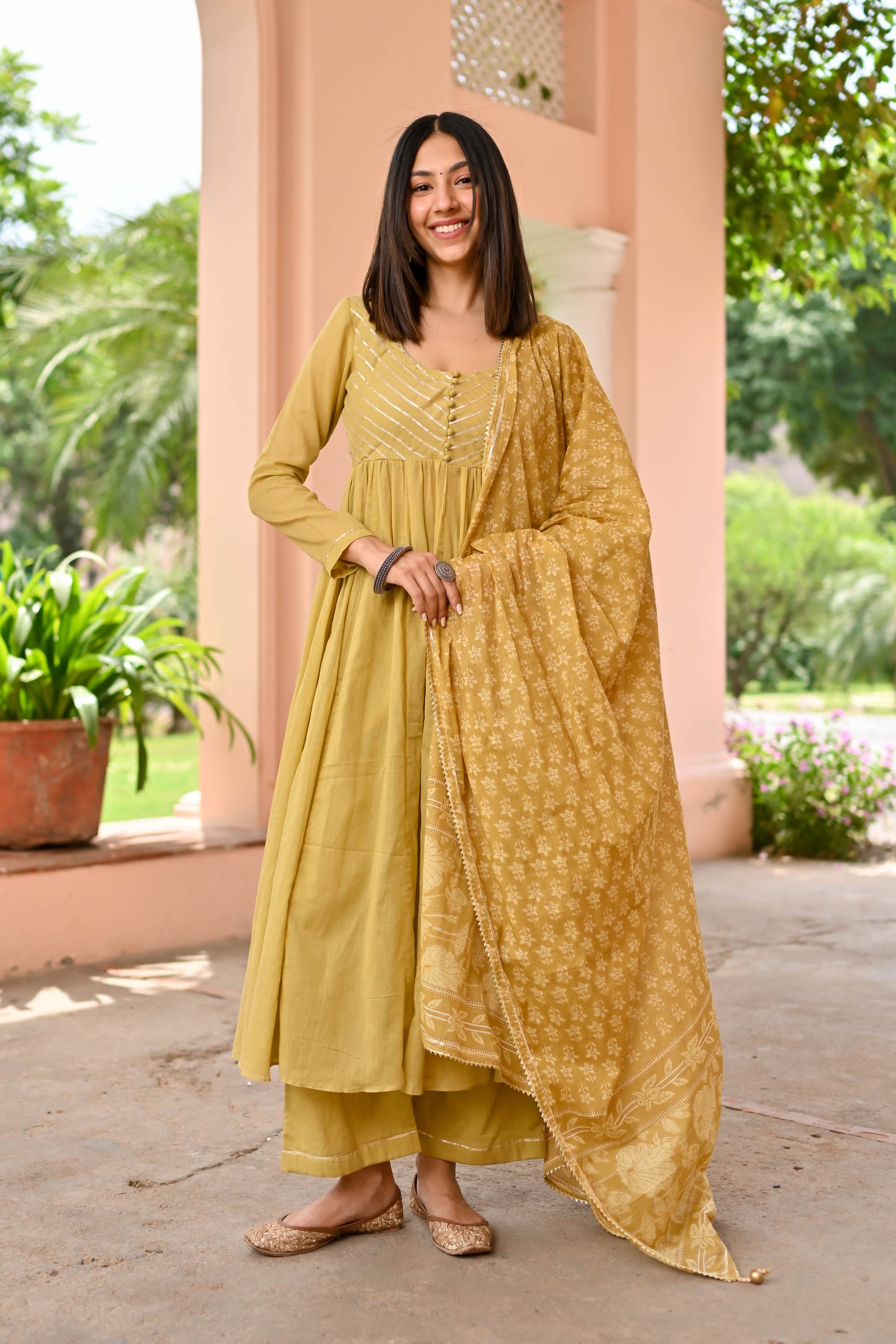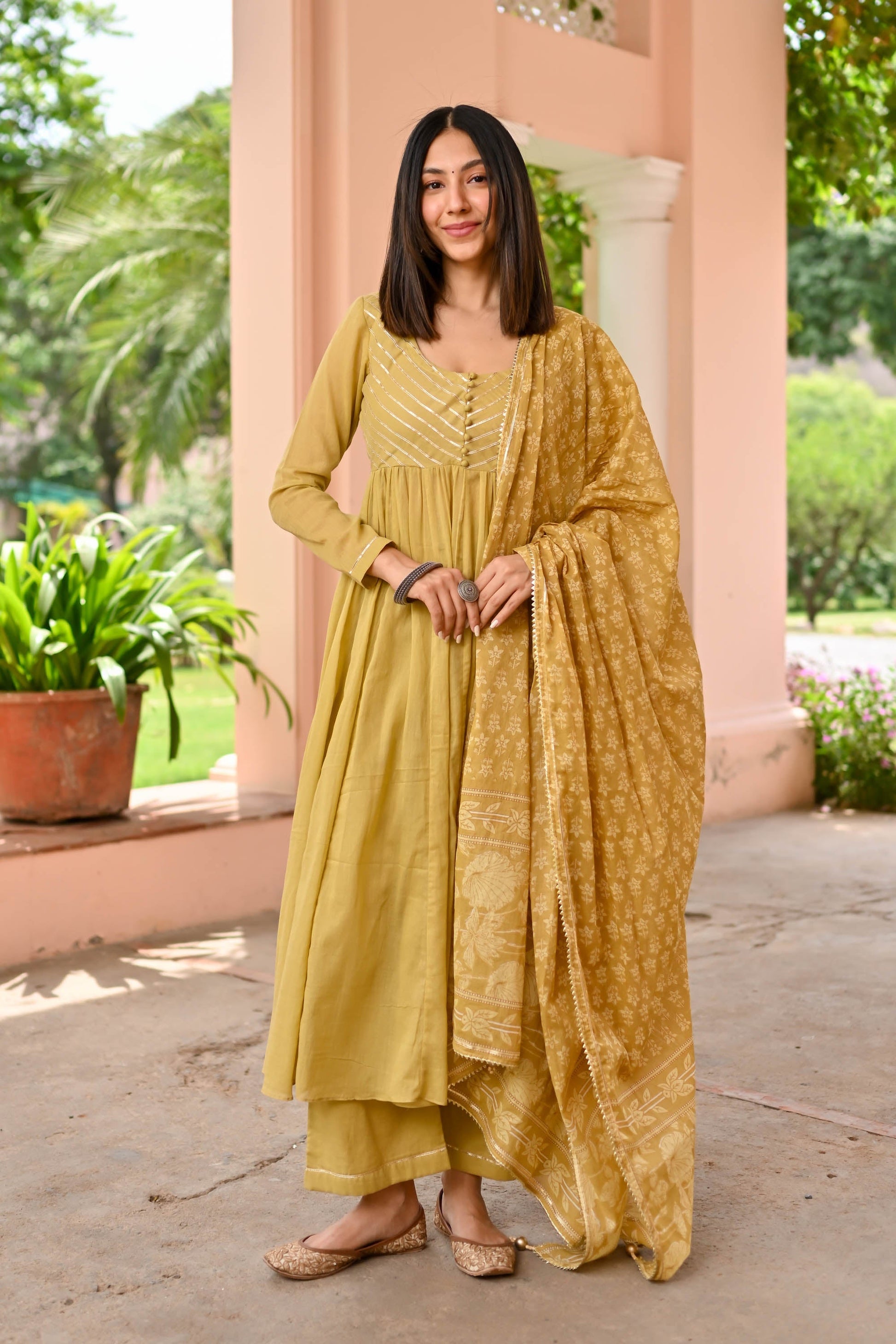 Boost your style game when you dress to perfection in our Mulmul Cotton Suit. Crafted from premium cotton, this Anarkali suit features solid kurta pants paired with a beautifully printed dupatta. Embrace comfort and style in ocher yellow hues, perfect for any occasion. Pakistani cotton suits for women exude timeless elegance and grace, offering unmatched breathability and sophistication. Discover the epitome of chic with our cotton Anarkali suit collection today.