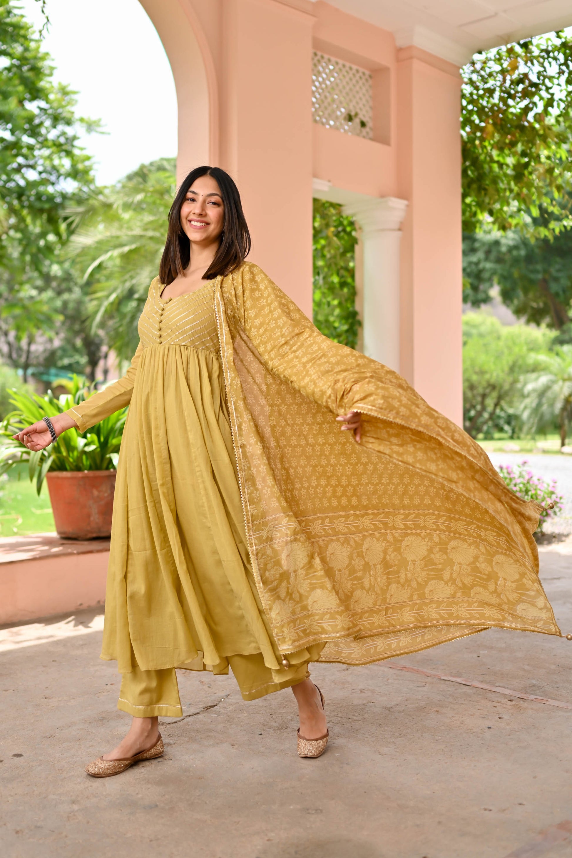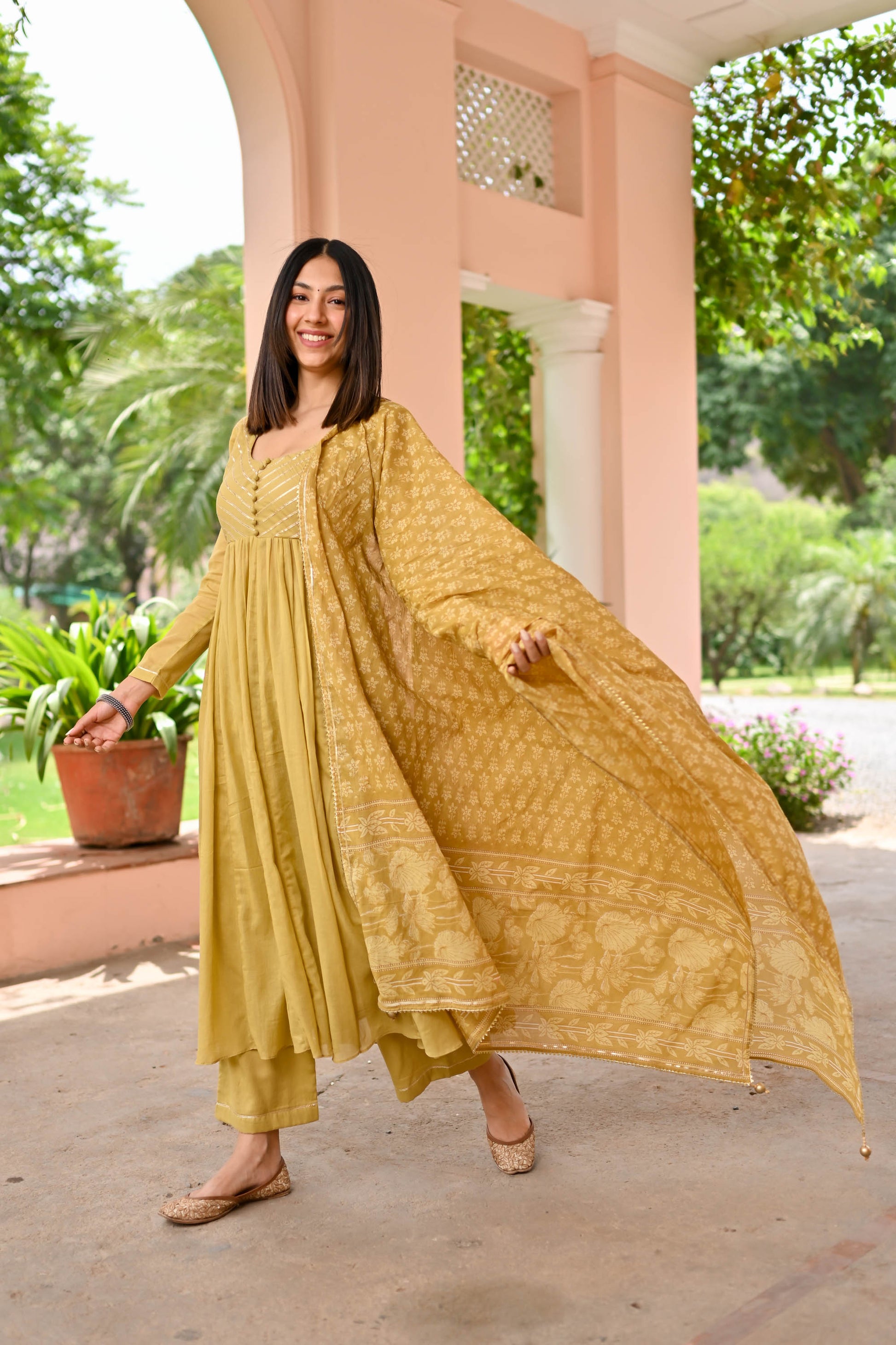 The Chahat Cotton Suit Set Trio is crafted from luxurious cotton in vibrant ocher yellow. It features a round neckline with gota lace detailing, poti buttons on the front yoke, three-quarter sleeves, and a flared hemline. Paired with matching pants and an ethnic motif printed dupatta, this ensemble offers a perfect blend of elegance and comfort for any occasion.