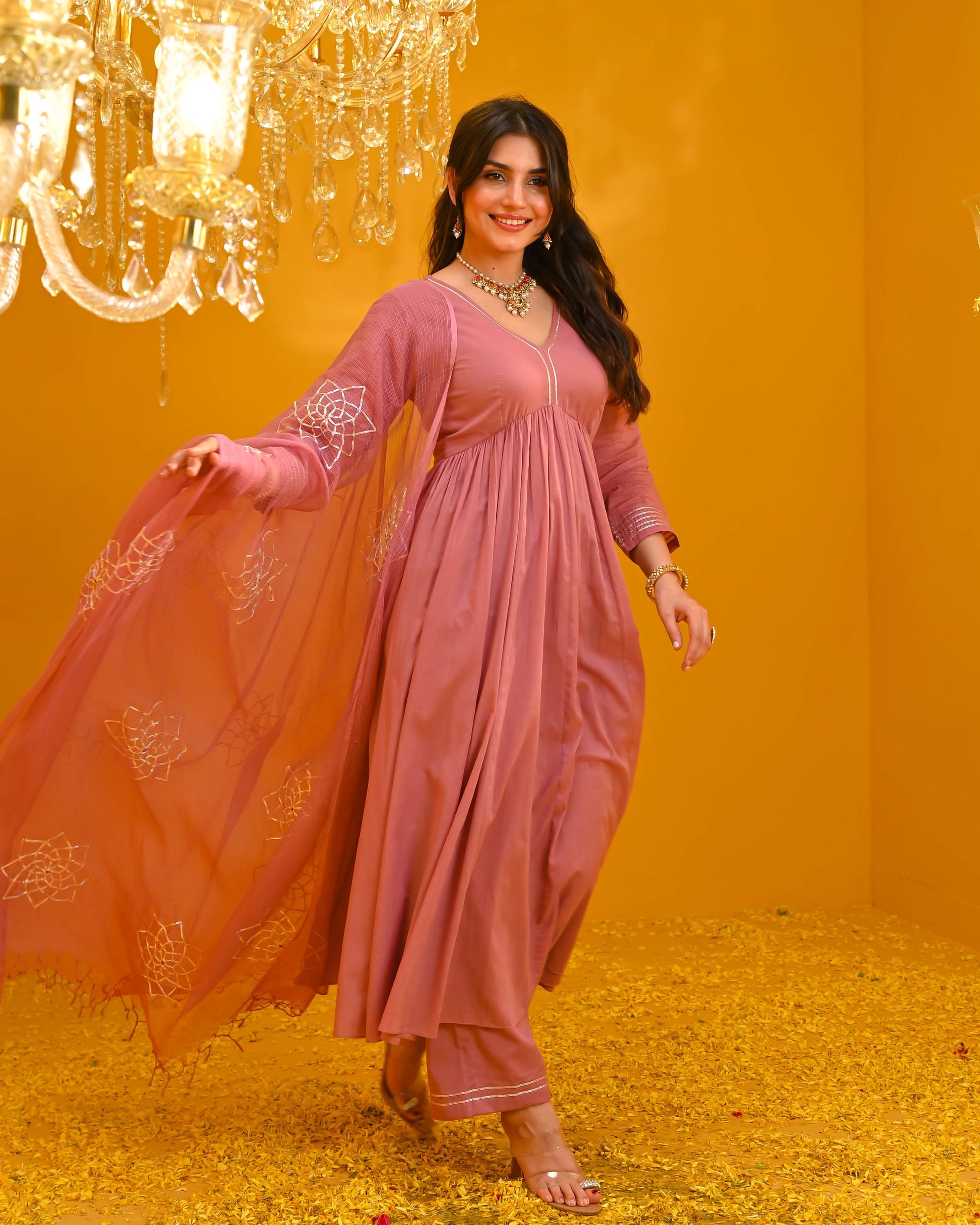Charvi Cotton Suit Set exudes elegance in a soft dusty pink hue, crafted from plush cotton for a comfortable fit. The flared Anarkali-style kurta features a V-neck adorned with delicate gota lace, while the matching pants provide a chic complement. The ensemble is beautifully completed with a Kota Doriya dupatta, featuring gota lace flower embroidery, perfect for any festive occasion.