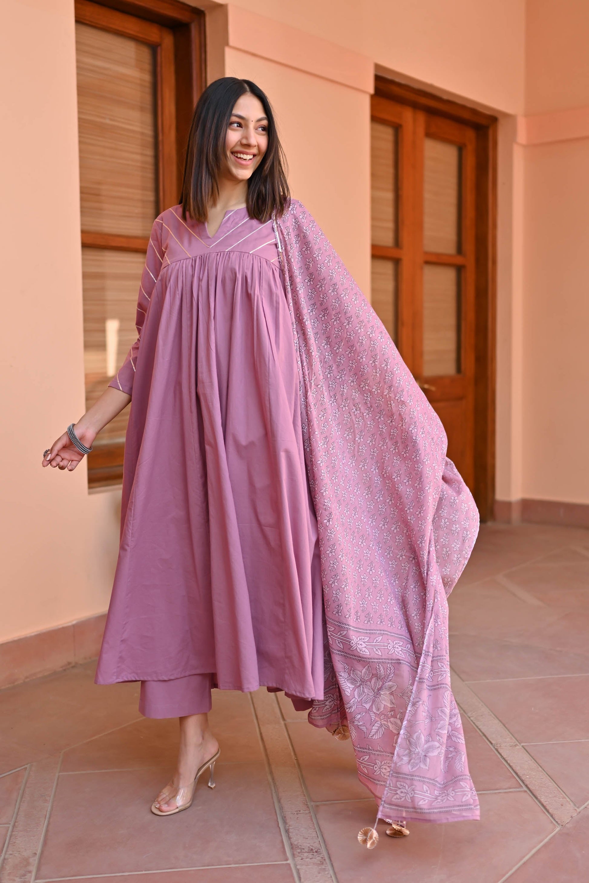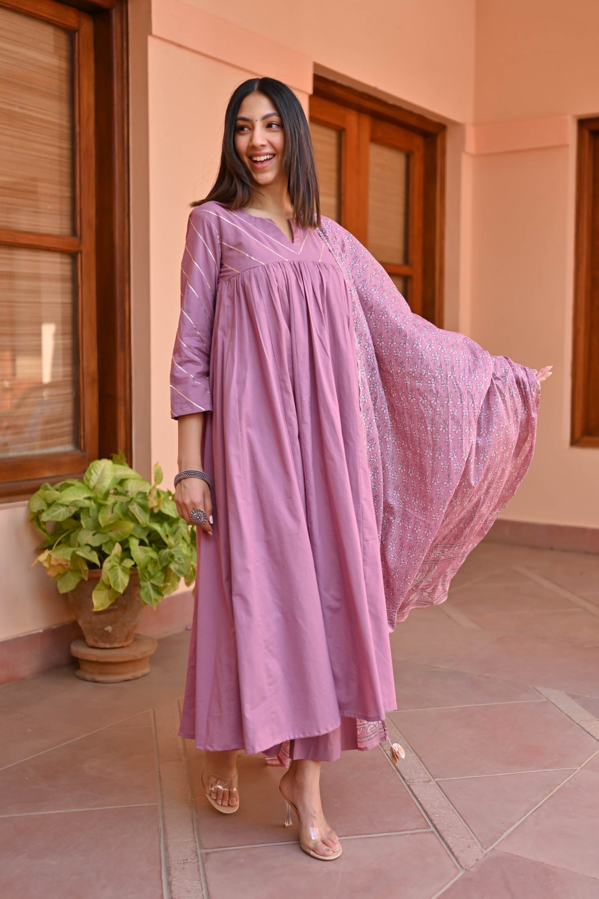 The Cotton Majesty Trio Suit Set epitomizes luxury and elegance. Crafted from premium cotton in a dusty purplish-pink hue, the relaxed fit kurta features a round neck with a notch, gota lace detailing on the yoke, and three-quarter sleeves. Paired with matching pants and a printed dupatta adorned with pompom lace edges, it offers a perfect blend of sophistication and style.