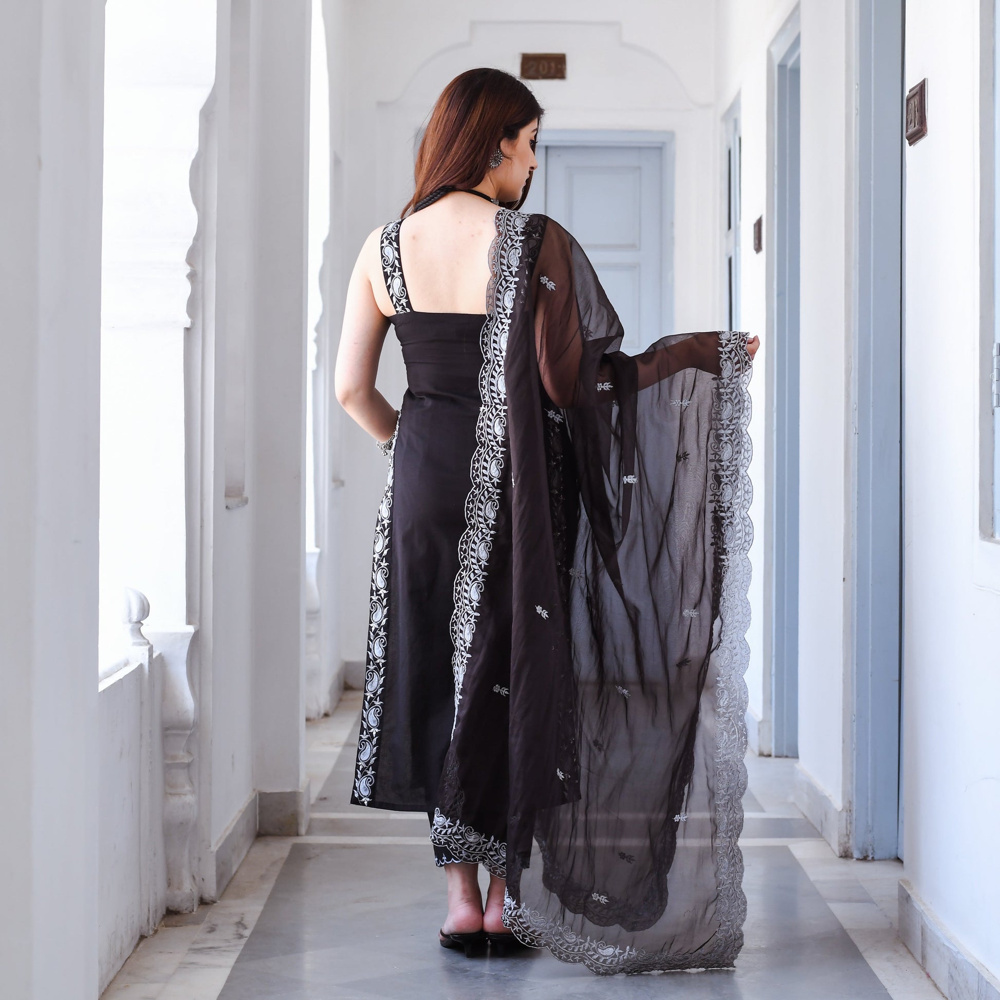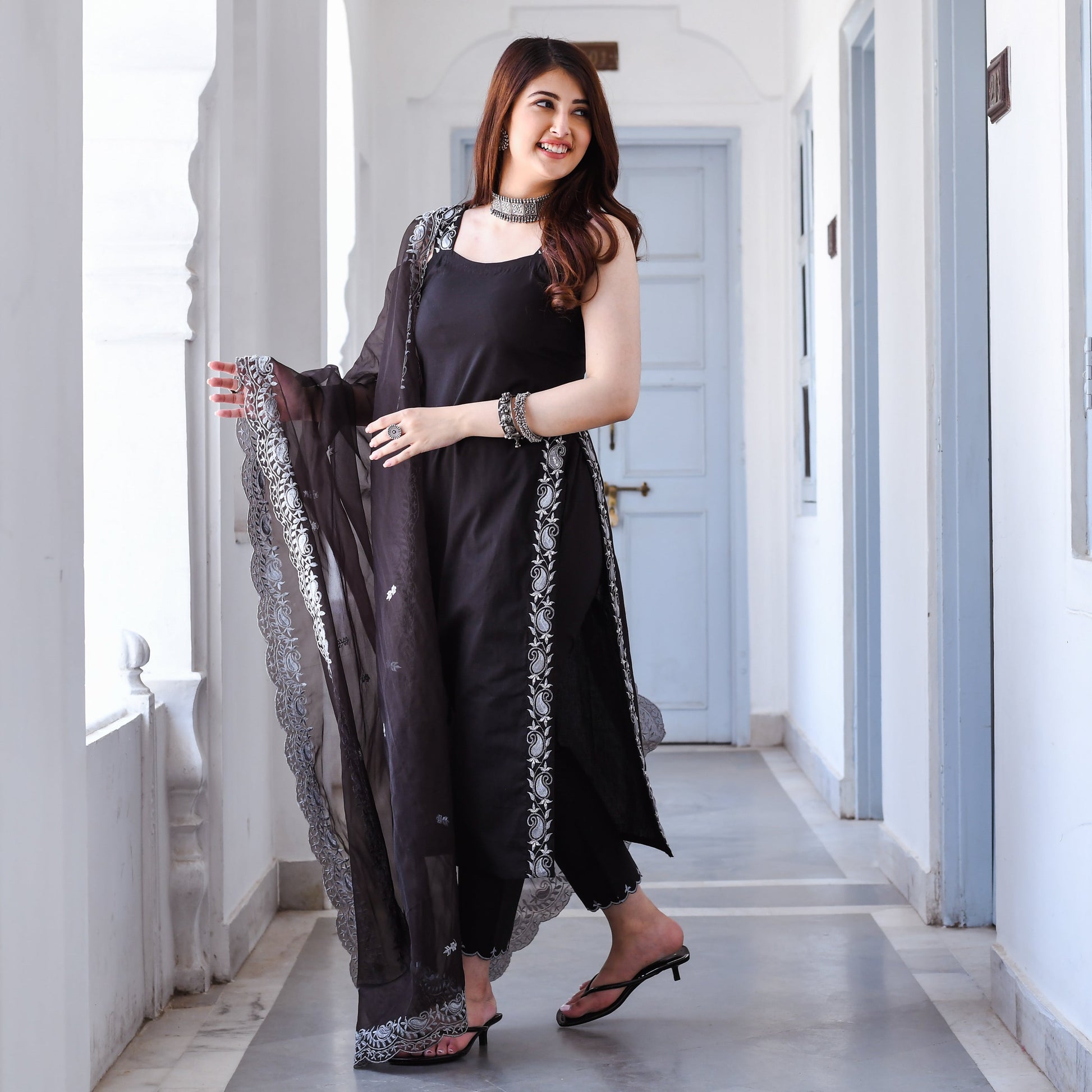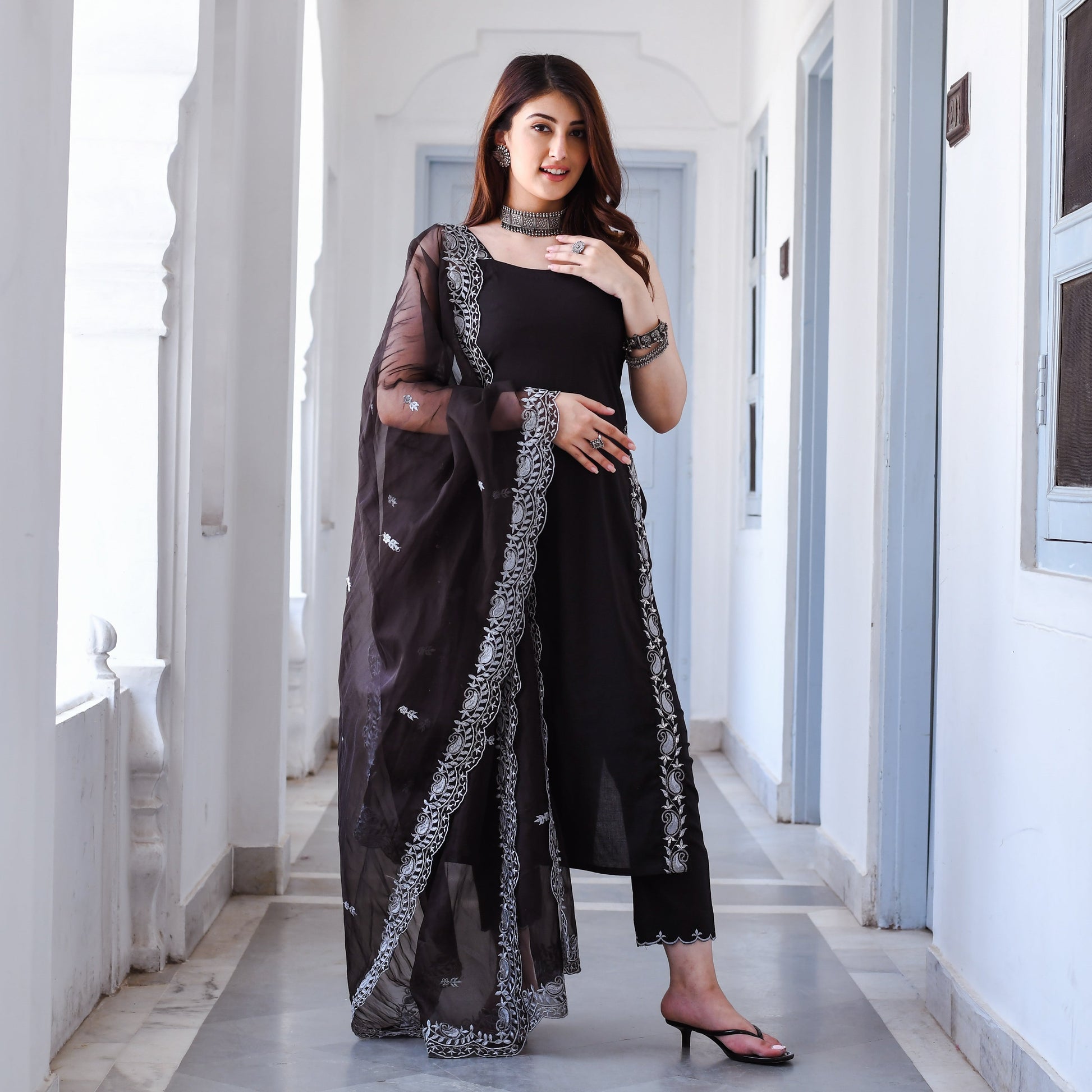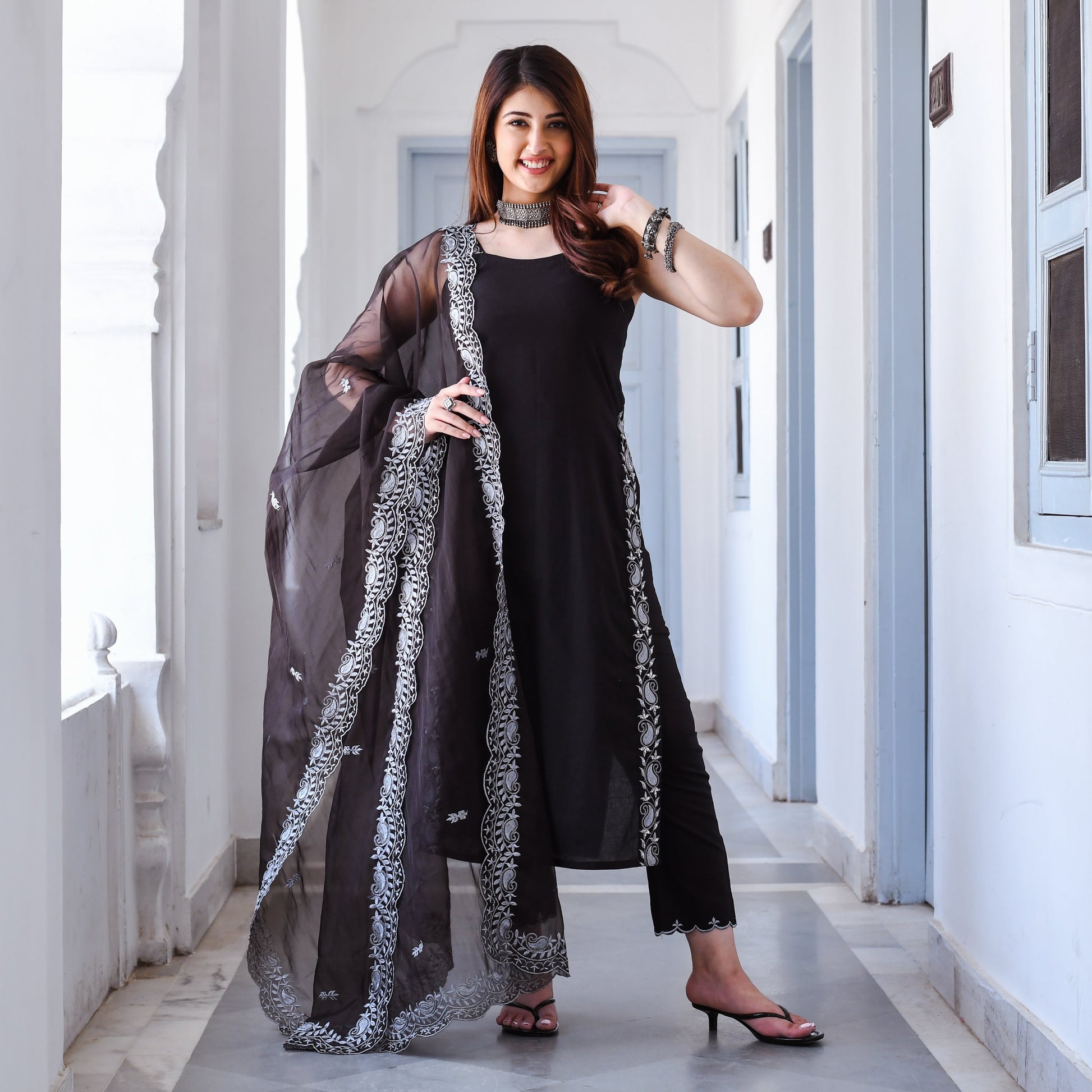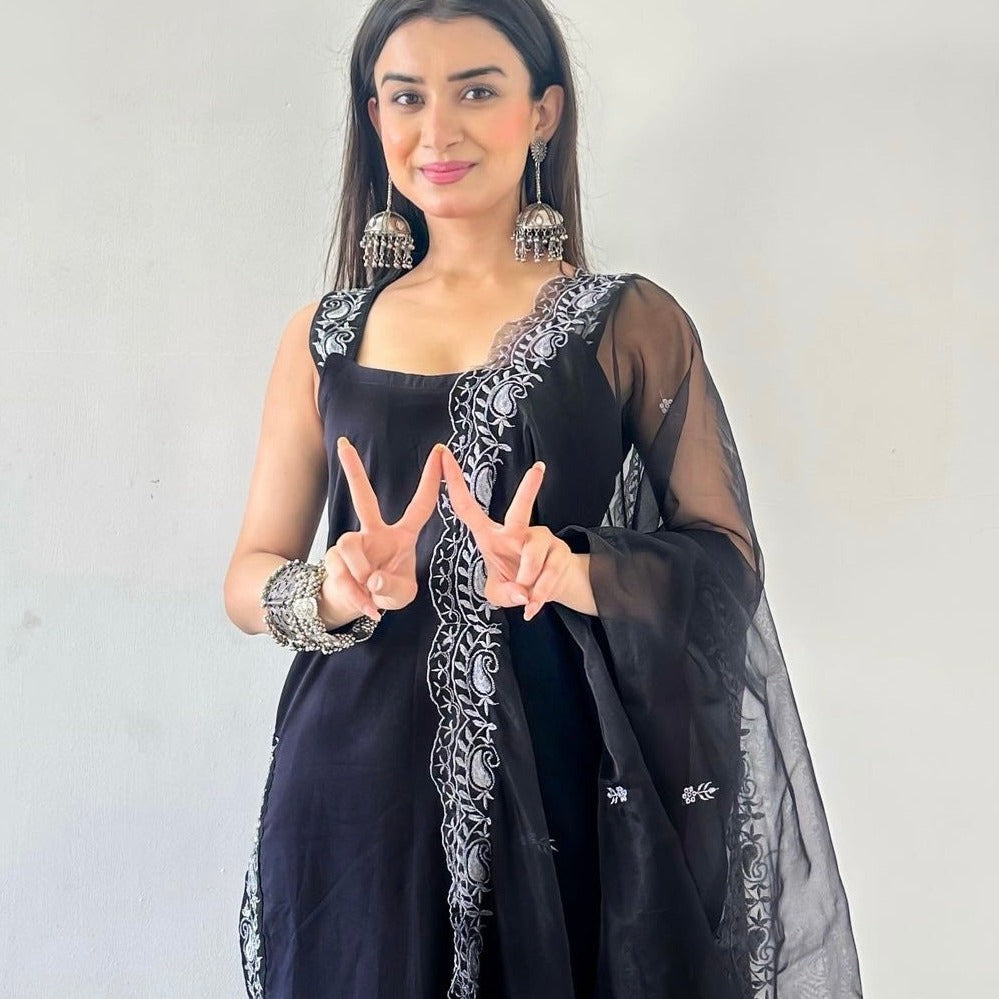 You can never go wrong with the timeless combo of black and white. This Dasya Suit Set is crafted from premium cotton fabric and features a soft and comfortable texture, making it perfect for all-day wear. The straight-cut Suit has a timeless and versatile design, making it suitable for a range of special occasions. The Suit Set is enhanced by a stunning white threadwork border and strap that adds a touch of sophistication to the overall look. Make this Dasya Suit Set yours and you’ll never go out of style!