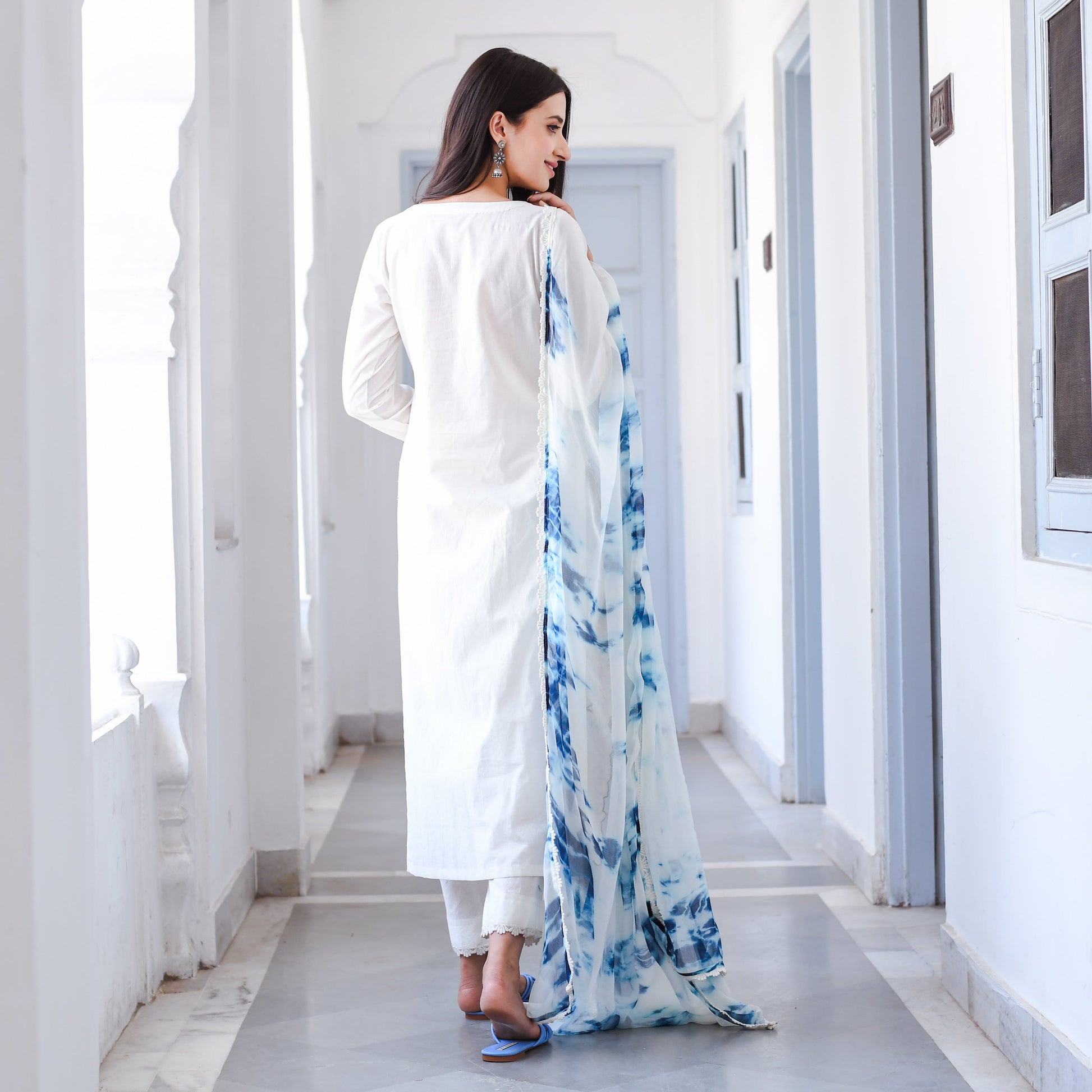 Step up your style game with this beautiful Debashree Suit Set. The Suit Set features a classic straight-cut silhouette with a blue floral embroidery border that adds a touch of elegance to the outfit and contrasts beautifully against the pristine white fabric. The Set also includes a matching pair of comfortable white pants that complete the ensemble. The dupatta accompanying the Set features a beautiful blue and white tie-dye pattern that adds a fun and playful element to the overall look. This Suit Set is a must-have addition to your ethnic collection.