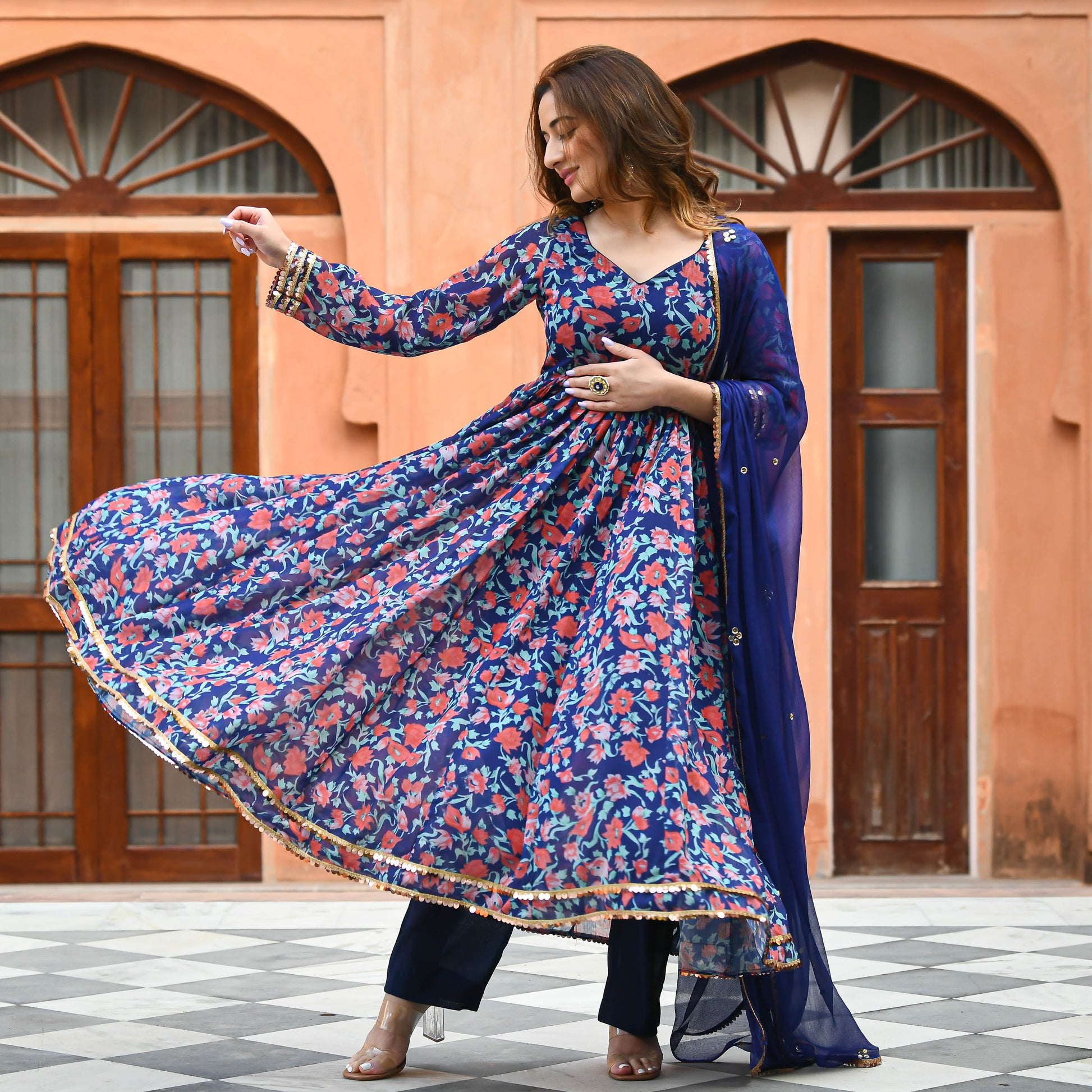 Ready to make a statement they'll never forget? Try our Royal Blue Floral Anarkali Set. We cannot decide if we love the enchanting floral print or the stunning sequin details on the hem more. Get it now and elevate your wardrobe.