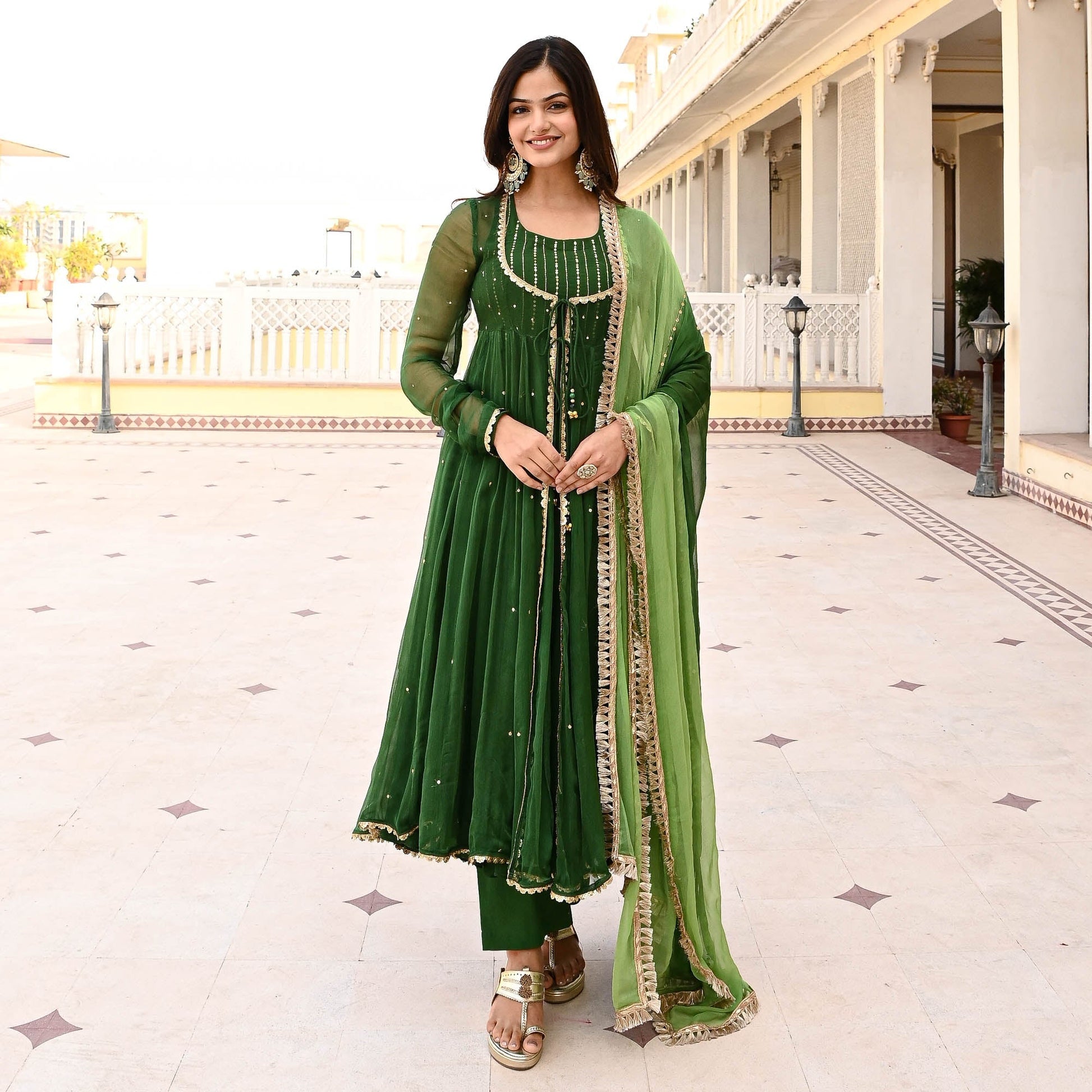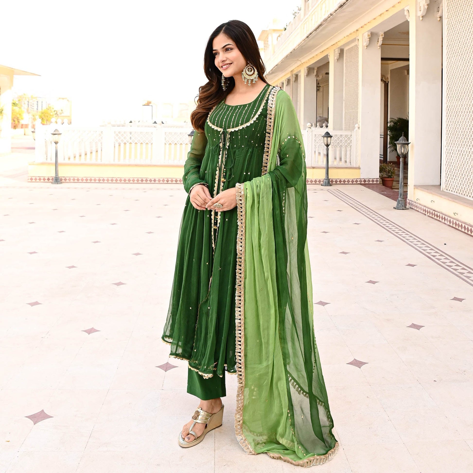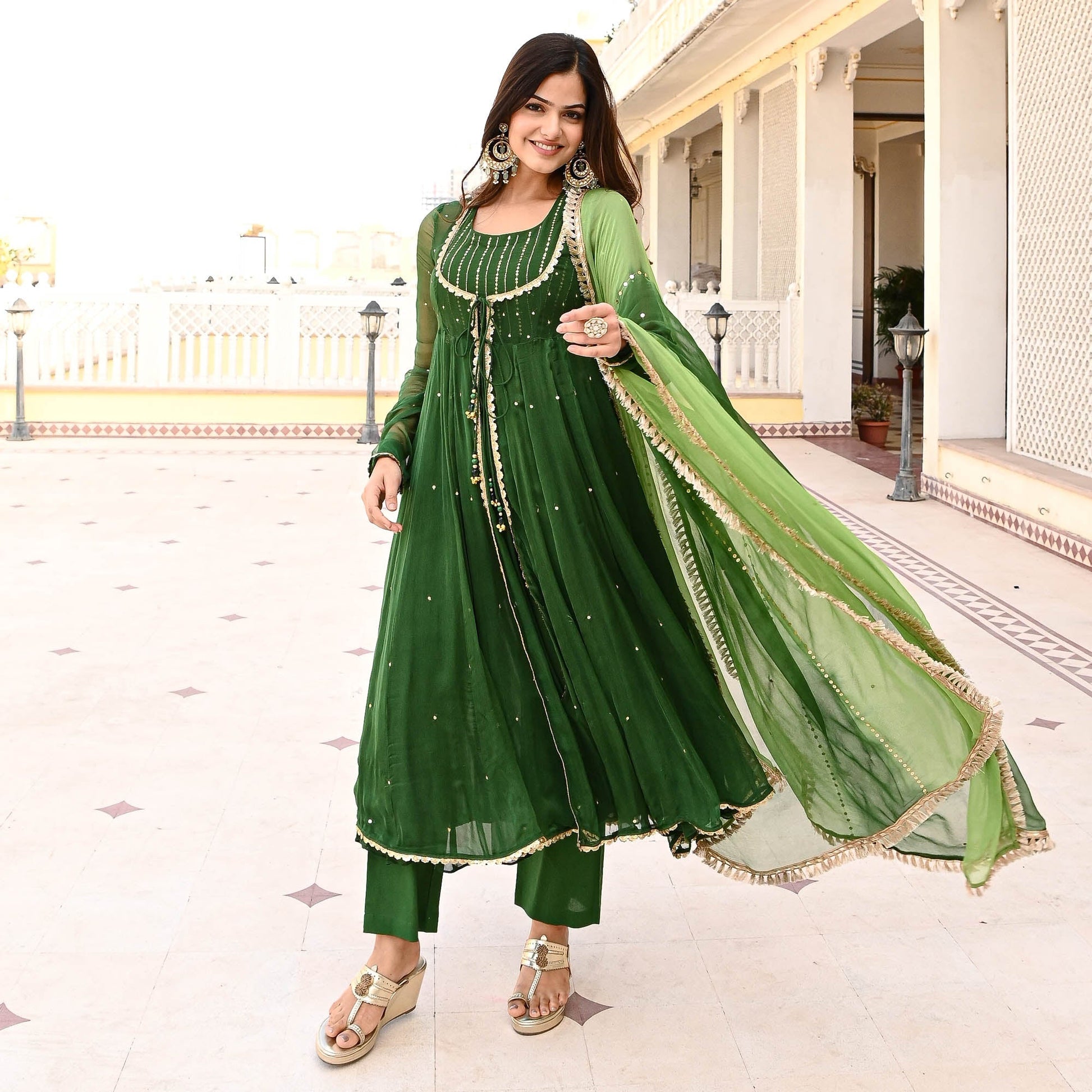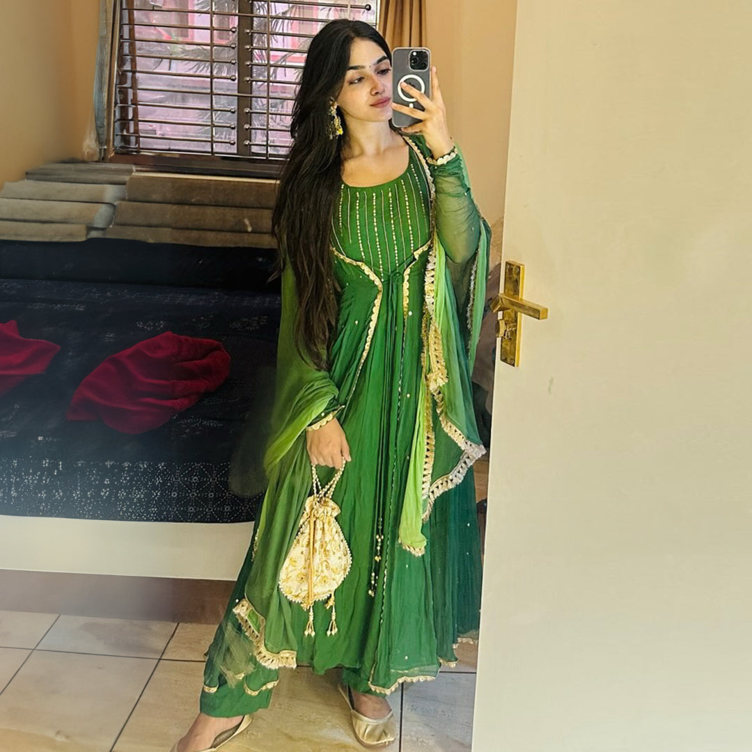 Elevate your ethnic wear collection with the Deewant Suit Set from Sakhi Fashions, where every piece tells a story of timeless beauty and contemporary allure. Redefine your style, redefine elegance, and embrace the essence of femininity with confidence and grace. Drenched in the deep and rich hues of emerald green, the sheer shrug is embellished with sequin and paired with dori and tassel details. Crafted from premium quality fabric, the Suit Set drapes effortlessly, accentuating your silhouette with grace and poise. Paired with an embellished inner, pants, and an ombre dupatta with fringe lace on the edges. Revel in the luxury of wearing an ensemble that not only celebrates heritage but also embraces contemporary sophistication.