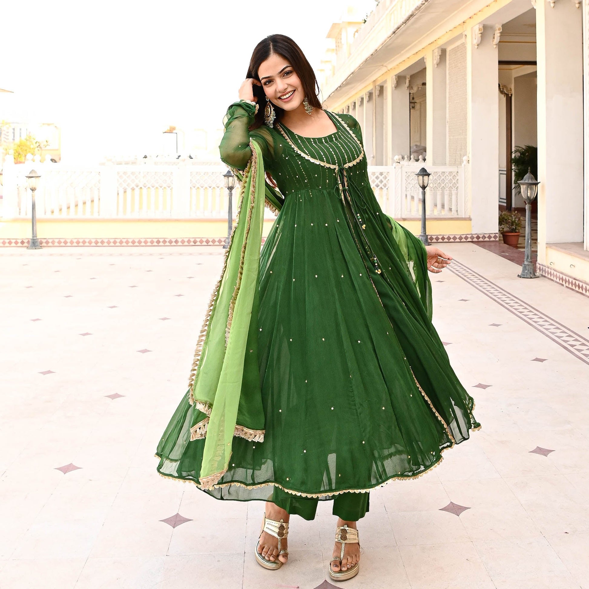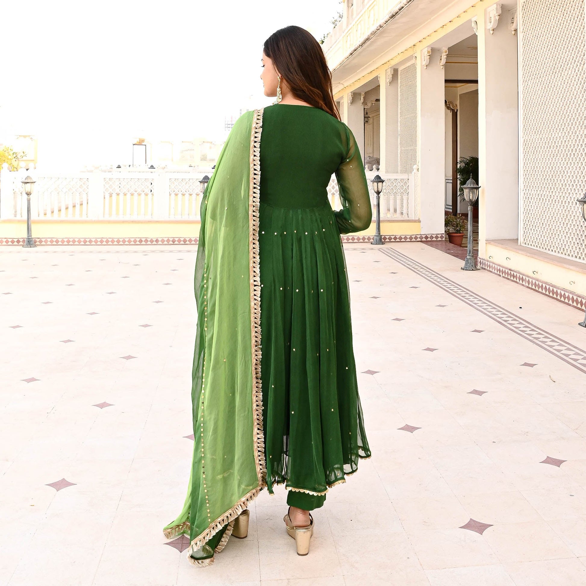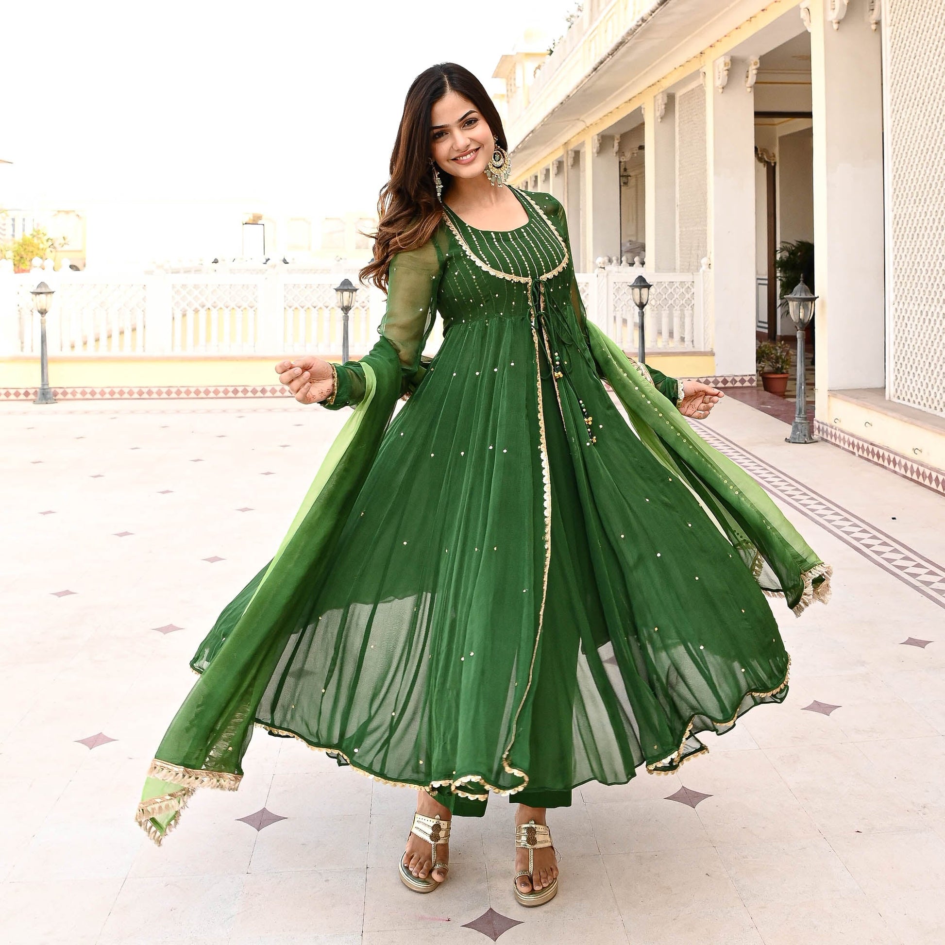 Elevate your ethnic wear collection with the Deewant Suit Set from Sakhi Fashions, where every piece tells a story of timeless beauty and contemporary allure. Redefine your style, redefine elegance, and embrace the essence of femininity with confidence and grace. Drenched in the deep and rich hues of emerald green, the sheer shrug is embellished with sequin and paired with dori and tassel details. Crafted from premium quality fabric, the Suit Set drapes effortlessly, accentuating your silhouette with grace and poise. Paired with an embellished inner, pants, and an ombre dupatta with fringe lace on the edges. Revel in the luxury of wearing an ensemble that not only celebrates heritage but also embraces contemporary sophistication.