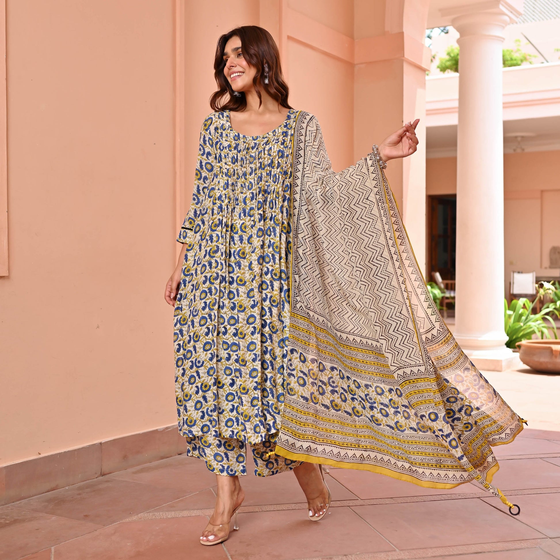 Discover effortless elegance with the Dreams Handblock Suit Set, crafted from luxurious plush cotton silk fabric. The beige-yellow A-line kurta features beautiful handblock prints and pink tuck details on the front yoke, complemented by three-quarter sleeves for a sophisticated look. Paired with matching pants and a contrasting printed dupatta, this ensemble effortlessly blends style and comfort for any occasion.