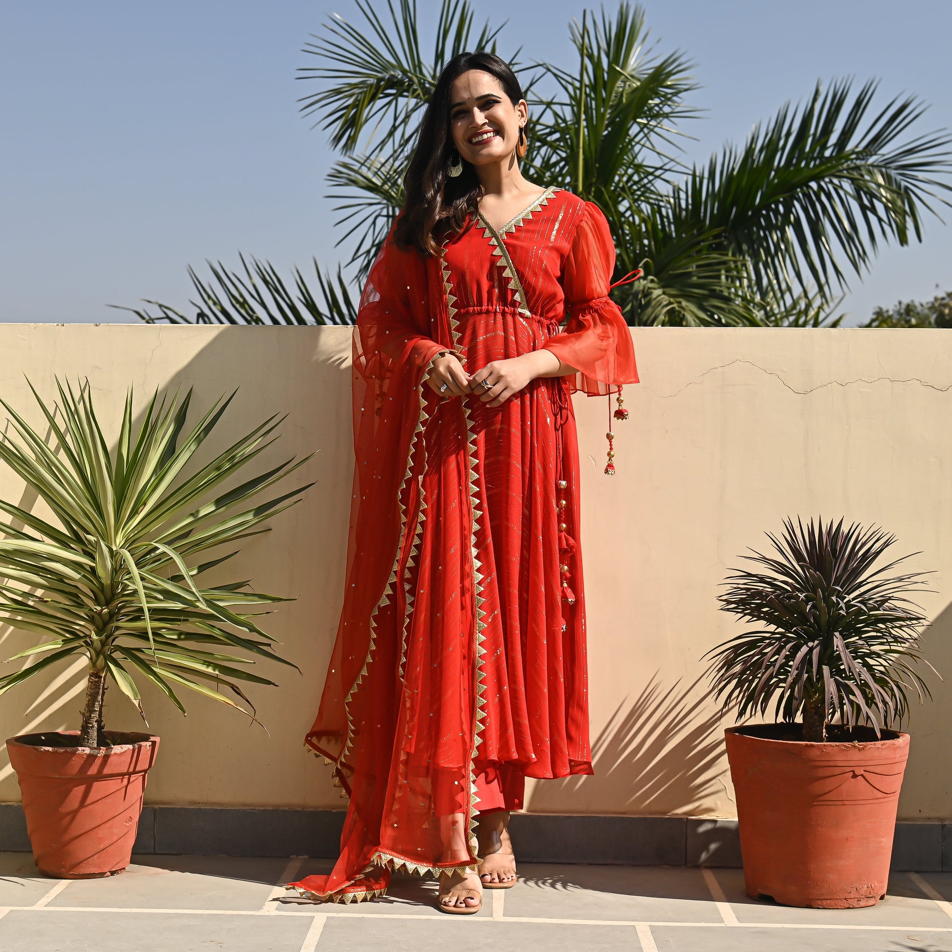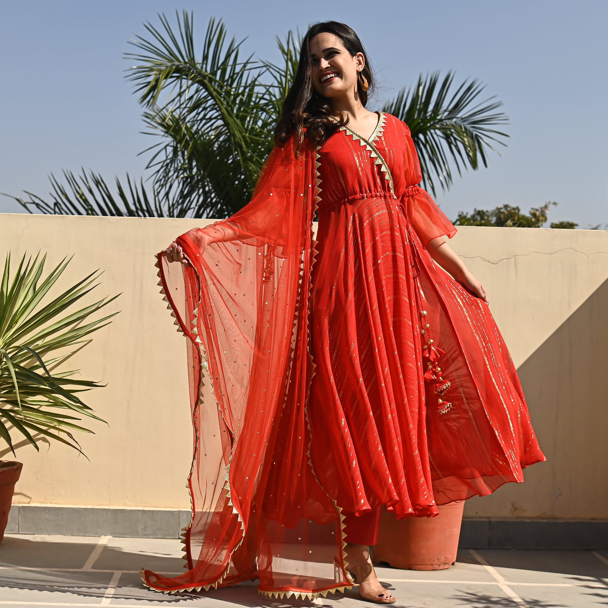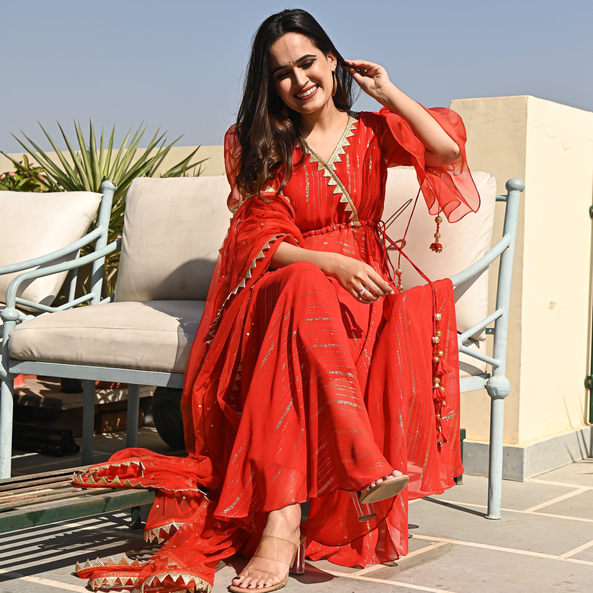 Our Eliza Suit Set is a stylish and elegant traditional outfit that features an exquisite Anarkali-style top, straight bottoms and matching dupatta. The Suit Set features a beautiful red colour with intricate gotta details on the bodice and a flattering surplice neckline. This set features Lurex threadwork that shimmers and shines in the light, creating a bold and eye-catching effect. Overall, this Set is perfect for special occasions such as weddings, parties, or other festive events where you want to make a statement with your fashion choices.