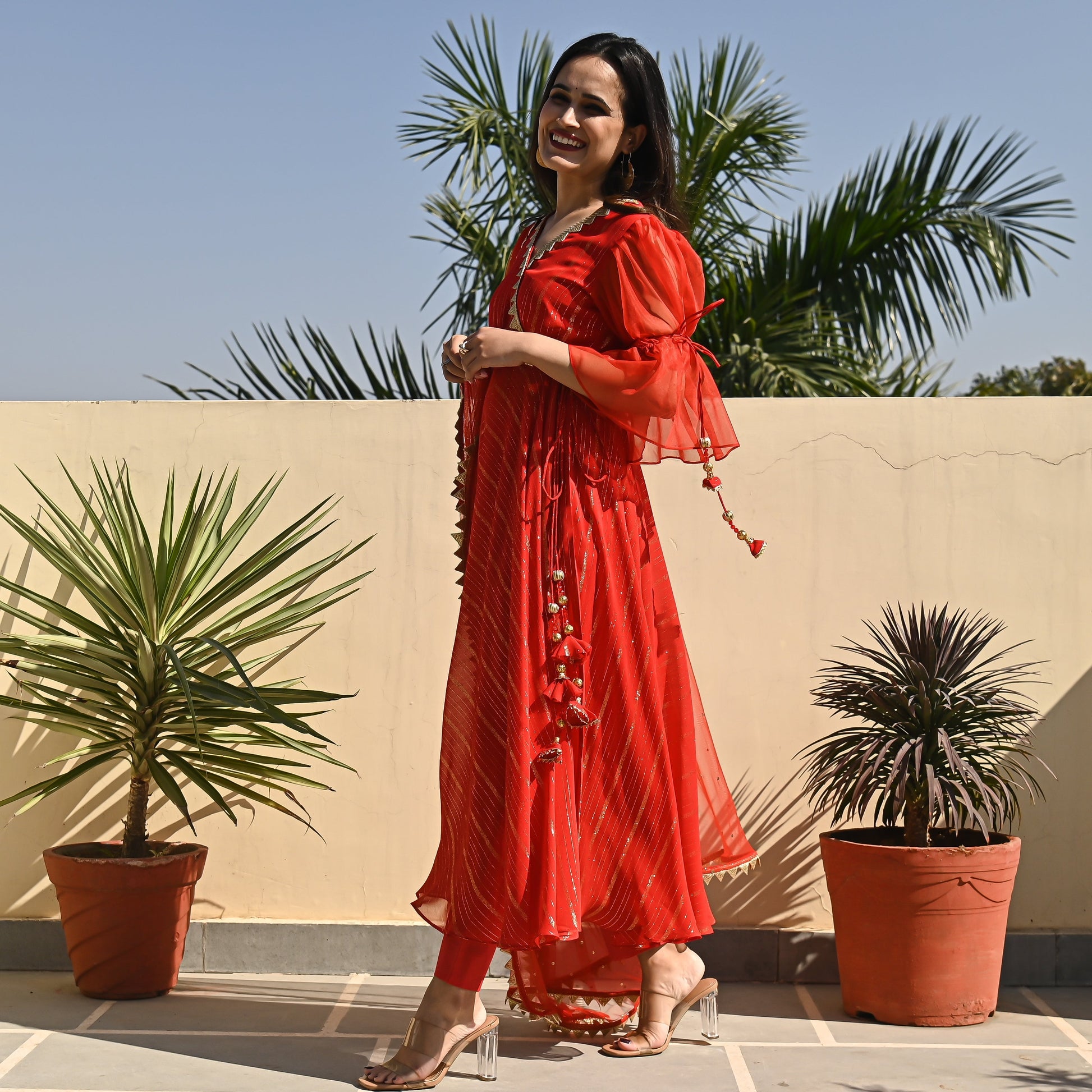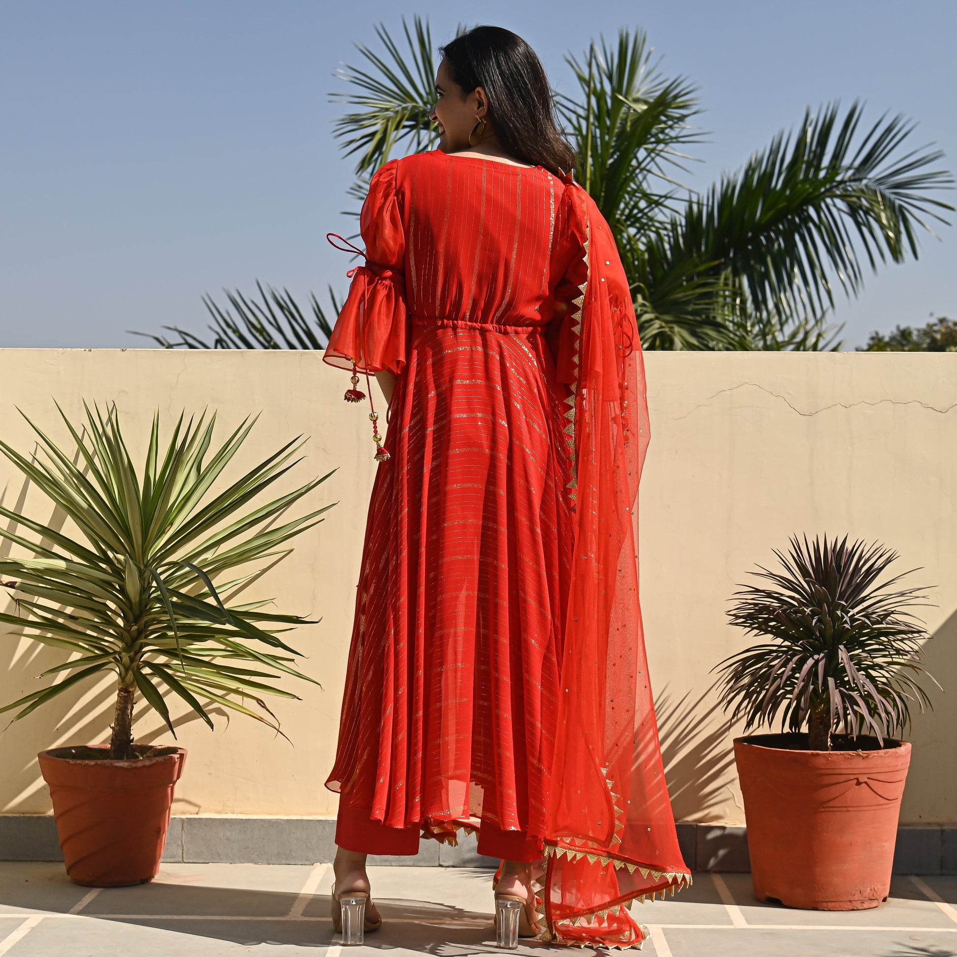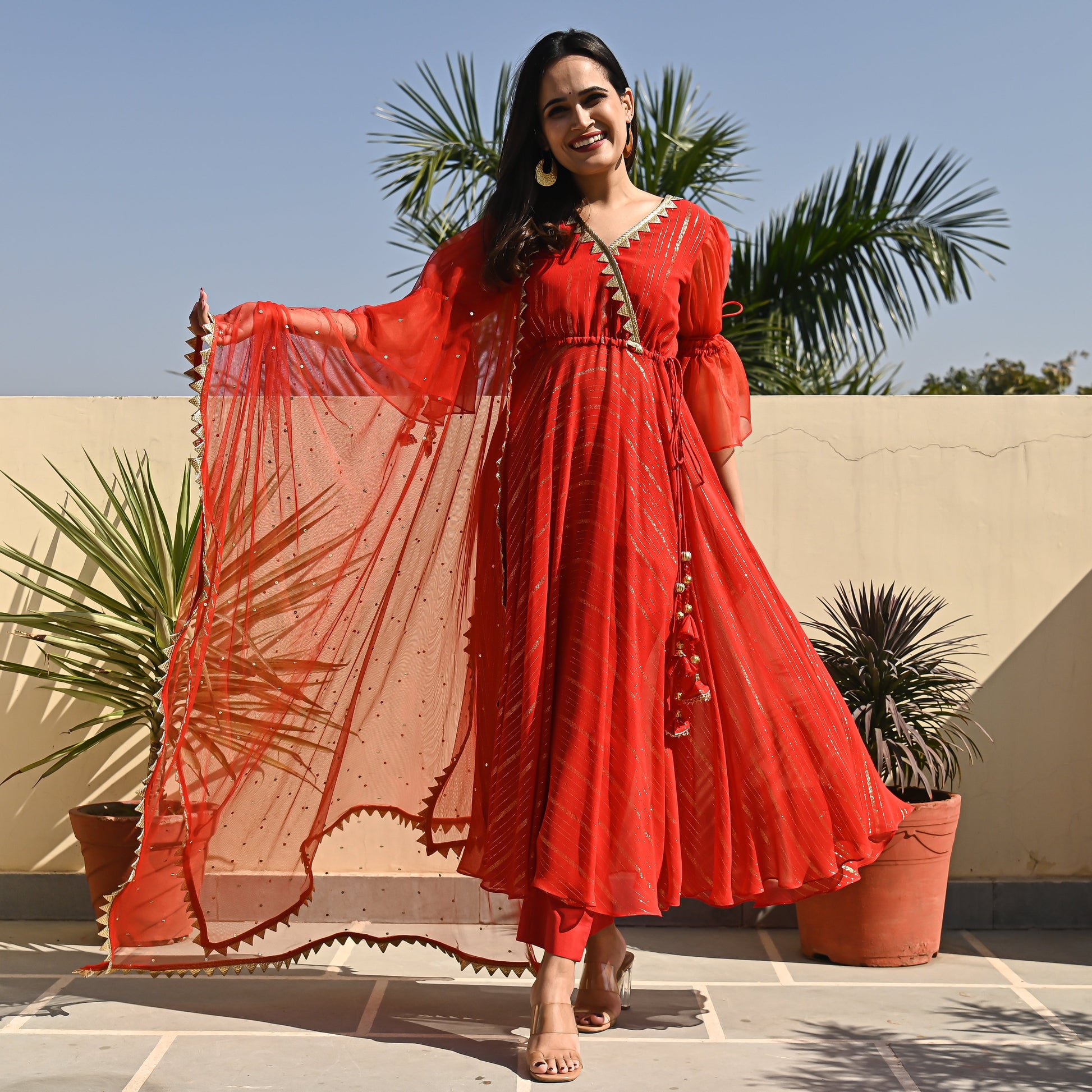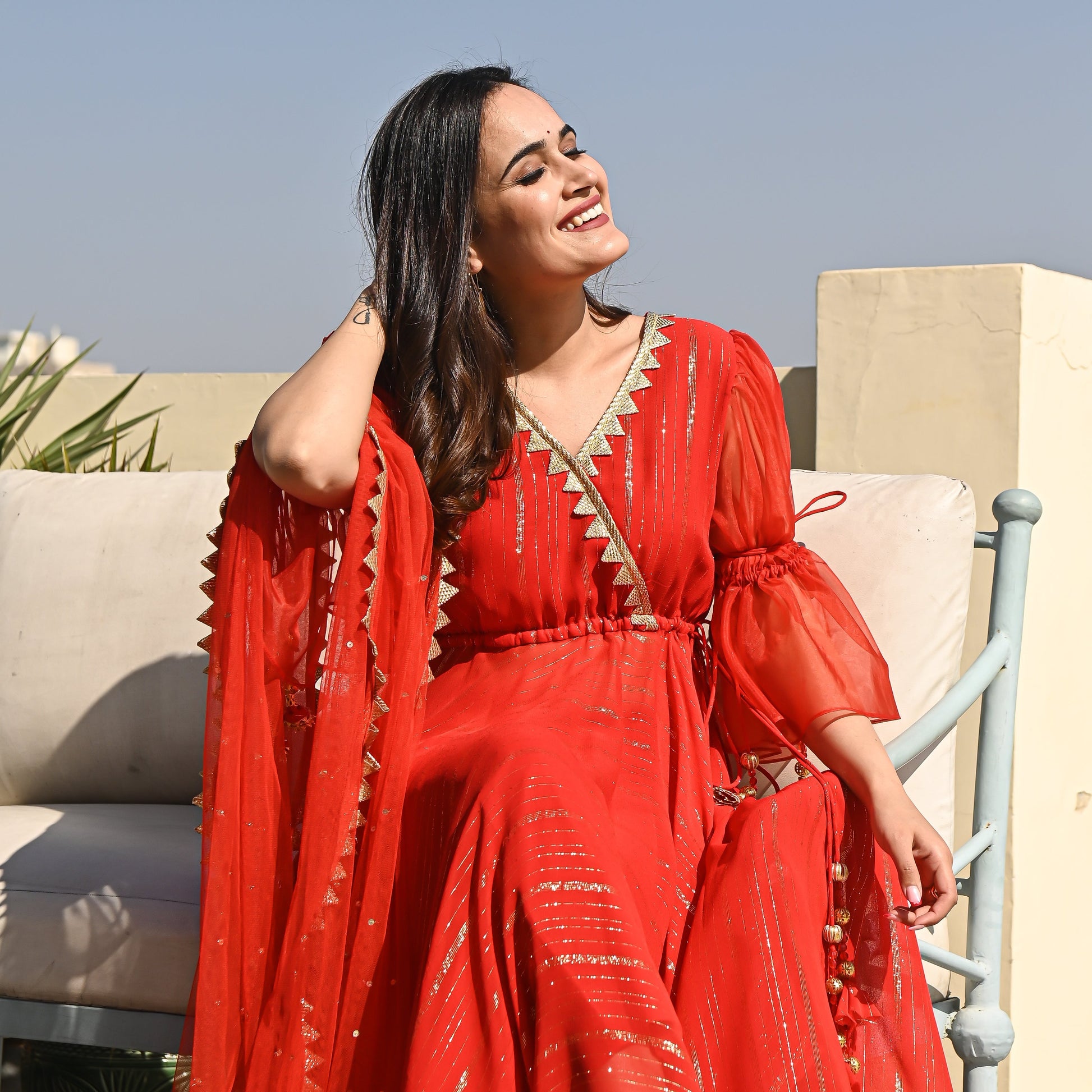 Our Eliza Suit Set is a stylish and elegant traditional outfit that features an exquisite Anarkali-style top, straight bottoms and matching dupatta. The Suit Set features a beautiful red colour with intricate gotta details on the bodice and a flattering surplice neckline. This set features Lurex threadwork that shimmers and shines in the light, creating a bold and eye-catching effect. Overall, this Set is perfect for special occasions such as weddings, parties, or other festive events where you want to make a statement with your fashion choices.