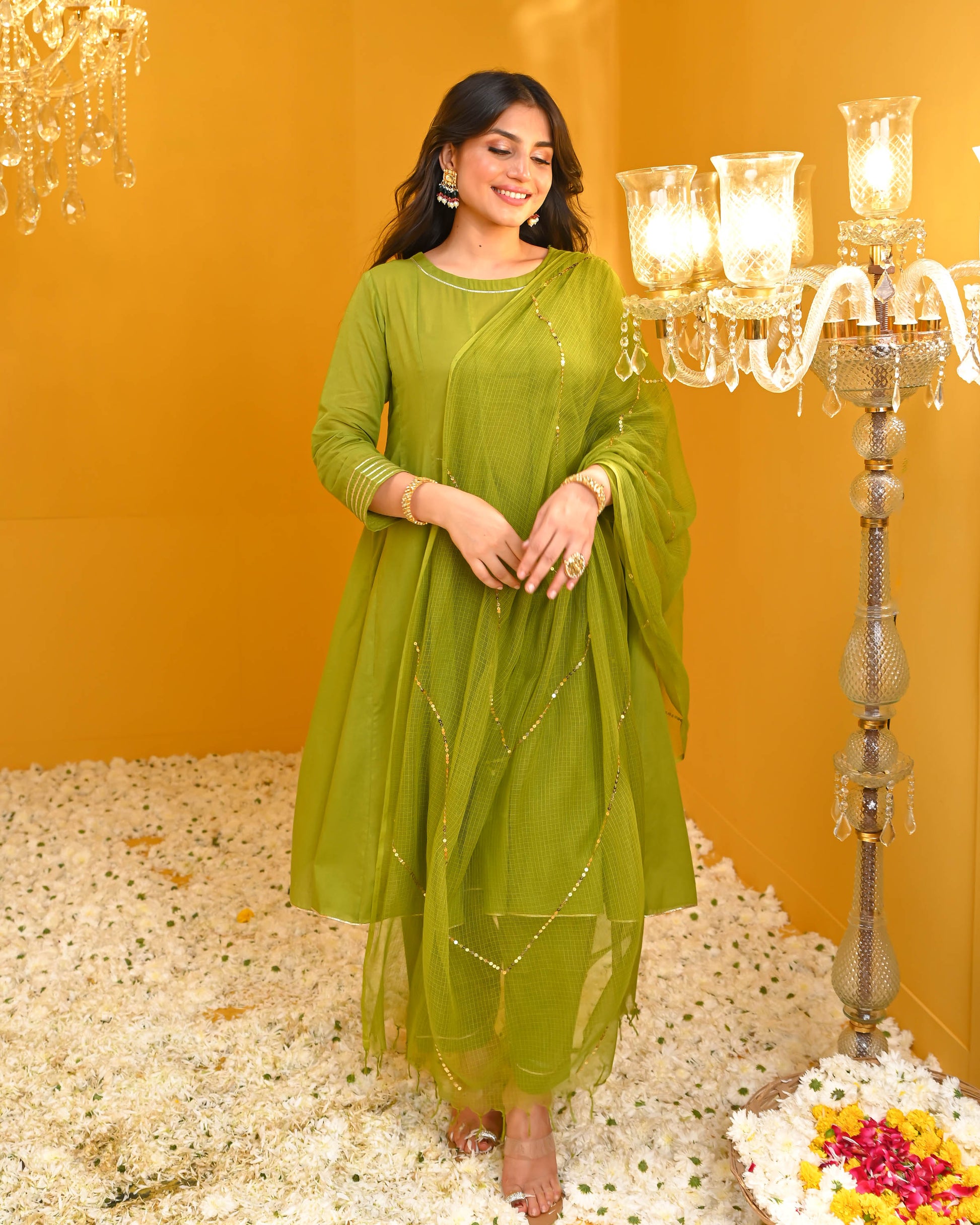 Step into elegance with the Eshita Cotton Suit Set in deep forest green. This A-line flared kurta features a round neckline and chic three-quarter sleeves. Paired with matching pants, it’s perfect for a festive day out. The embellished kota doriya dupatta adds a stunning finishing touch to this timeless, graceful look!