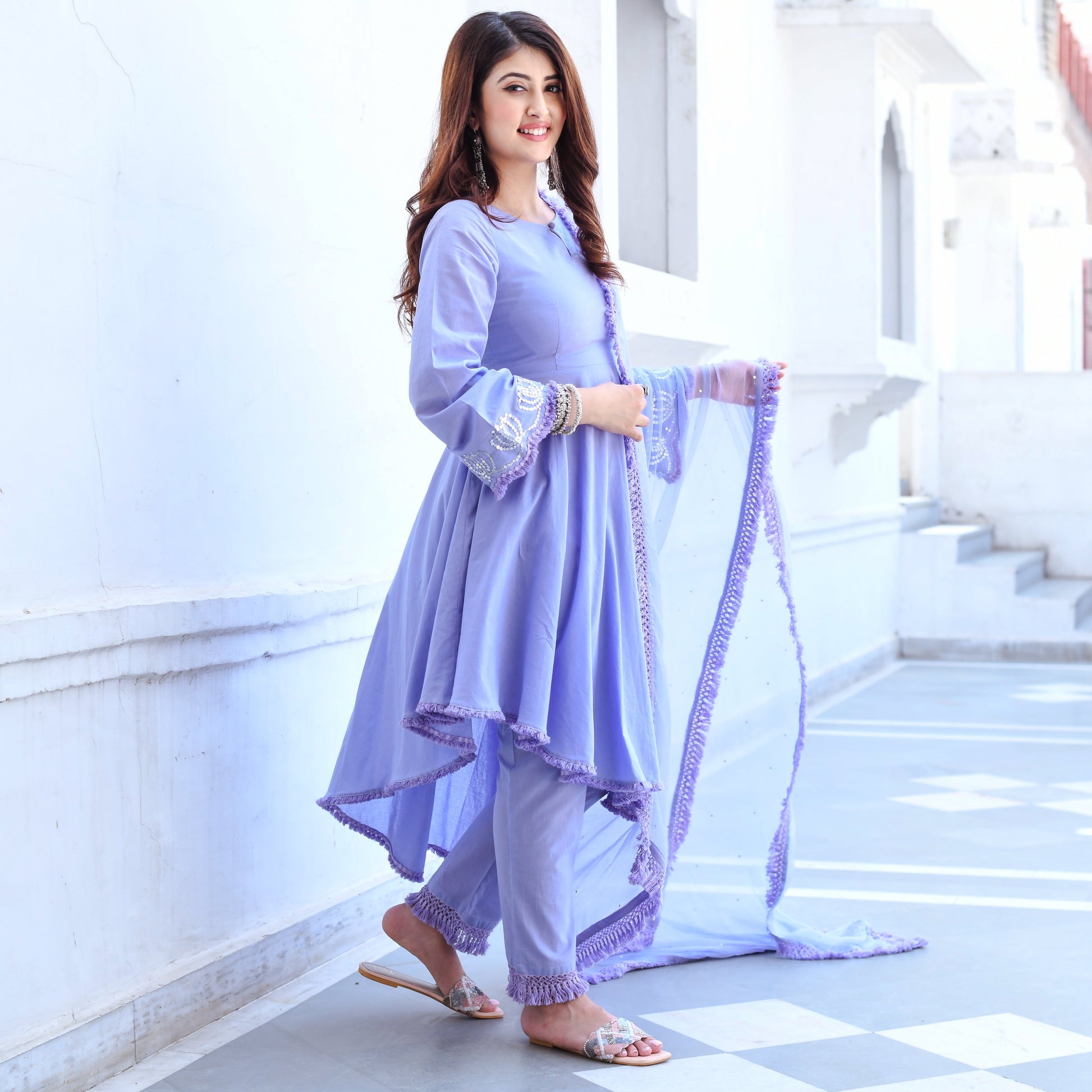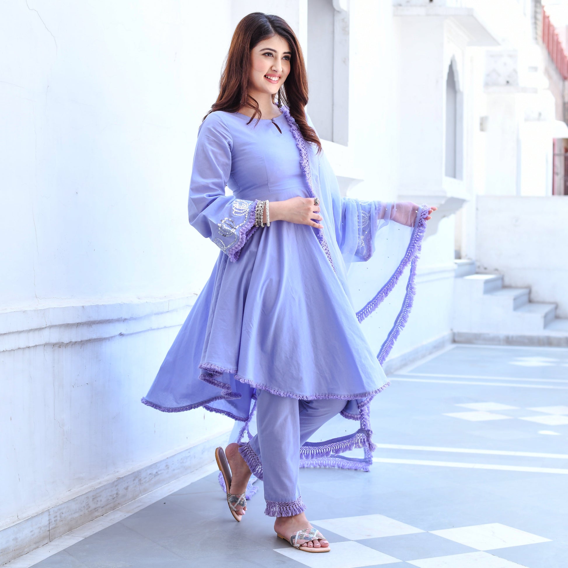 Introducing our Gauravi Suit Set, a timeless classic that will never go out of style. Crafted from lightweight cotton, this Suit Set is both comfortable and breathable, making it perfect for warmer weather. The soft lavender hue is both refreshing and soothing, creating a calming effect. The Set features a unique silhouette with a round neck and three-quarter bell sleeves, making it a versatile piece that can be dressed up or down. The fringe border detailing adds a playful touch, making this Set a fun addition to any wardrobe.