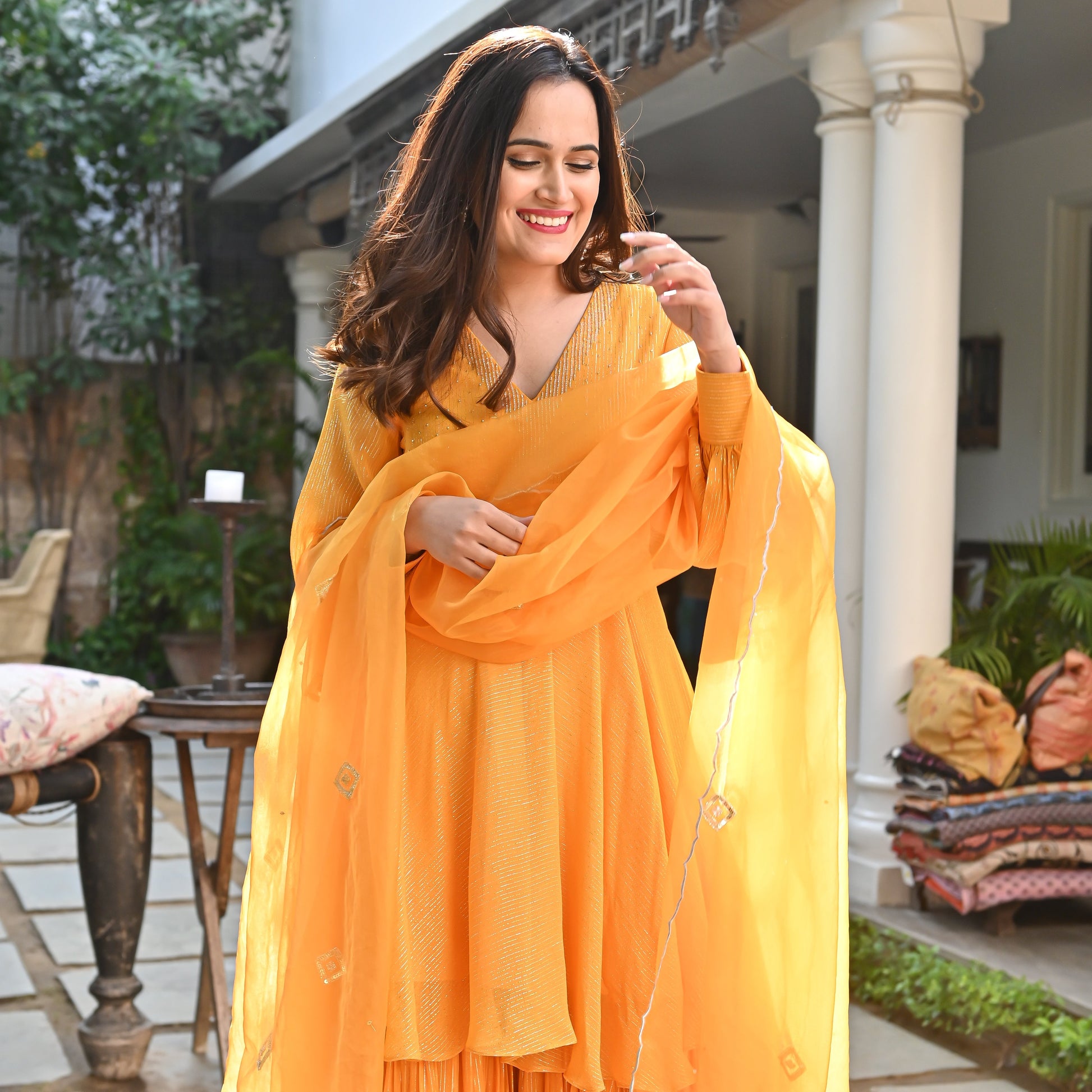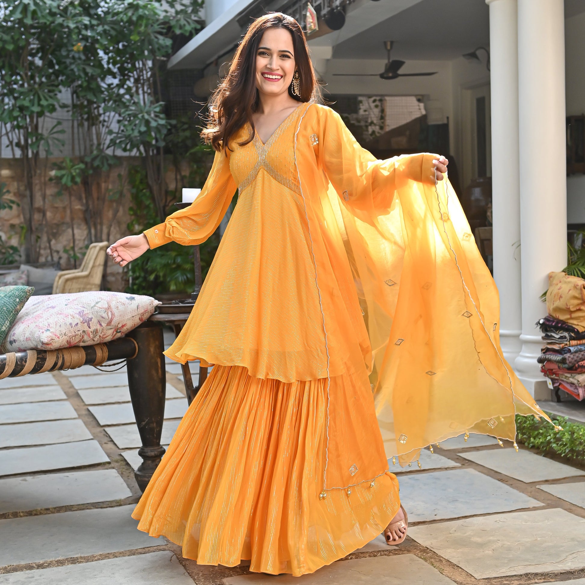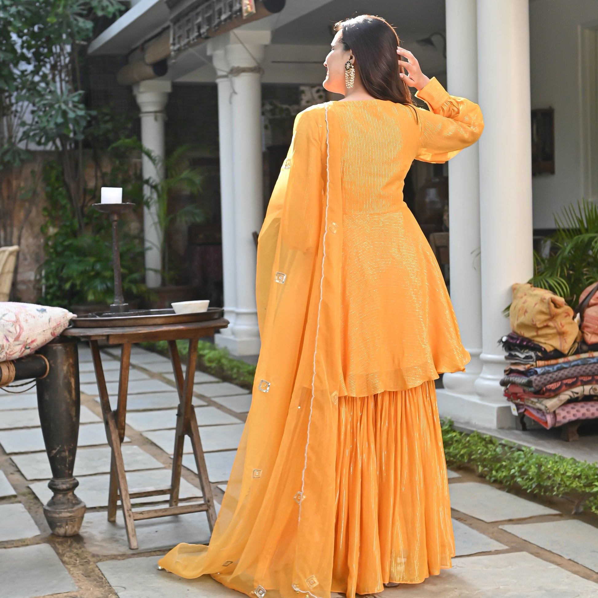 Introducing our Genda Suit Set, a true showstopper that is sure to make you shine like a star. This stunning Set is crafted with high-quality lurex fabric, which gives it a beautiful and unique shimmering effect that catches the eye. The unique bodice of the Set adorned with intricate cut-dana and sequin work adds a touch of luxury and glamour to the outfit. The colour of this set is a bright and vibrant yellow that is sure to make you stand out from the crowd. This is a truly unique and breathtaking piece that is sure to make a lasting impression.