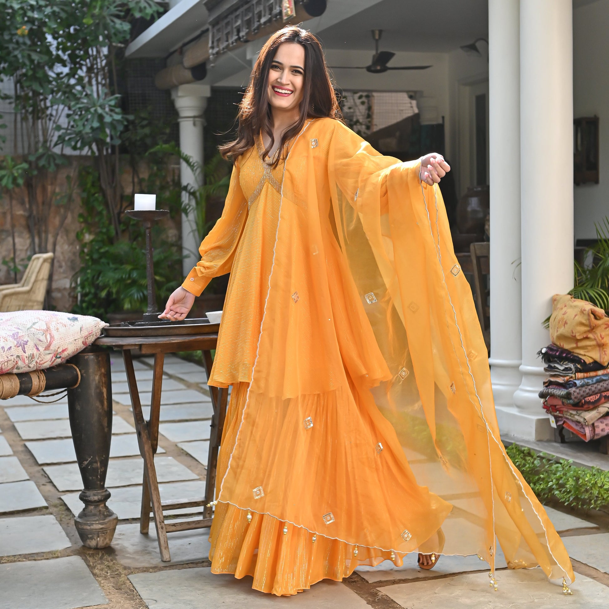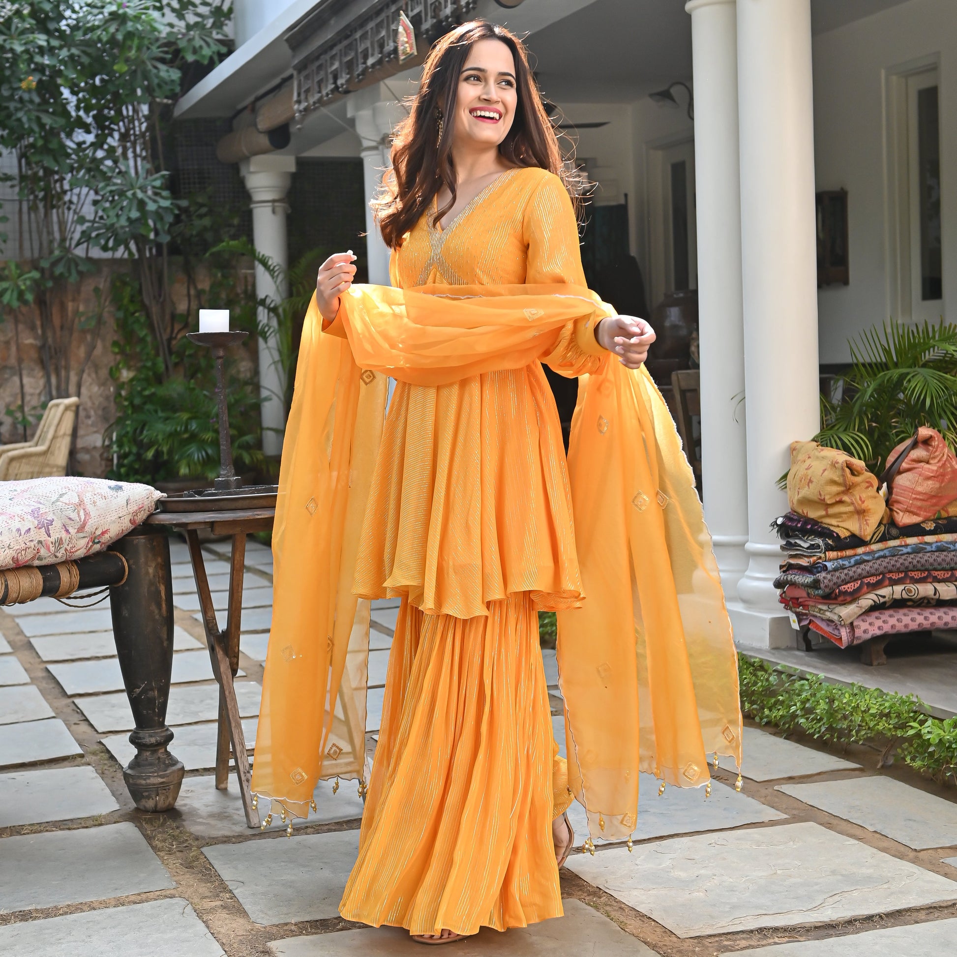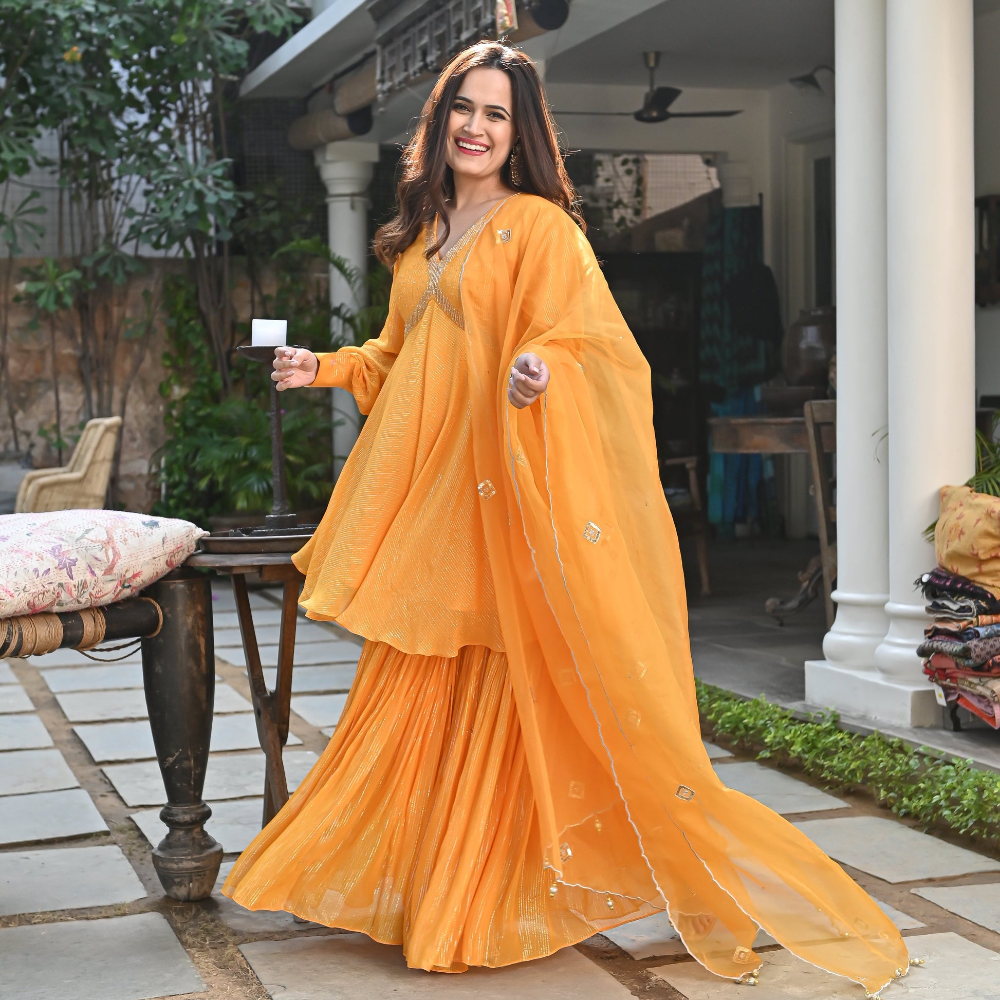 Introducing our Genda Suit Set, a true showstopper that is sure to make you shine like a star. This stunning Set is crafted with high-quality lurex fabric, which gives it a beautiful and unique shimmering effect that catches the eye. The unique bodice of the Set adorned with intricate cut-dana and sequin work adds a touch of luxury and glamour to the outfit. The colour of this set is a bright and vibrant yellow that is sure to make you stand out from the crowd. This is a truly unique and breathtaking piece that is sure to make a lasting impression.