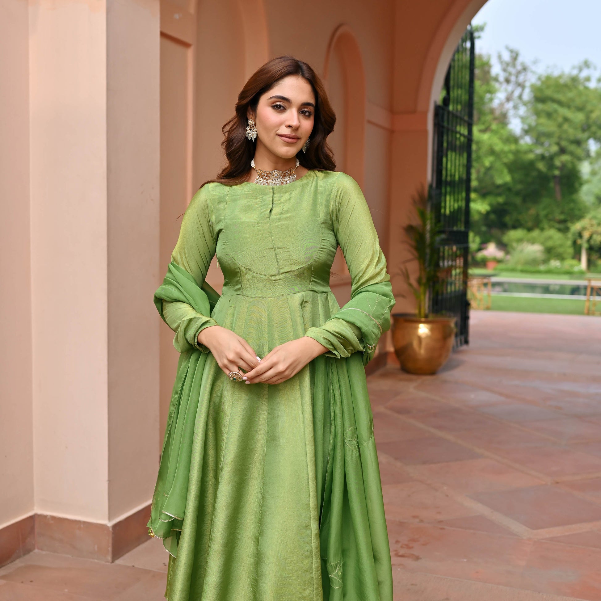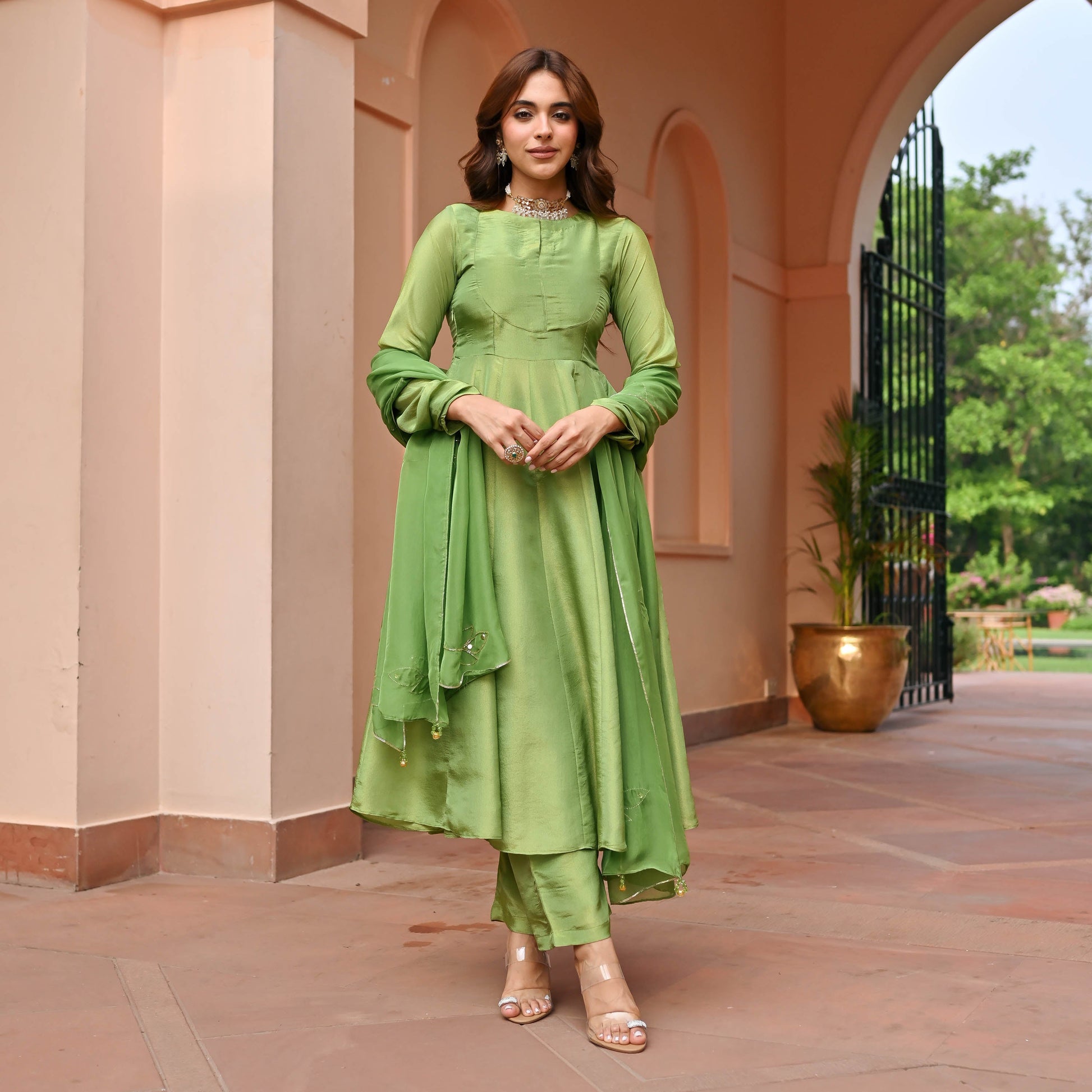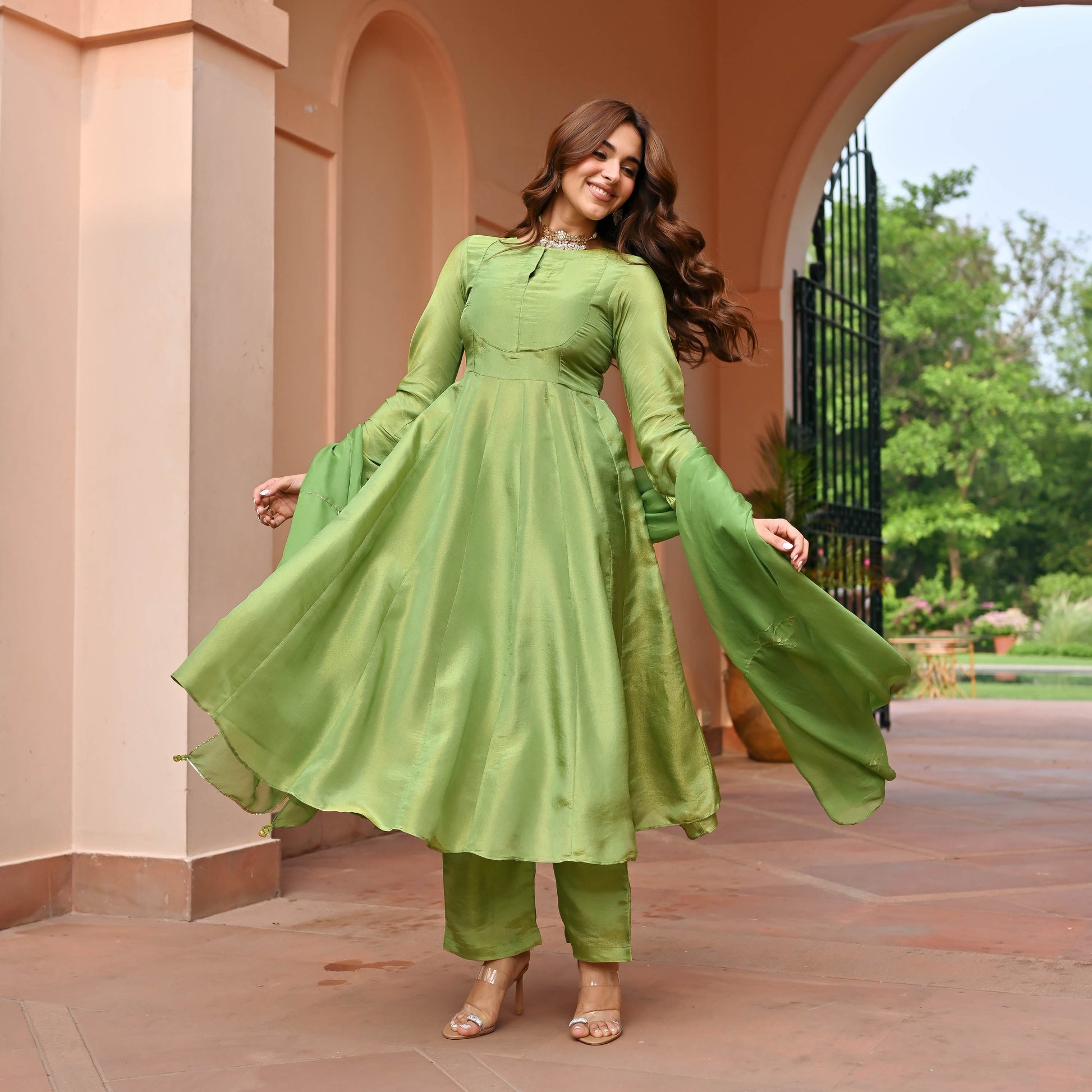 Glow in green with our Green Tissue Silk Suit Set! This shimmering green number features a round neck and fitted yoke, with full sleeves and a flared hemline for that extra twirl. Paired with matching pants and an embellished dupatta, it’s the perfect blend of elegance and sparkle for any celebration. Get ready to dazzle and shine!