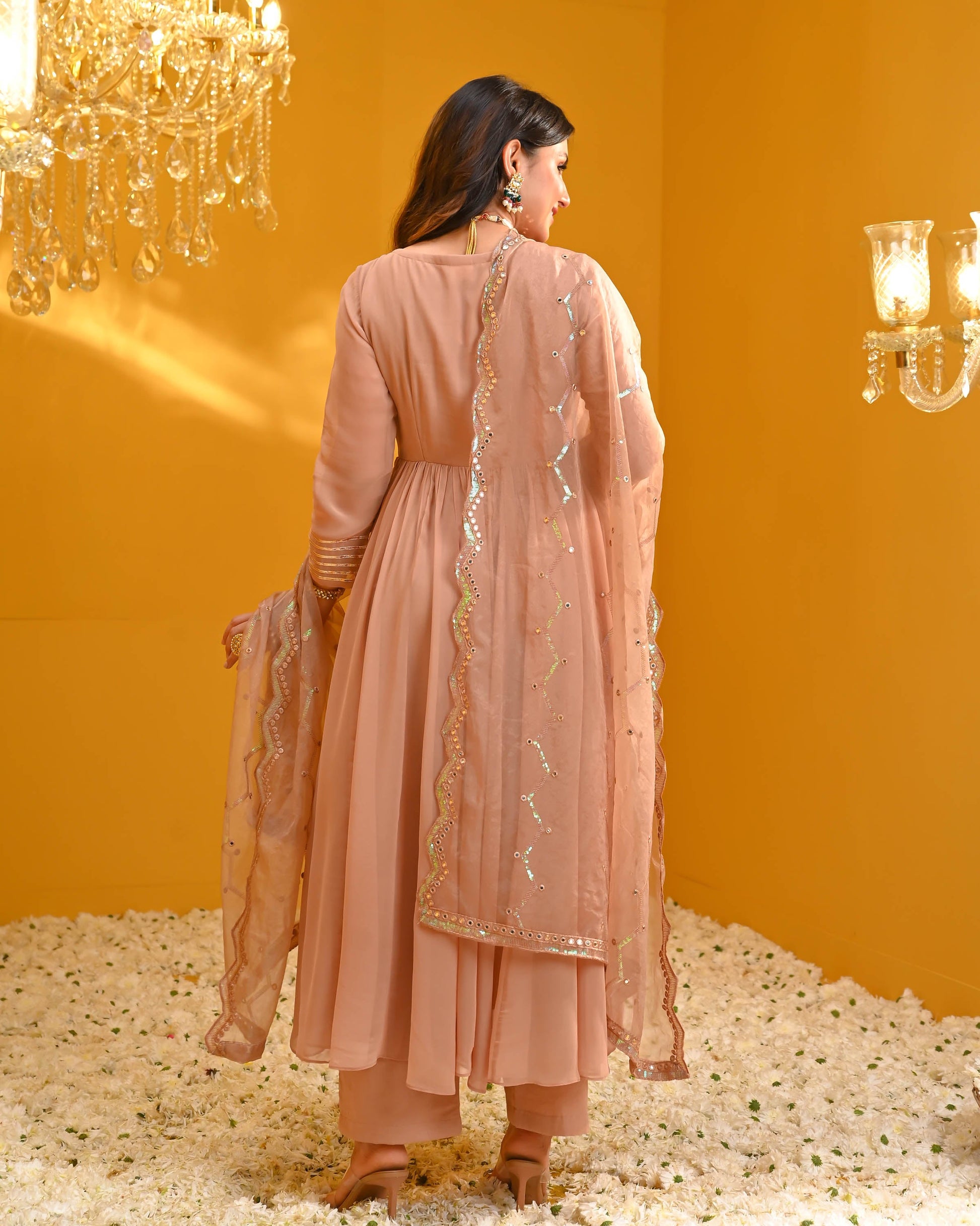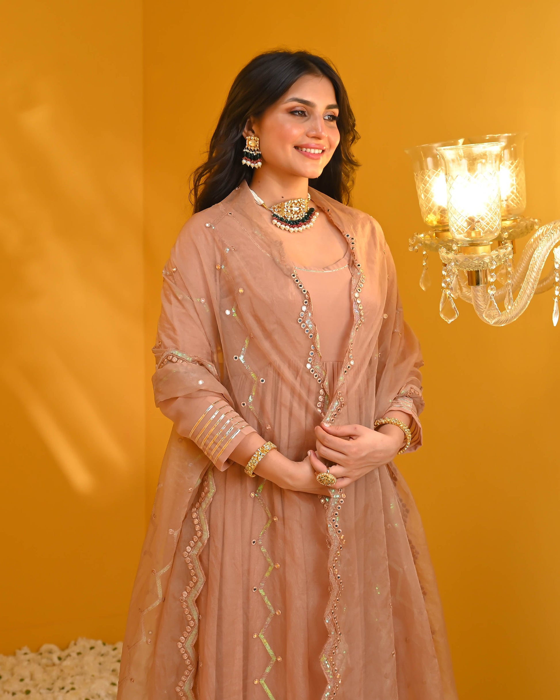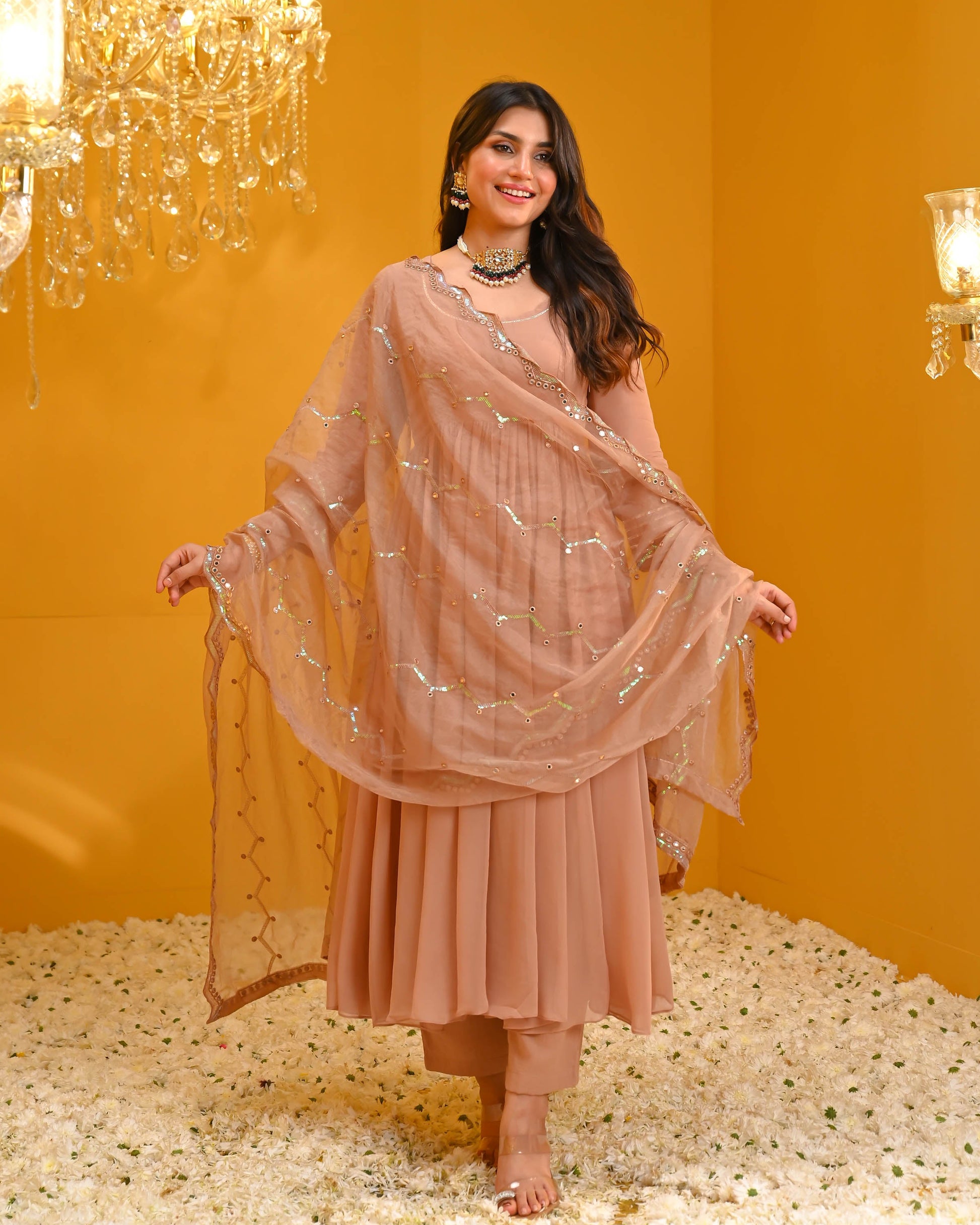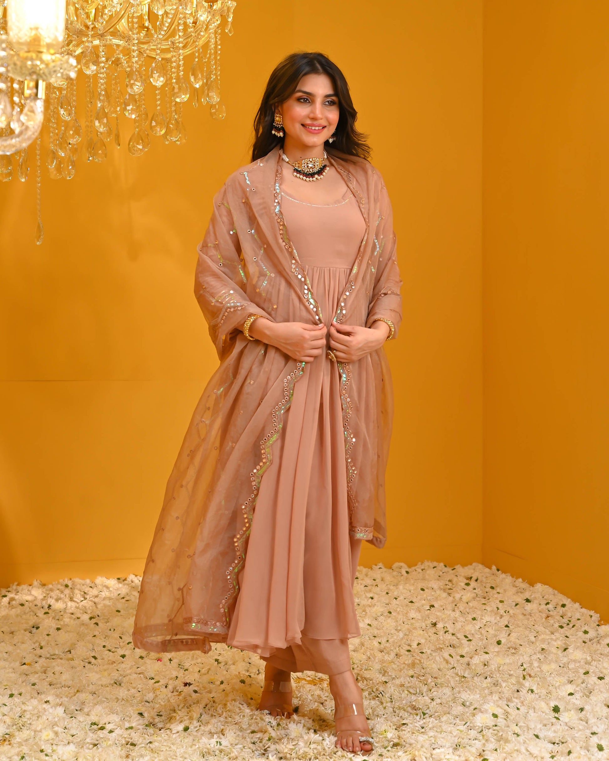 Step into sophistication with the Harini Georgette Suit Set in stunning nude mauve! This anarkali-style flared kurta boasts a classic round neckline and chic three-quarter sleeves. Paired with matching pants, it’s a dream come true for any occasion. The organza dupatta, adorned with dazzling mirror and sequin embellishments, adds a touch of sparkle, ensuring you shine wherever you go!