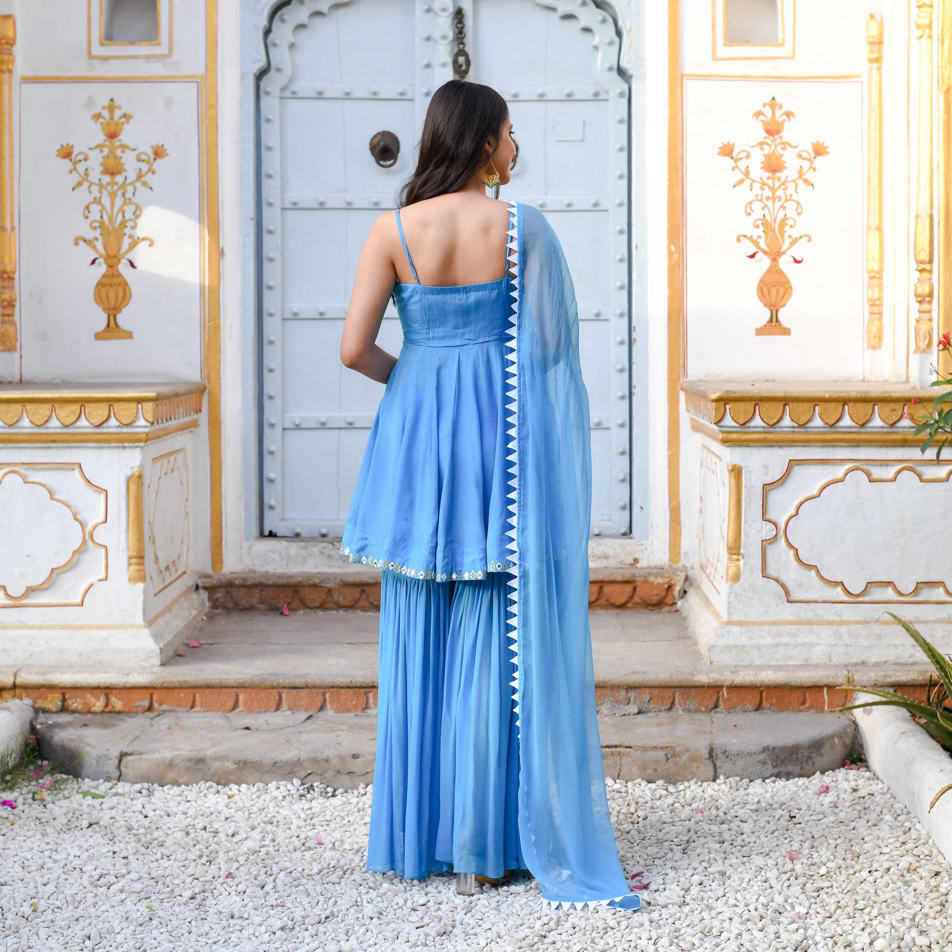 Make your own cinderella story in this beautiful blue Himani Suit Set, crafted from the best quality georgette and cotton-silk fabric. The stylish peplum style of the top adds a flattering shape to the torso, while the round neckline and cut sleeves and matching dupatta add a touch of sophistication. The flared design of the Sharara bottoms adds movement to every step, making you look and feel confident and beautiful. Whether you're looking to make a statement or simply want to dress up for a special occasion, this Himani Suit Set is a perfect choice.
