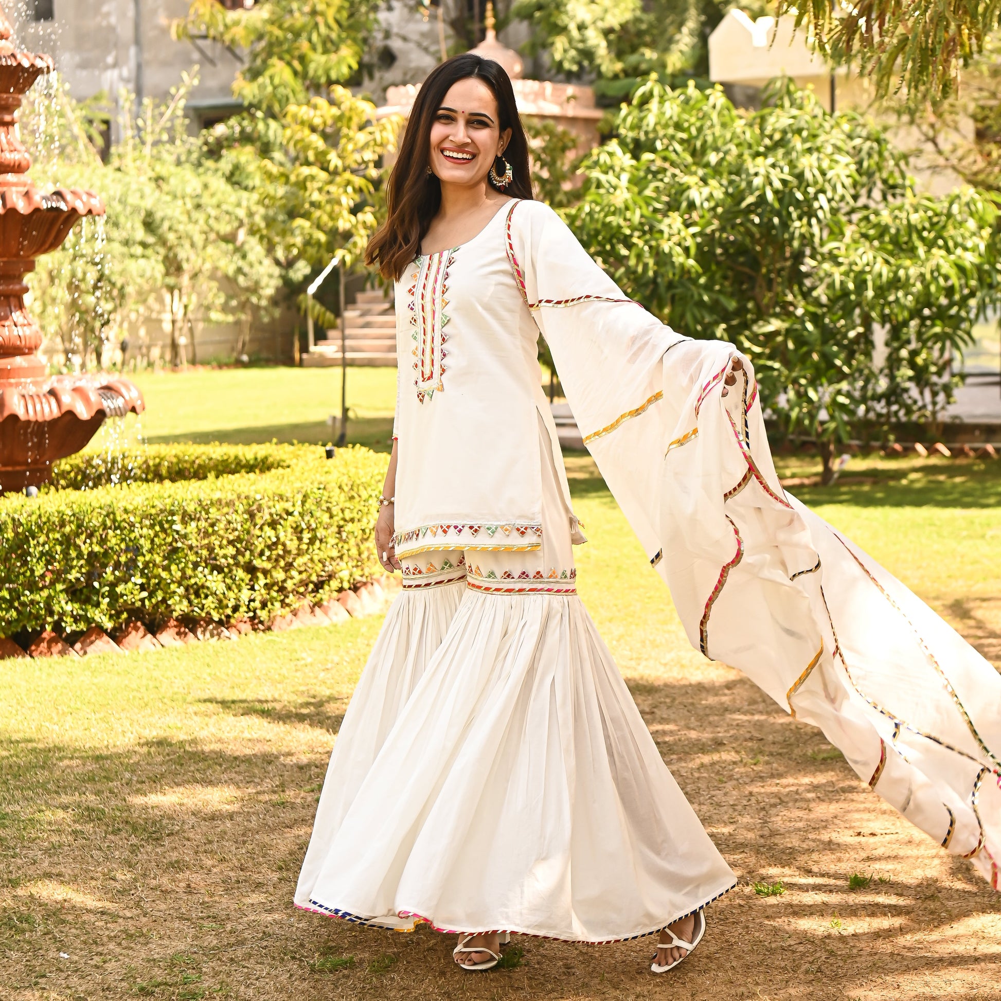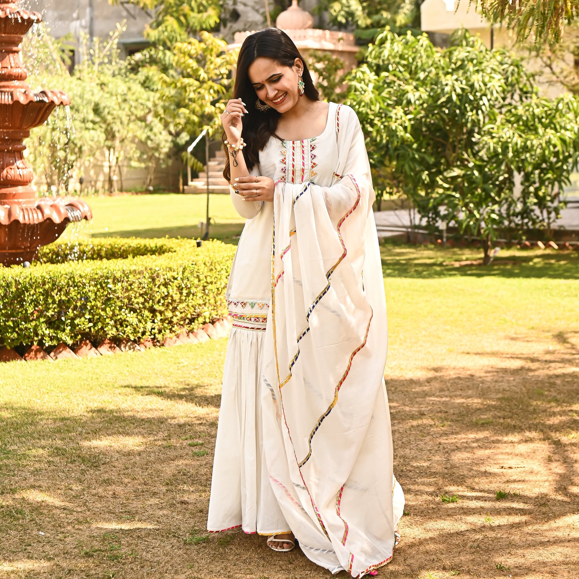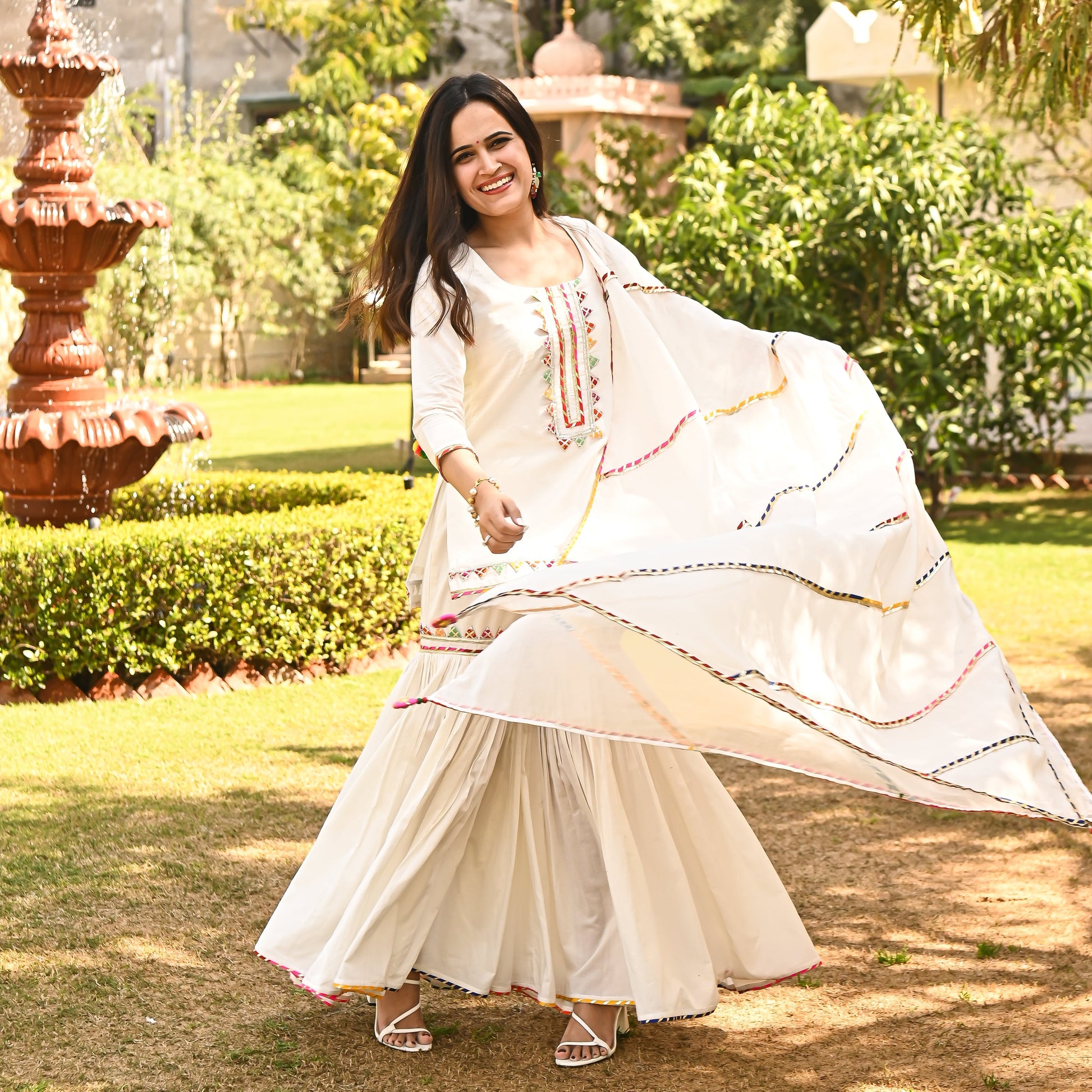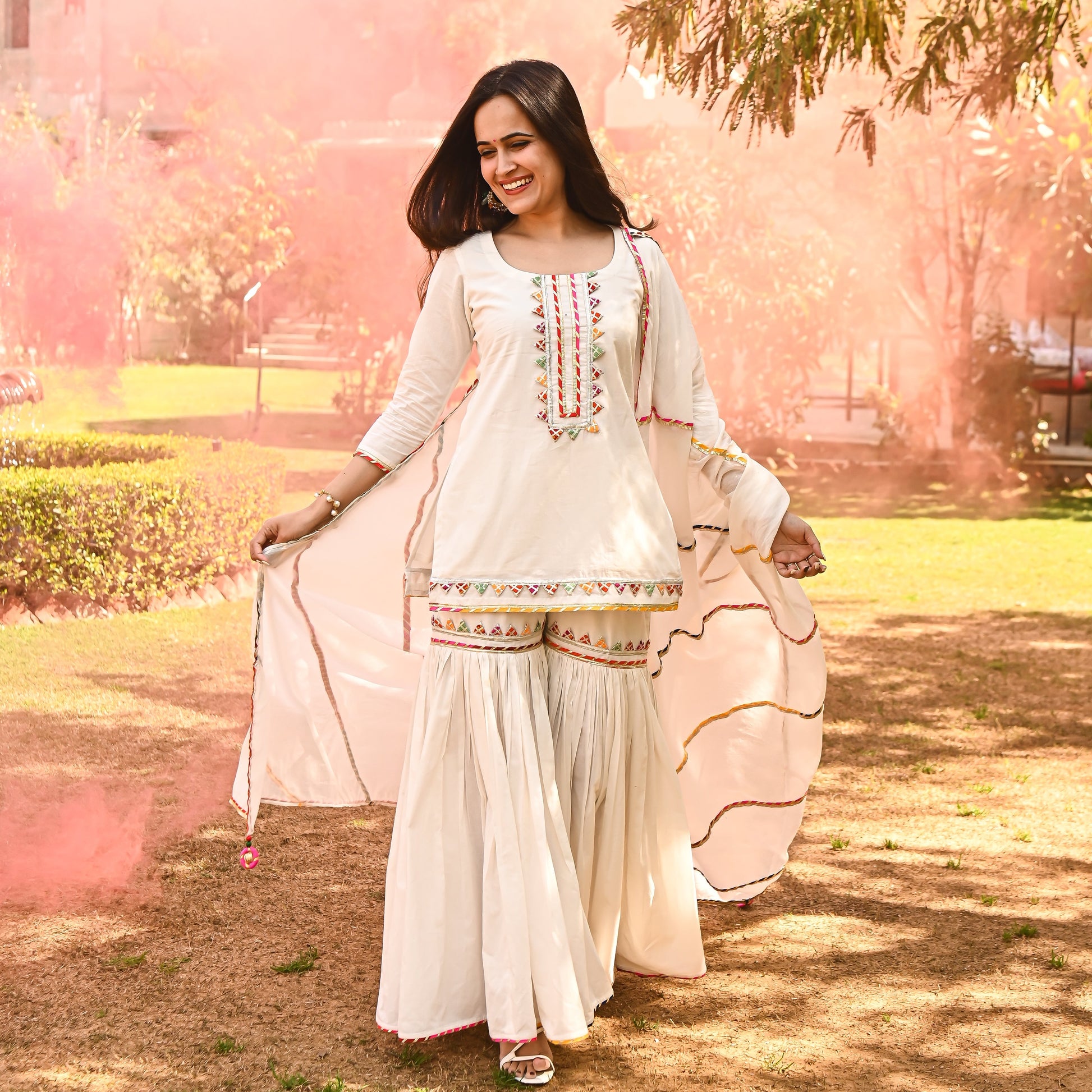 This exquisite Holly White Suit Set has been crafted with the finest quality cotton and attention to detail to create a breathtaking piece that is sure to turn heads. This Set features a gorgeous short white kurta with intricate multicolour details that makes it truly unique. The Suit Set is designed with a flattering round neckline and quarter sleeves, and the hemline is accented with a colourful border that adds a playful touch. The matching dupatta adds an extra layer of elegance and sophistication to the outfit and completes the overall look. It is versatile, stylish, and sure to make a lasting impression.