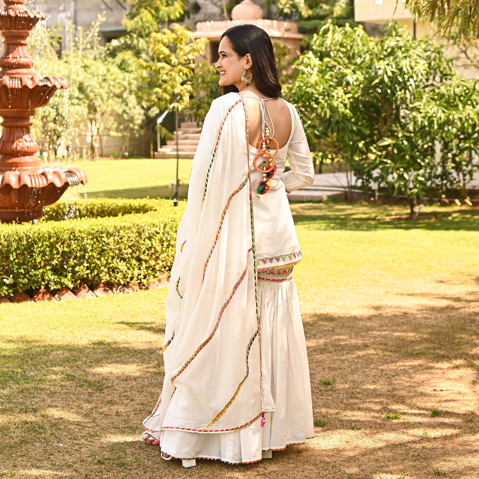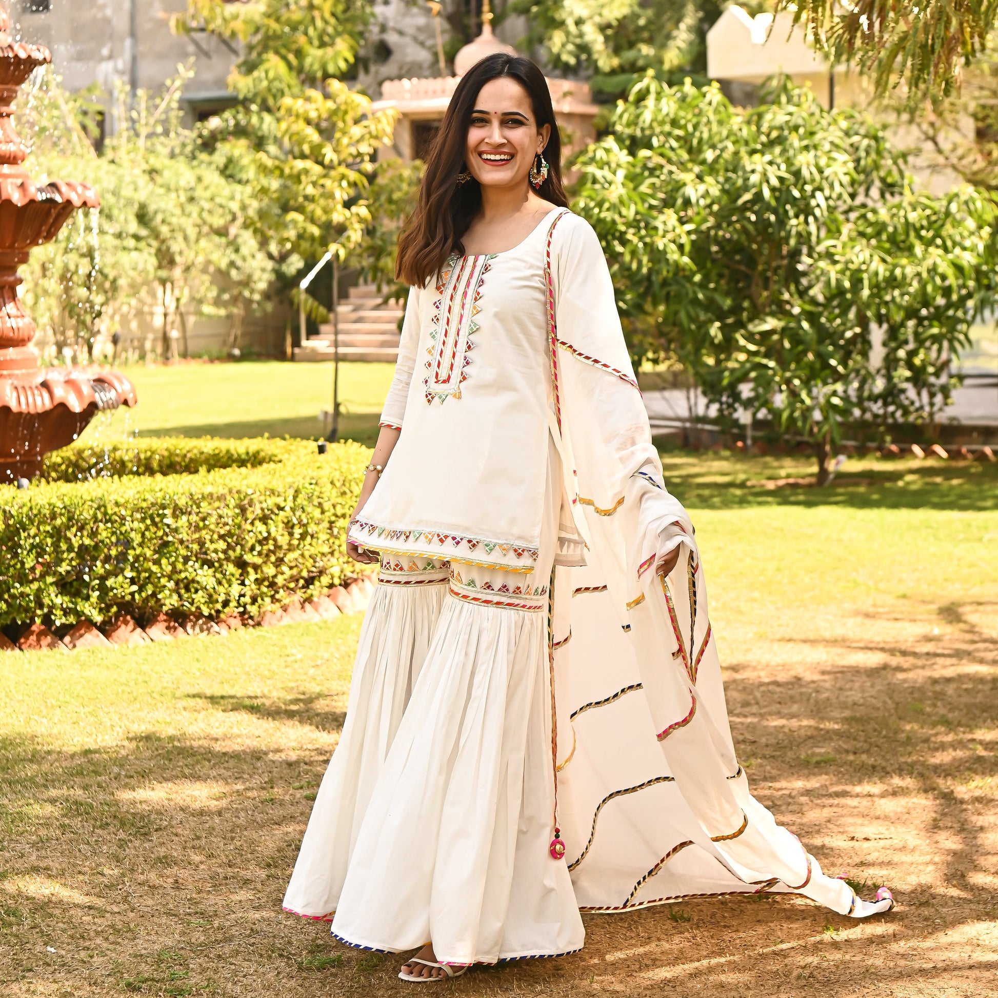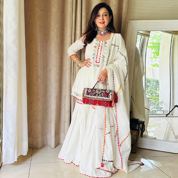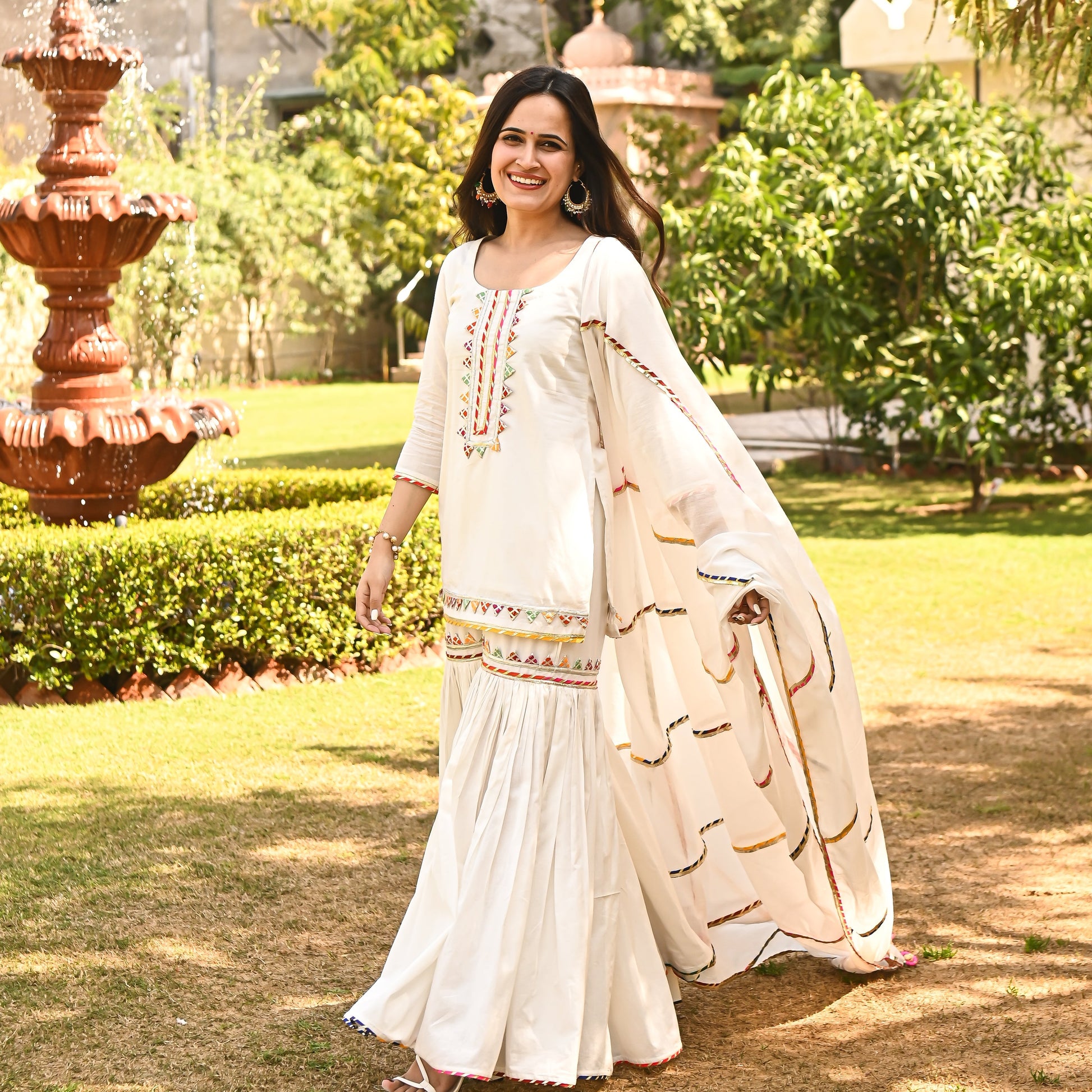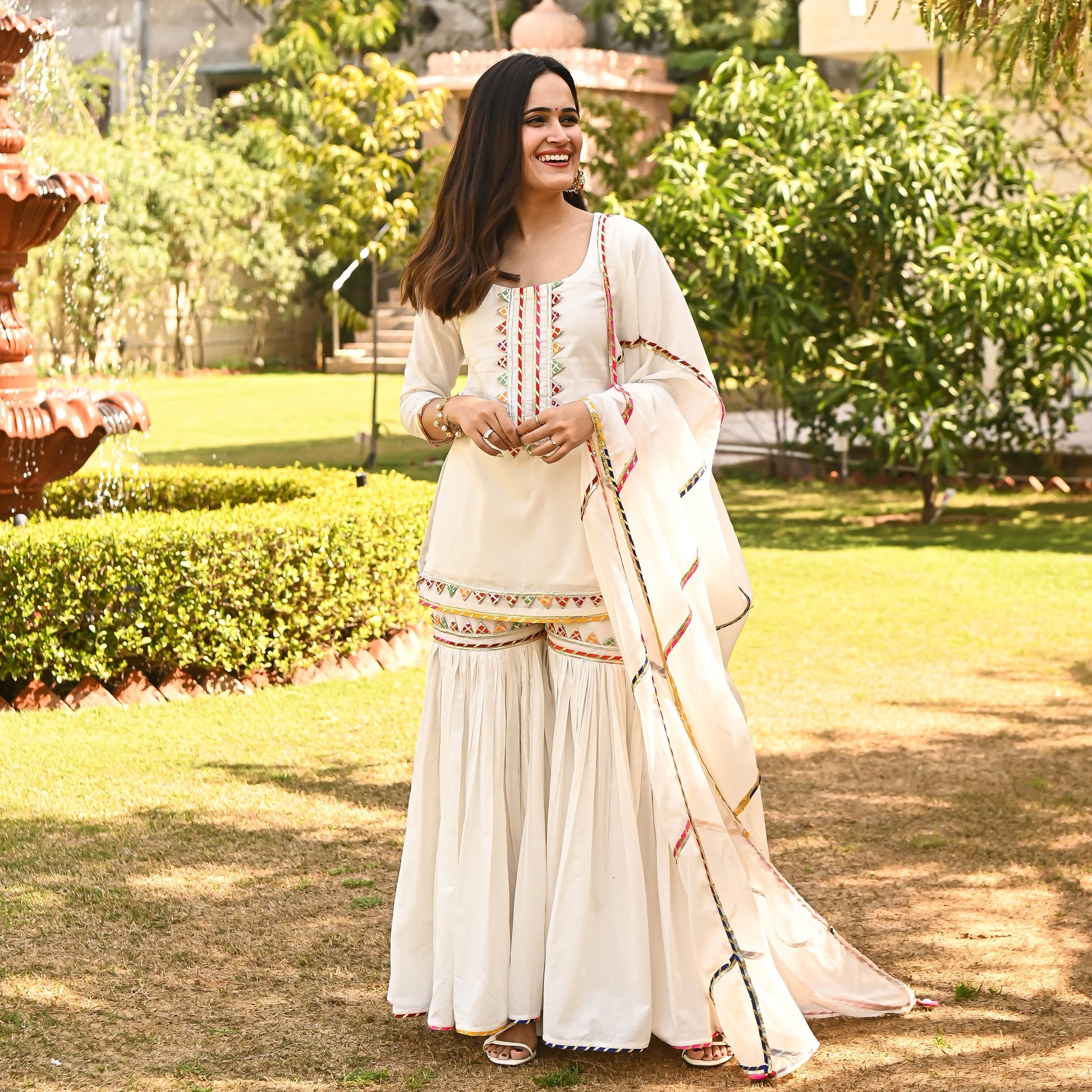 This exquisite Holly White Suit Set has been crafted with the finest quality cotton and attention to detail to create a breathtaking piece that is sure to turn heads. This Set features a gorgeous short white kurta with intricate multicolour details that makes it truly unique. The Suit Set is designed with a flattering round neckline and quarter sleeves, and the hemline is accented with a colourful border that adds a playful touch. The matching dupatta adds an extra layer of elegance and sophistication to the outfit and completes the overall look. It is versatile, stylish, and sure to make a lasting impression.