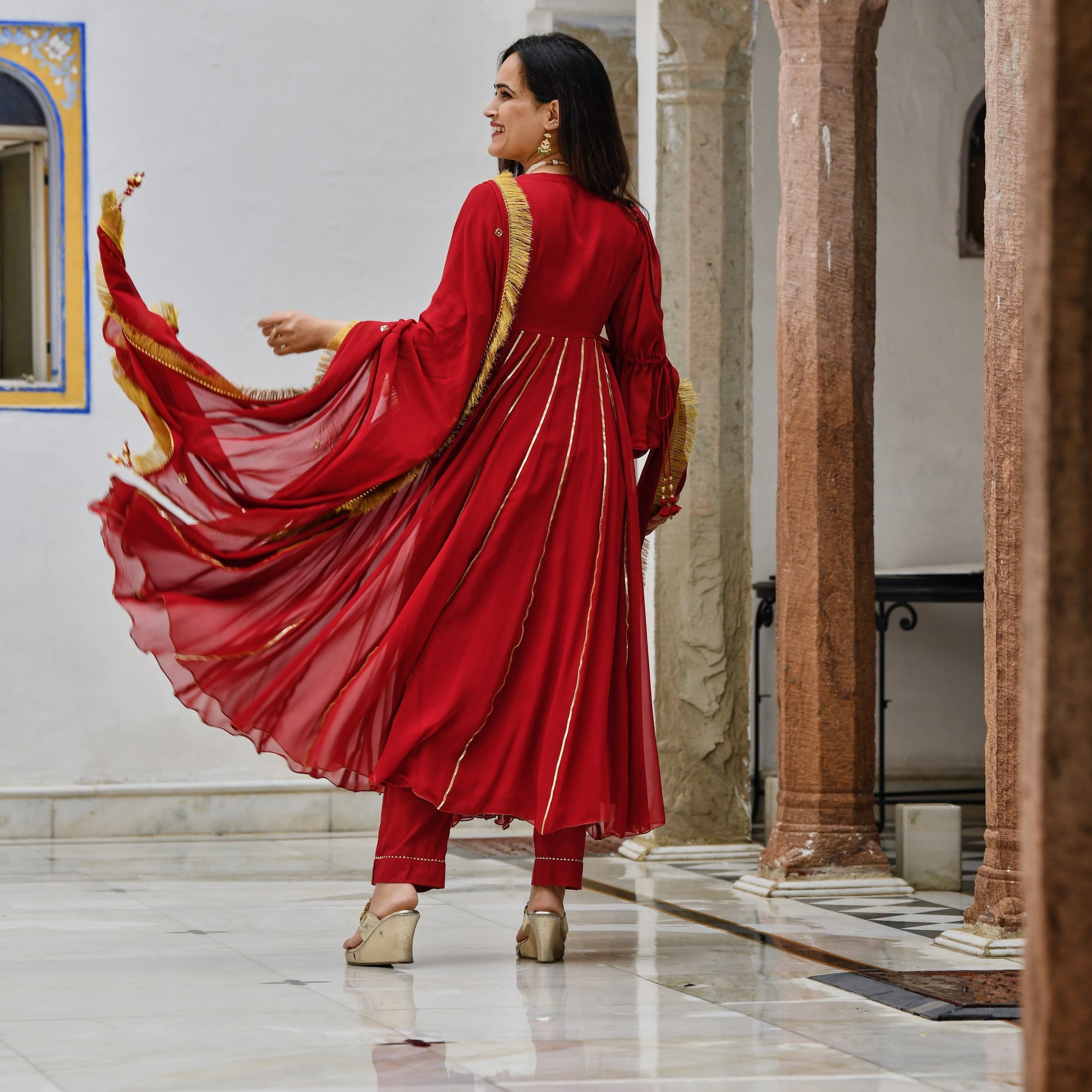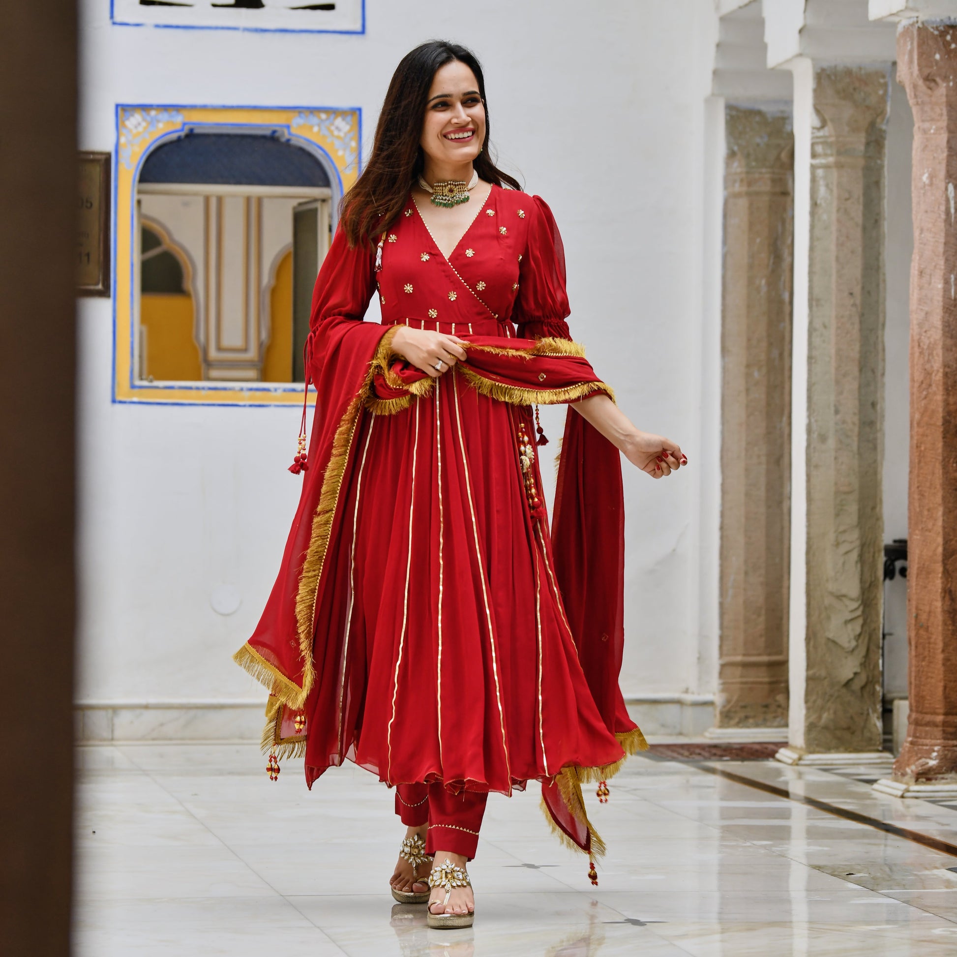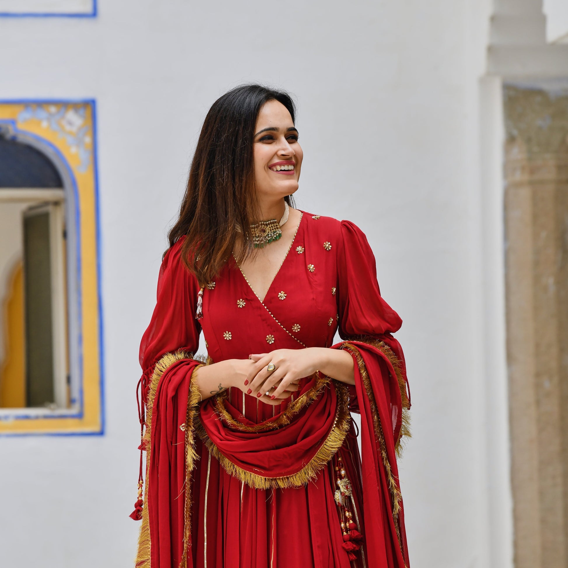 This stunning Ikra Suit Set features a striking red colour, which is perfect for any festive occasion. The gold detailing adds a touch of glamour to the overall design, giving it a luxurious look. The surplice neckline is both elegant and sophisticated, creating a flattering silhouette that is perfect for any body type. The belle sleeves are also a standout feature of this Suit Set, adding a touch of drama and romance to the design. Invest in this stunning Anarkali set, and you'll have a timeless piece that you can wear for years to come.