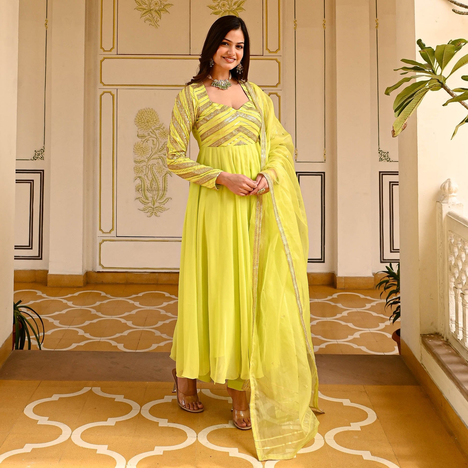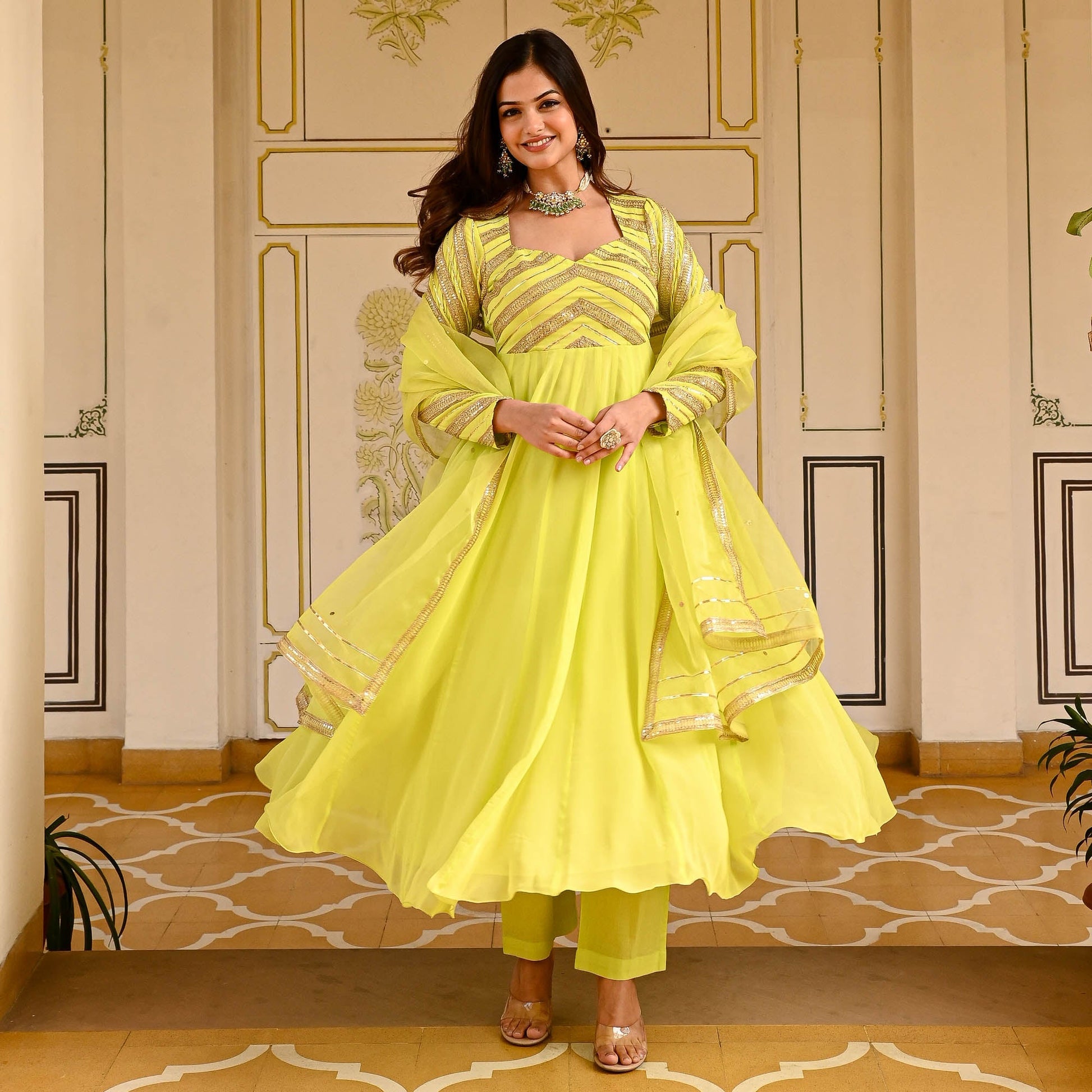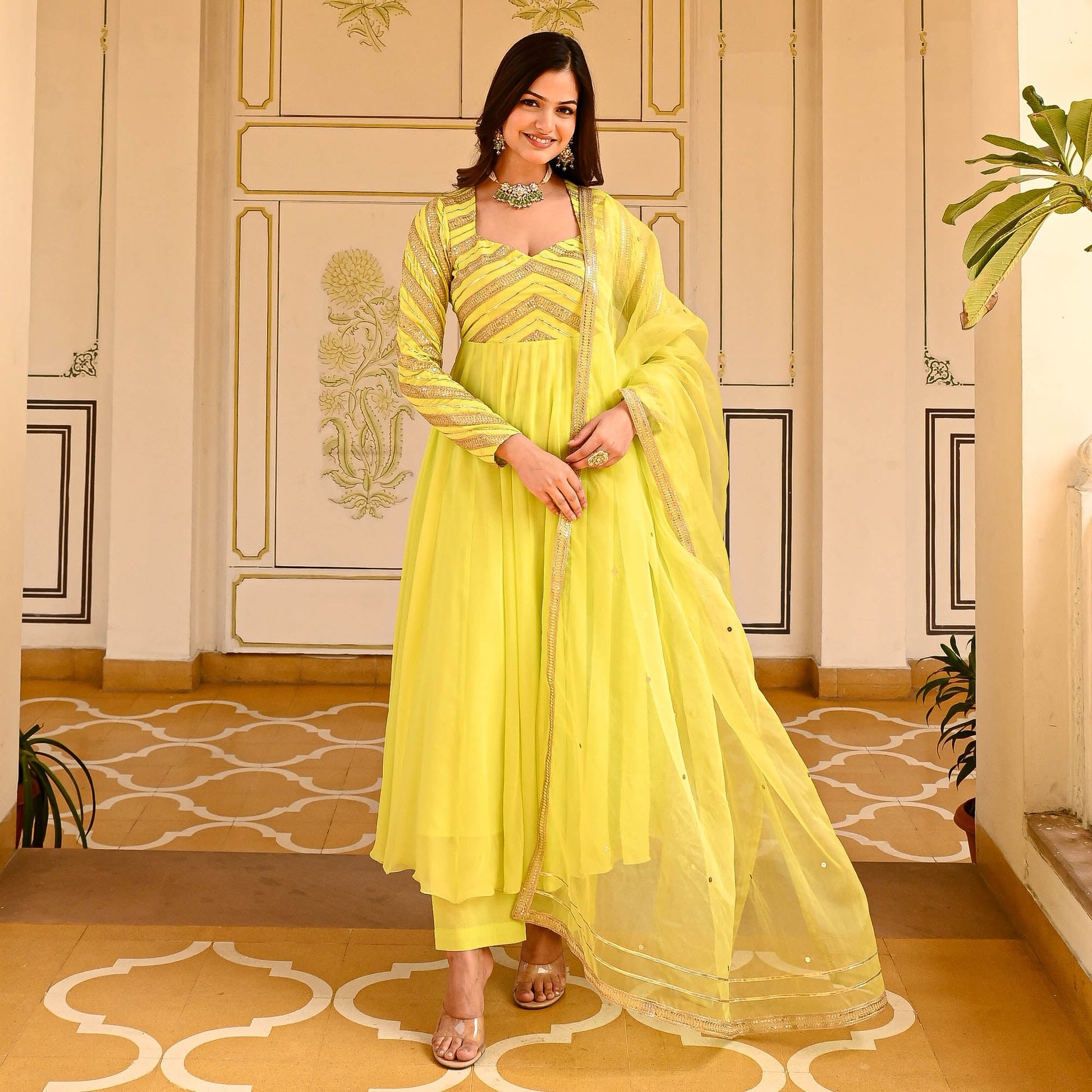 The Jeevika Suit Set is a luxurious ensemble crafted from soft georgette fabric in a radiant lime yellow. It features a fully embroidered yoke and full sleeves, complementing the elegant pentagon neckline. The flared silhouette adds graceful movement while matching pants and an organza dupatta adorned with gota lace complete this exquisite look, perfect for any festive occasion.