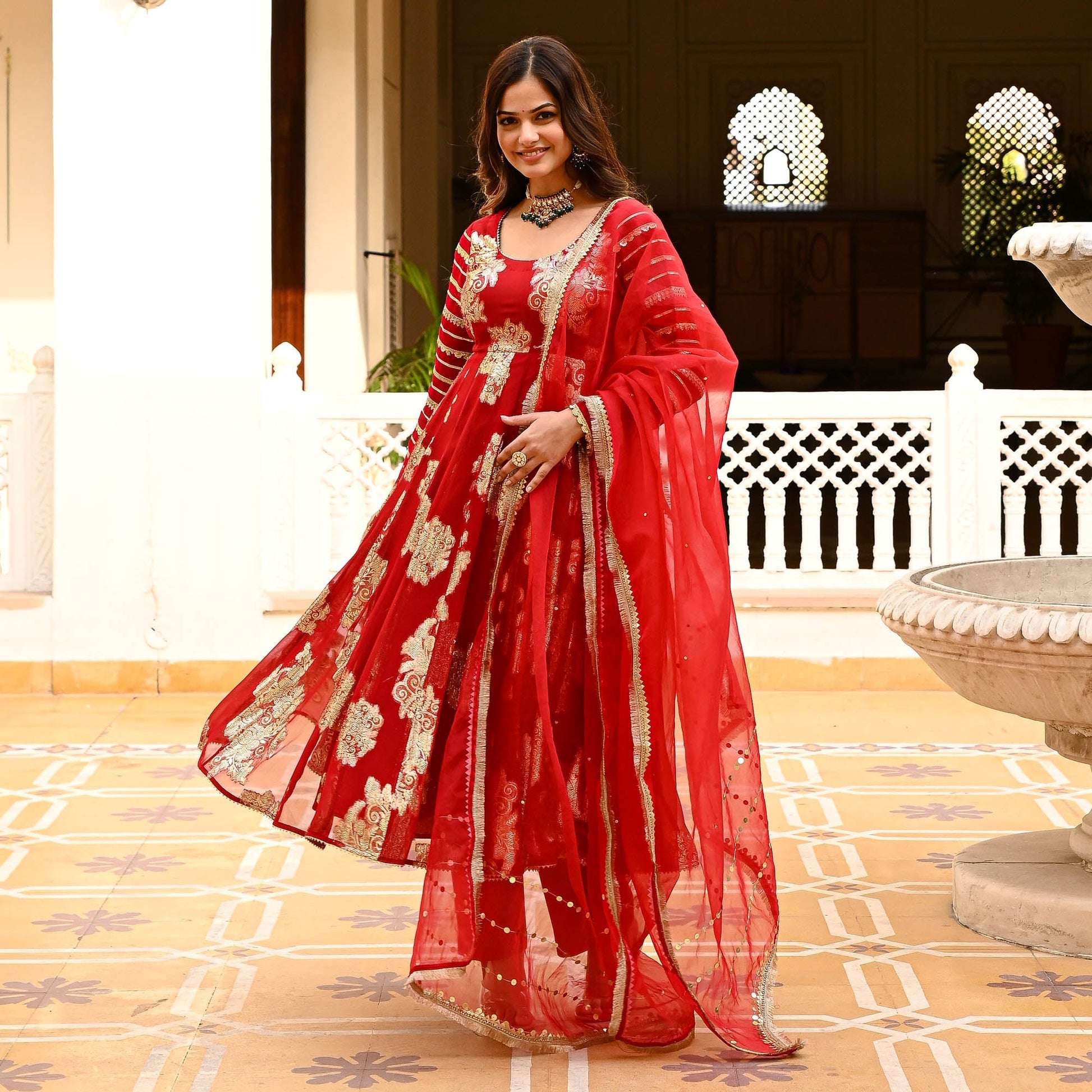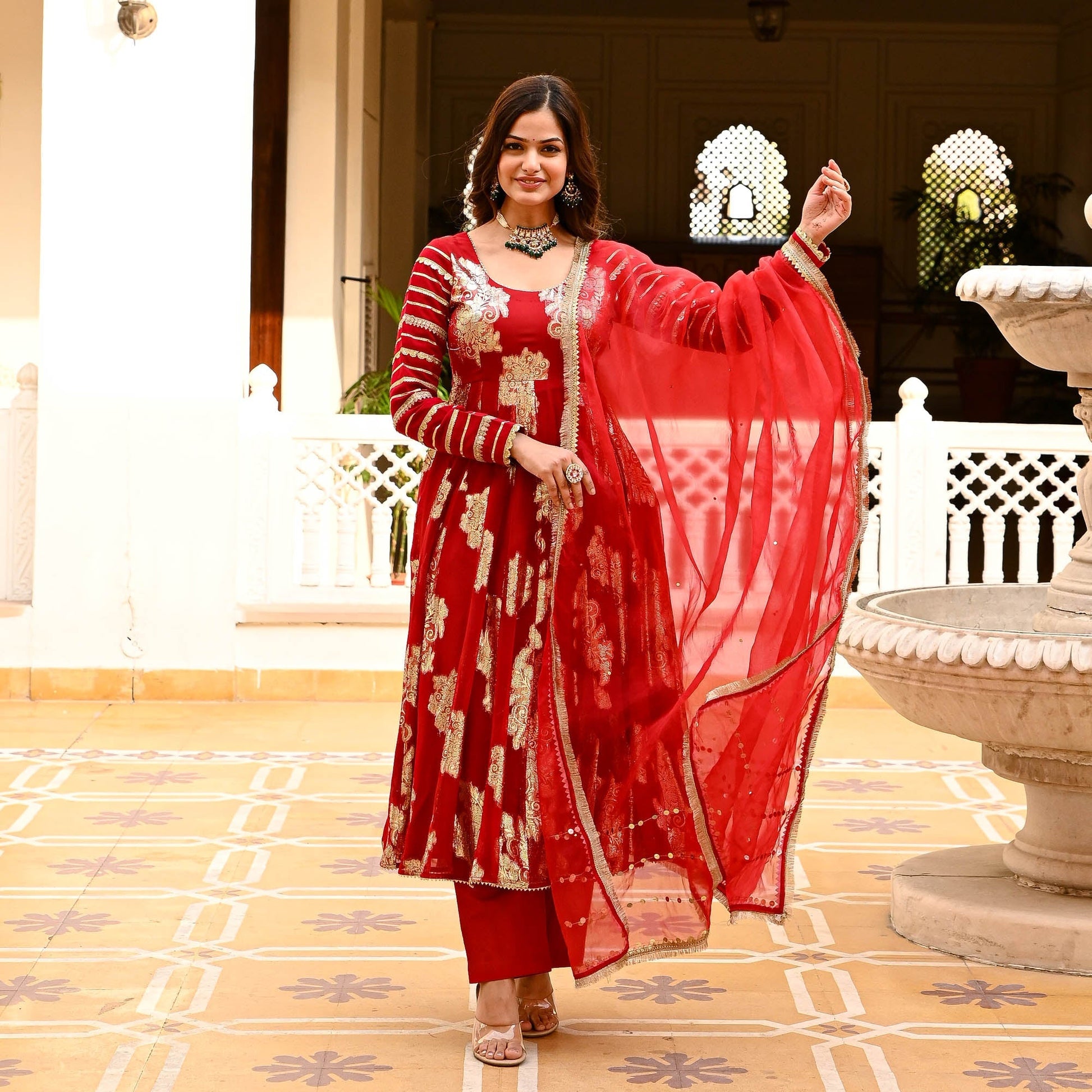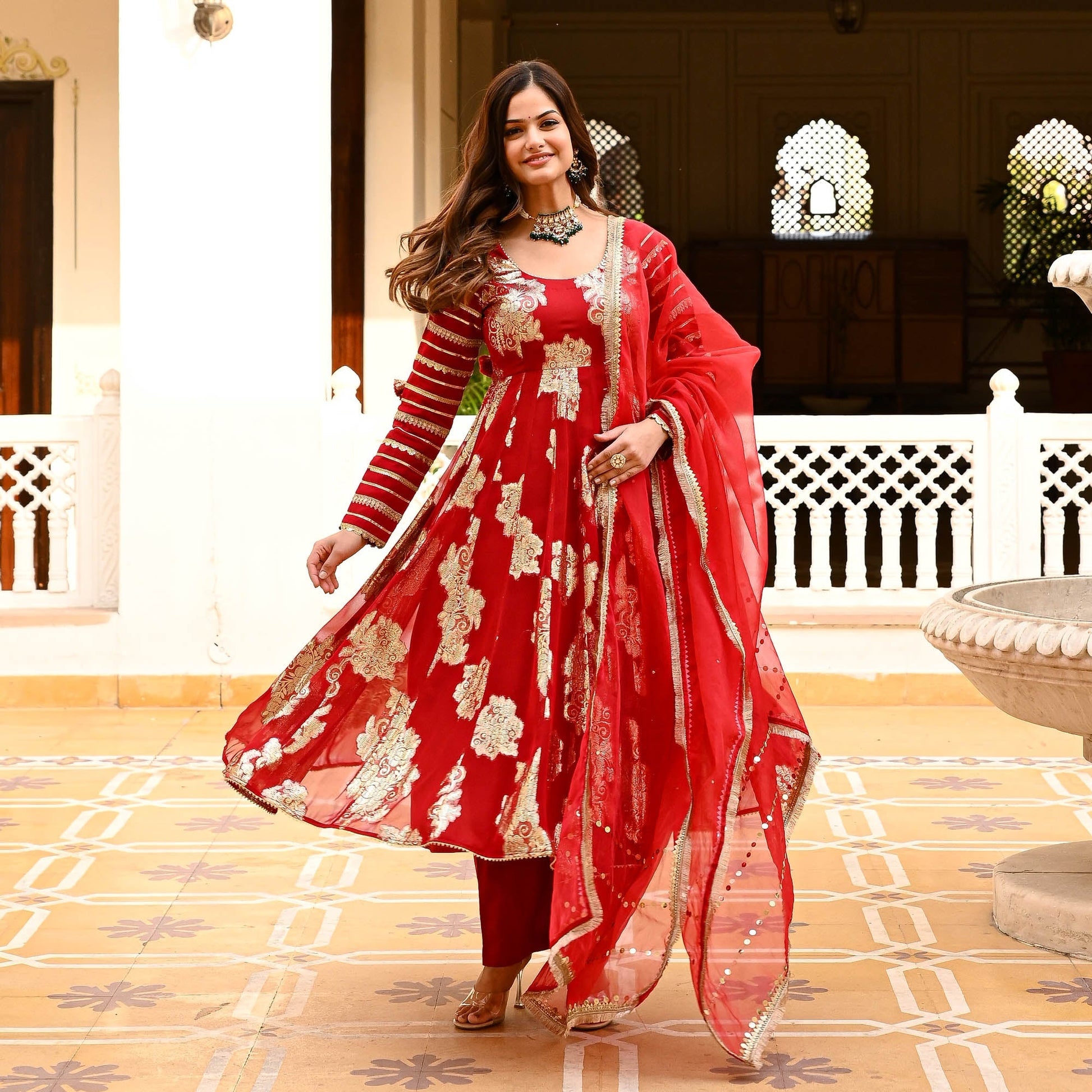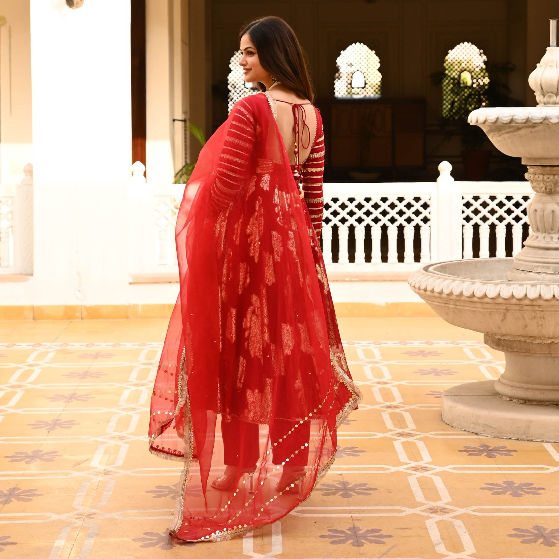 Let your inner diva shine in the ravishing Laila Suit Set, where elegance meets pizazz in a symphony of sophistication. The gorgeous flared kurta is crafted from premium signature jacquard fabrics that lend a regal charm to the suit set. The delicate round neckline is accentuated by the full sleeves that are fully adorned with gota lace detailing. Paired with matching pants and an organza dupatta with sequin embellishments and fringe lace on the edges. Celebrate yourself in the Laila Suit Set with fashion, flair, and fabulousness.
