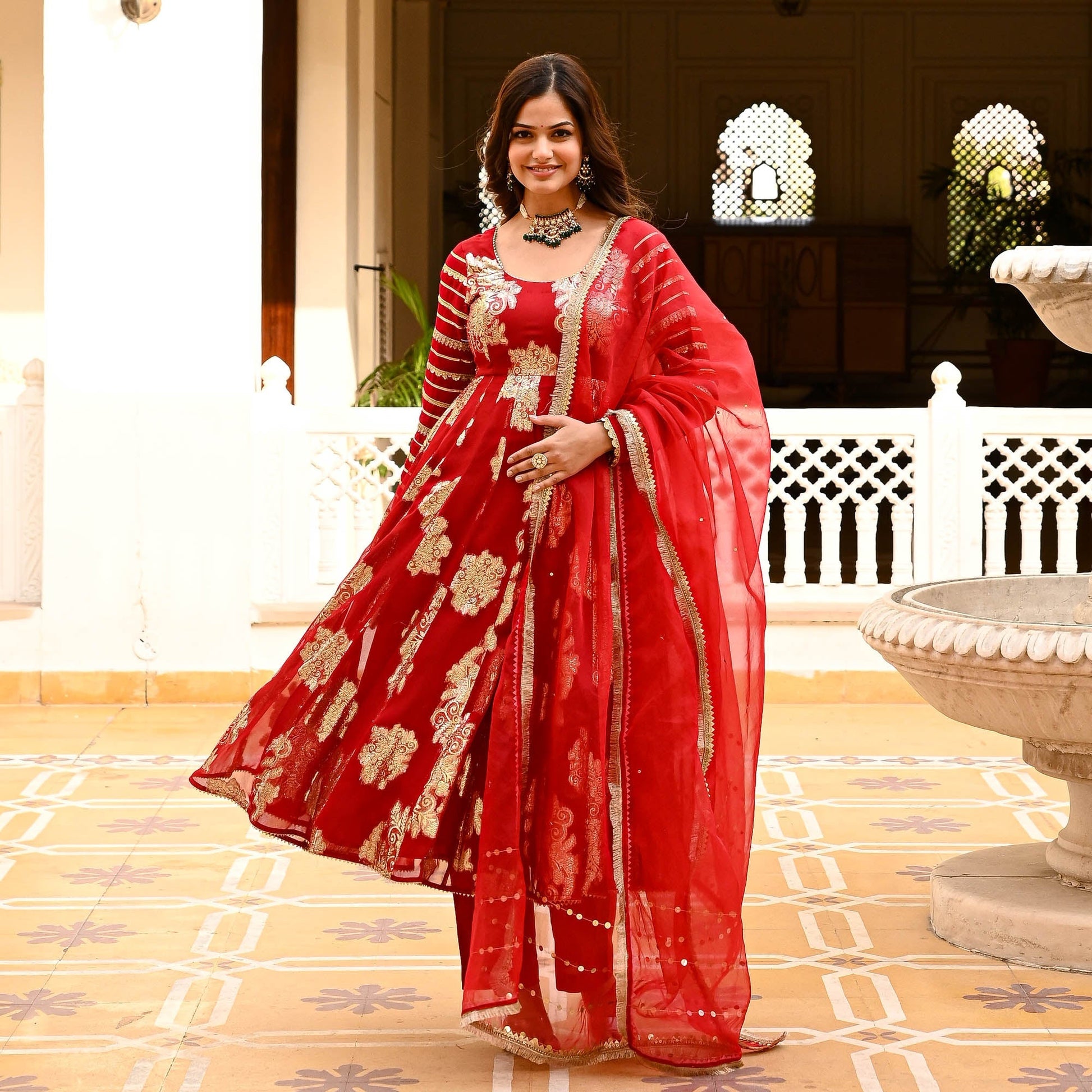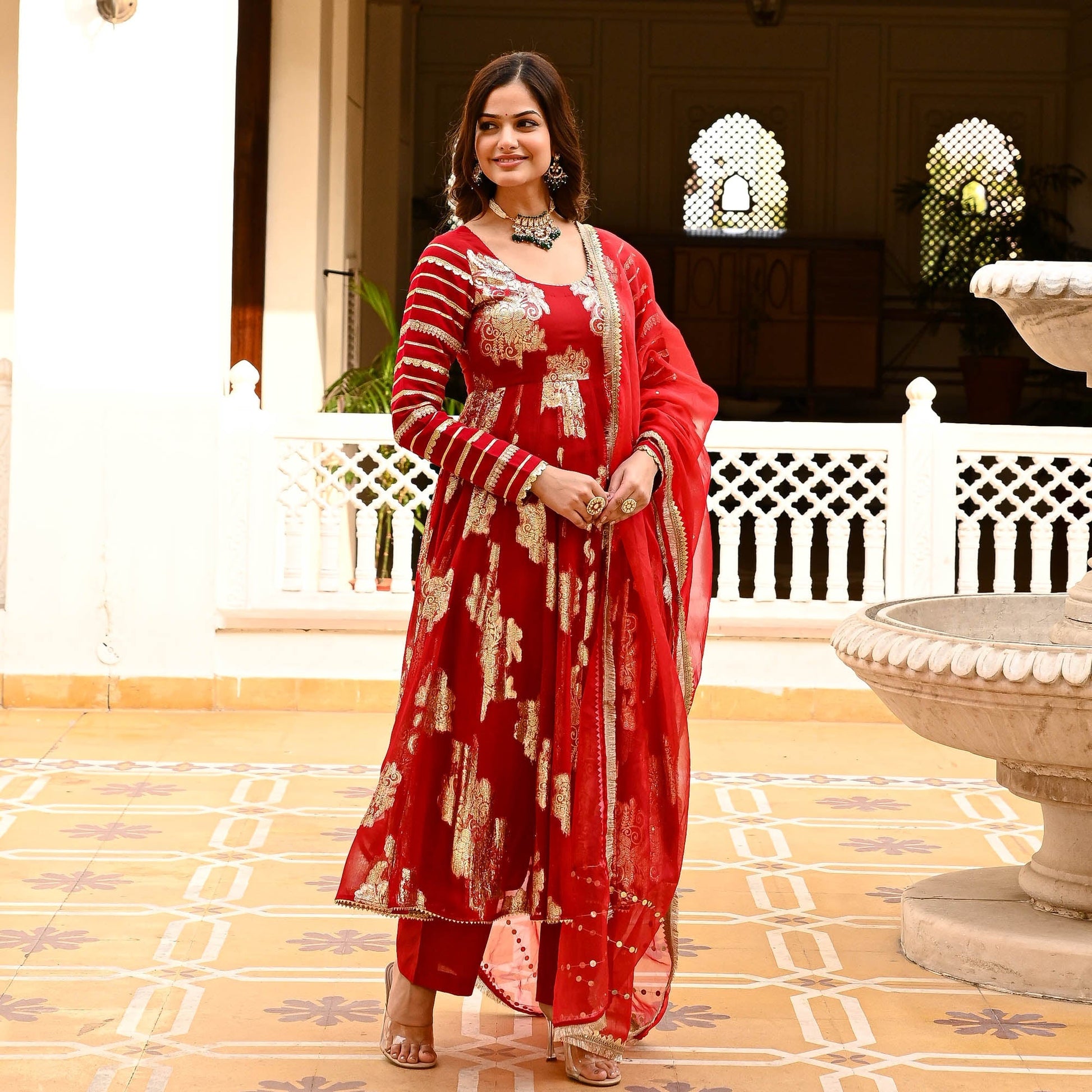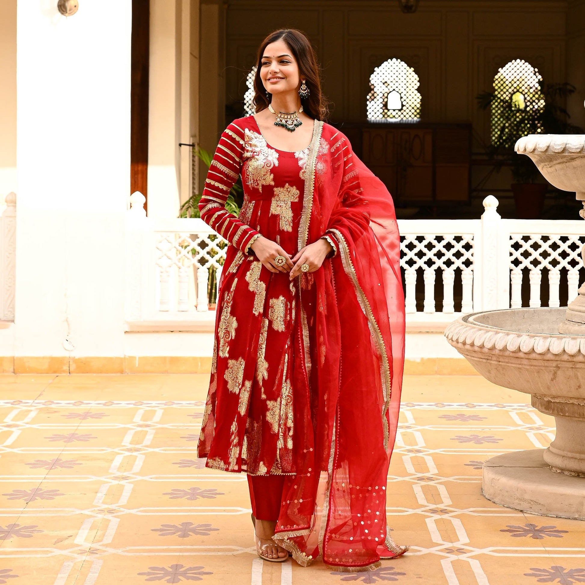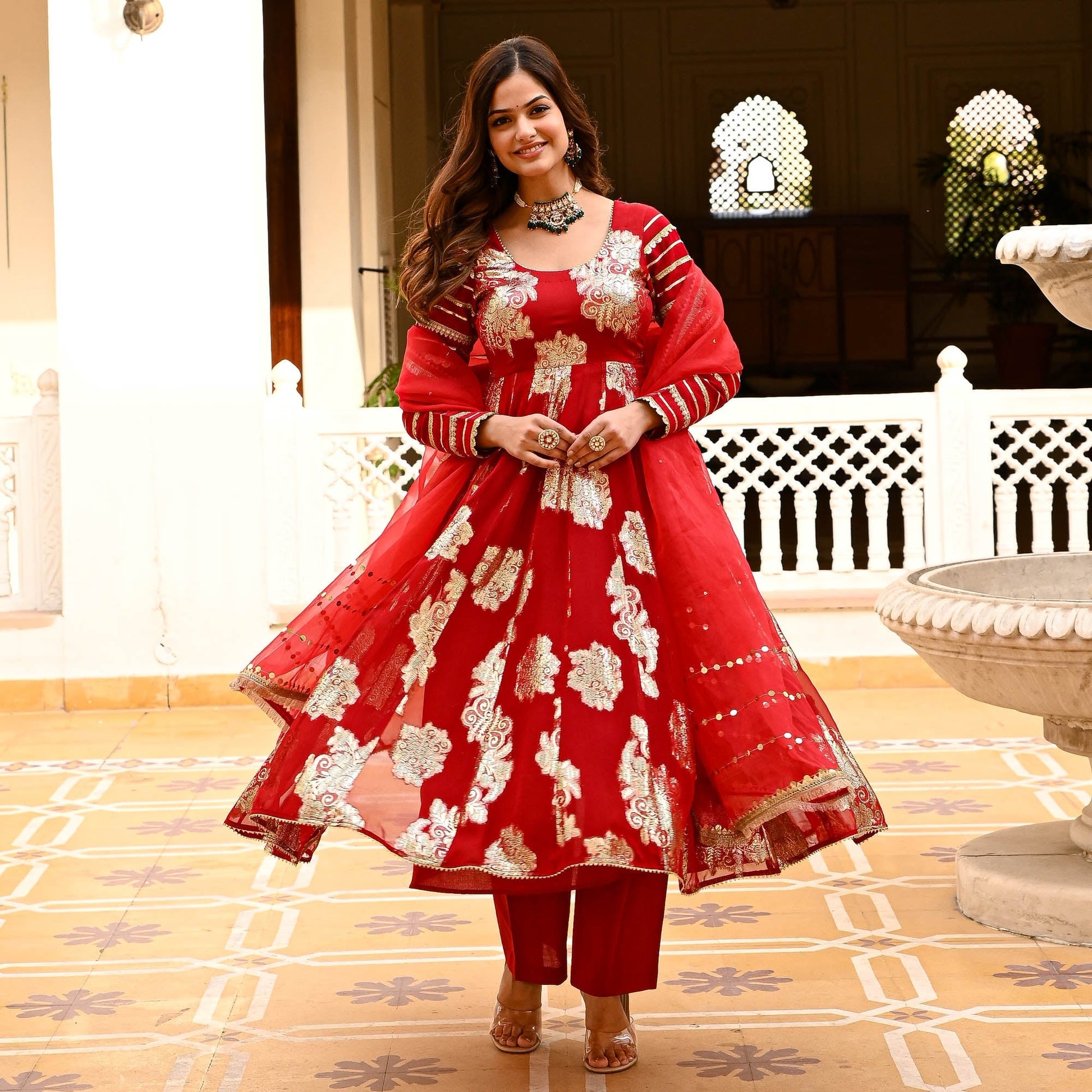 Let your inner diva shine in the ravishing Laila Suit Set, where elegance meets pizazz in a symphony of sophistication. The gorgeous flared kurta is crafted from premium signature jacquard fabrics that lend a regal charm to the suit set. The delicate round neckline is accentuated by the full sleeves that are fully adorned with gota lace detailing. Paired with matching pants and an organza dupatta with sequin embellishments and fringe lace on the edges. Celebrate yourself in the Laila Suit Set with fashion, flair, and fabulousness.