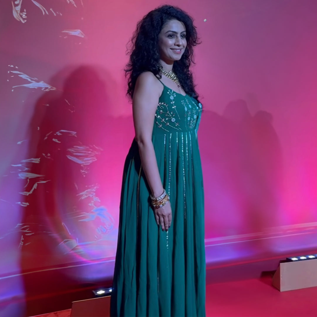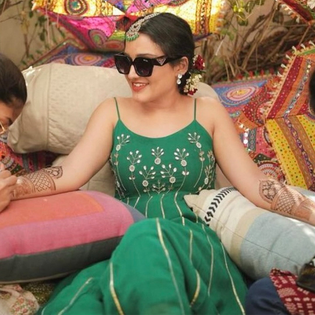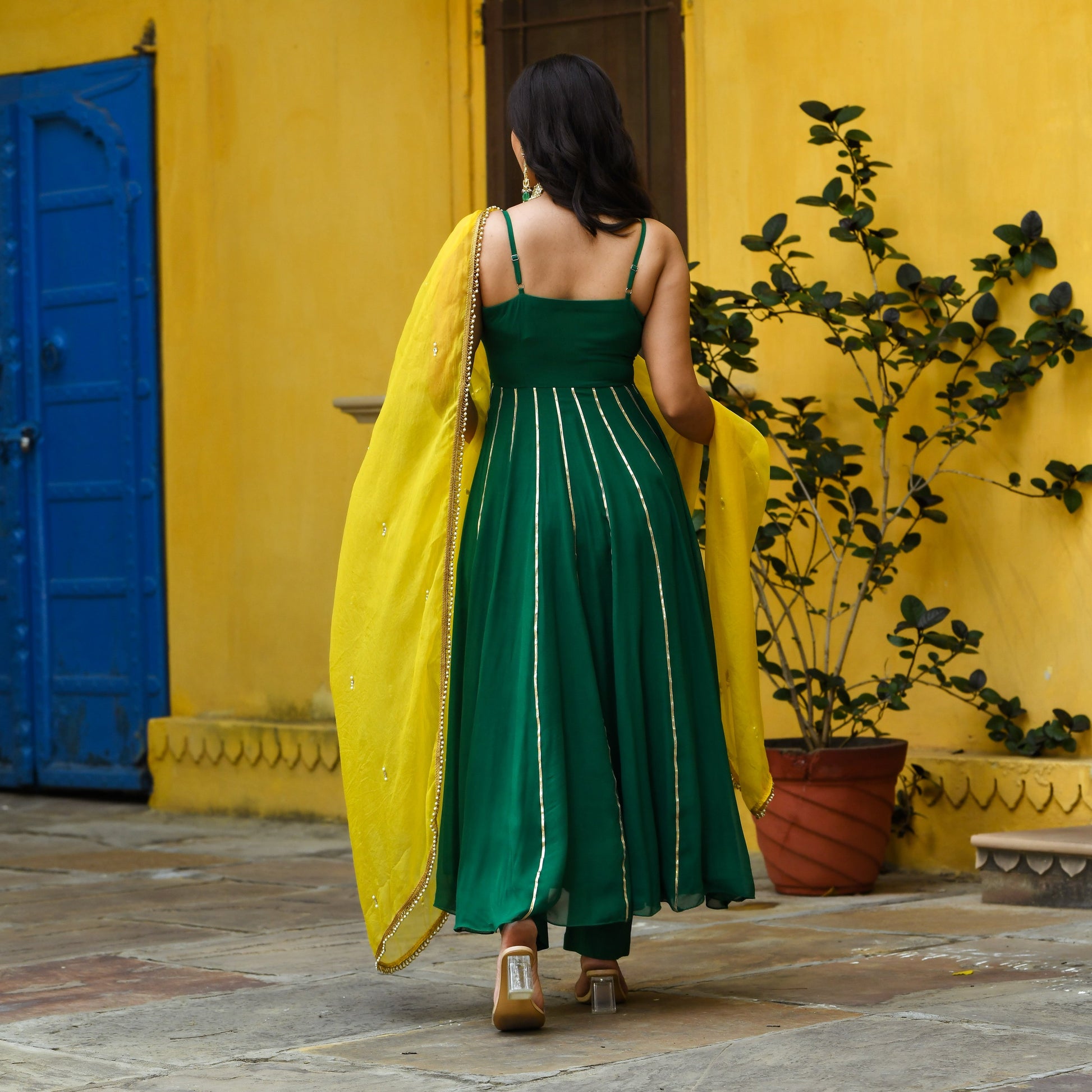 Adorn yourself with the dazzling and beautiful Green & Yellow Anarkali set. This set features golden embroidery on the bust, with matching pants and a yellow dupatta that adds a pop of brightness to the look. This elegant outfit is sure to make you stand out at your next event!
