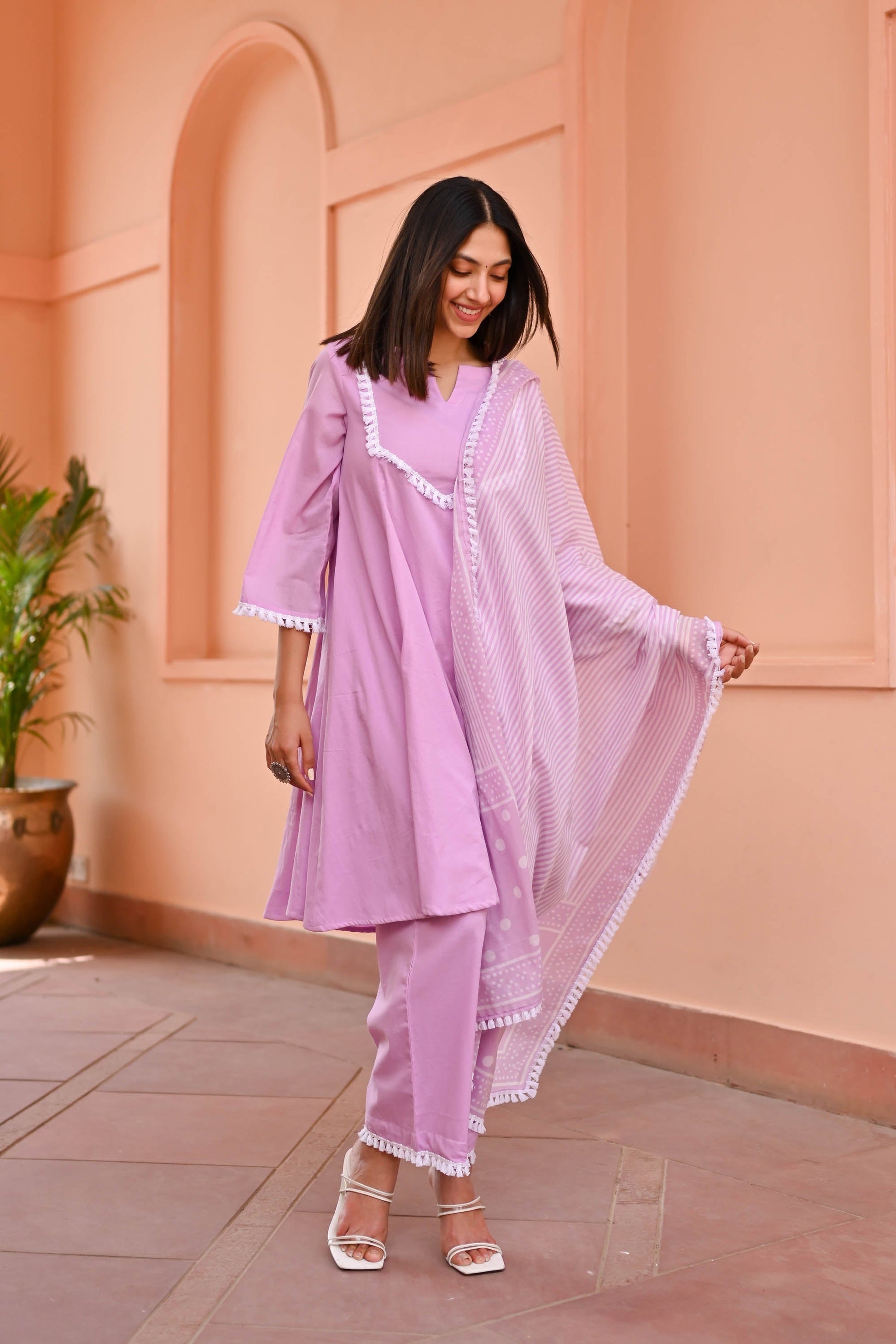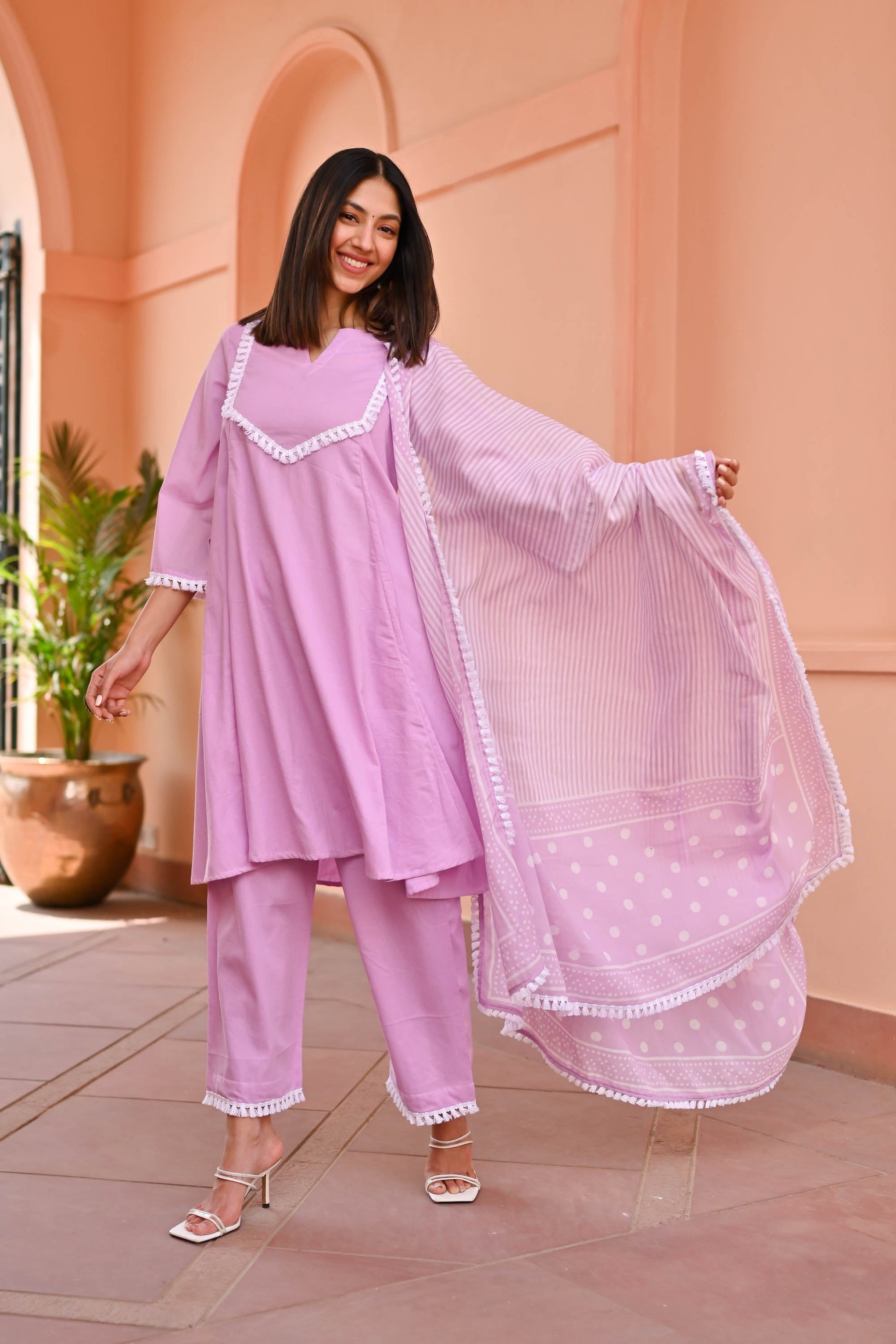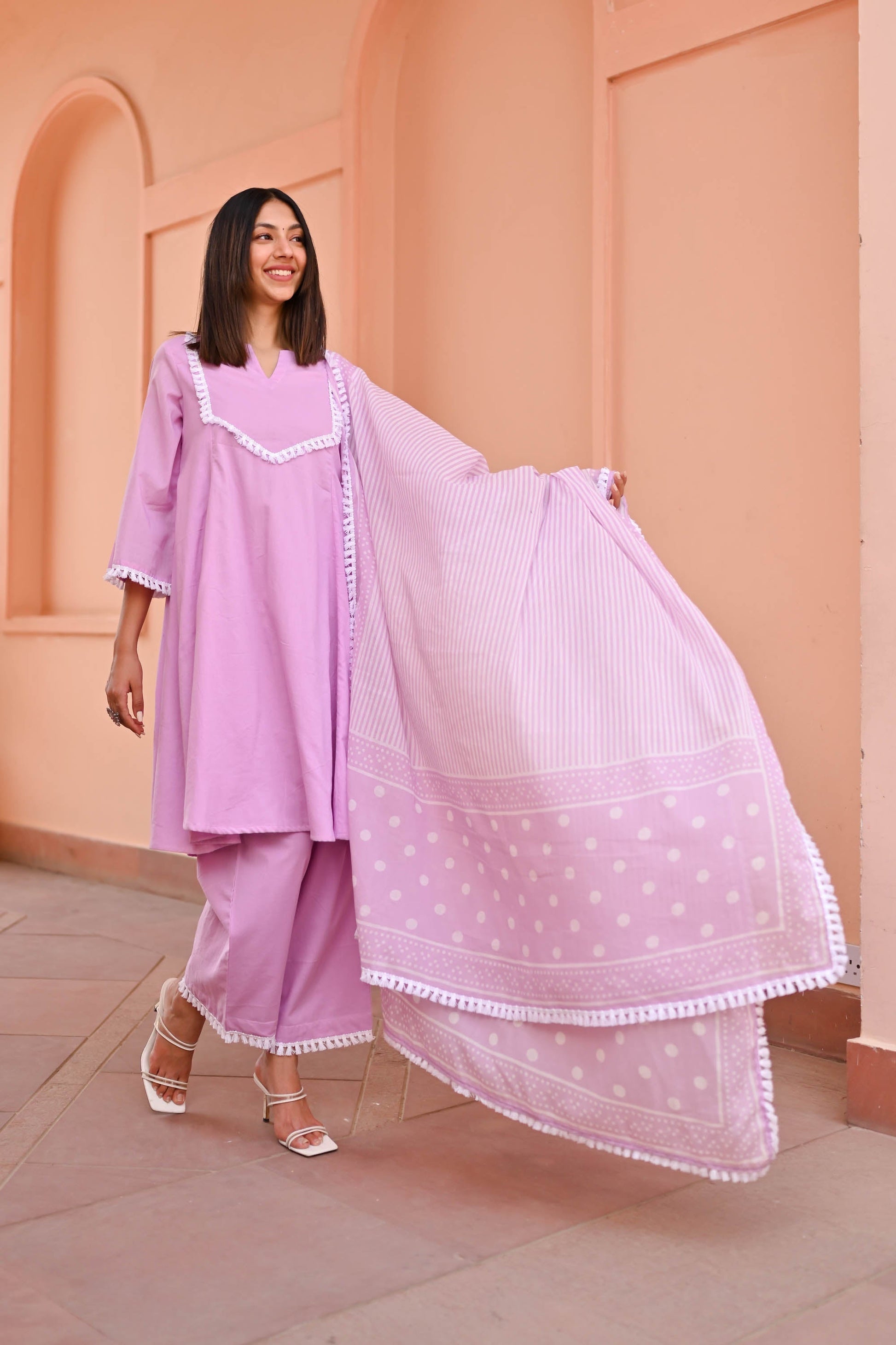 Discover timeless elegance with the Leya Trio Cotton Suit Set. Crafted from premium cotton, its soft lilac hues evoke sophistication. The relaxed-fit kurta features a round neck with a notch, enhanced by delicate lace detailing on the yoke and three-quarter sleeves. Paired seamlessly with matching pants and a printed dupatta, this ensemble epitomizes style and comfort for any occasion. Elevate your style when you dress to perfection in our Mulmul Cotton Suit. Crafted from premium cotton, this Anarkali suit features solid kurta pants paired with a beautifully printed dupatta. Embrace comfort and style in soft lilac hues, perfect for any occasion. Pakistani cotton suits for women exude timeless elegance and grace, offering unmatched breathability and sophistication. Discover the epitome of chic with our cotton Anarkali suit collection today.