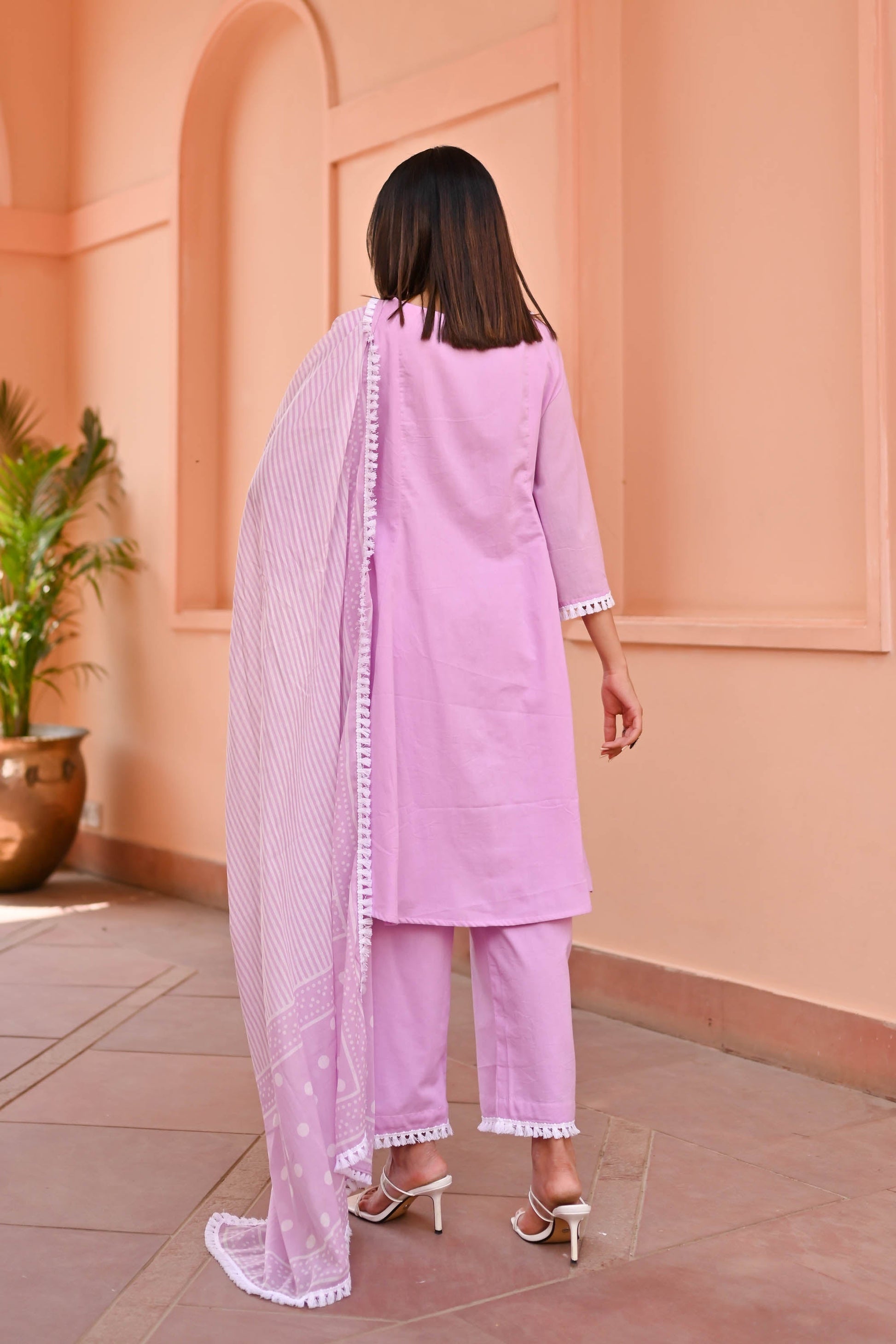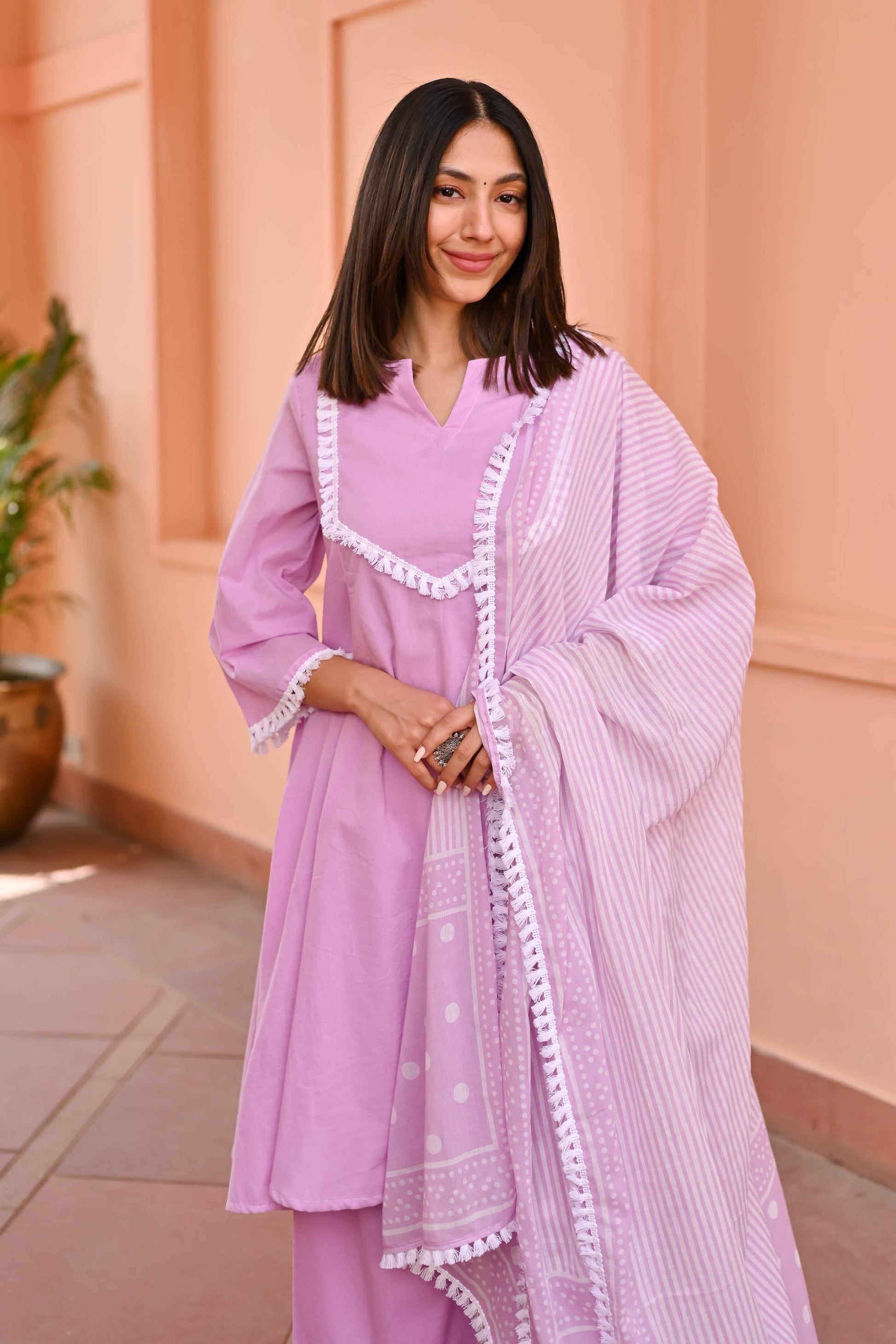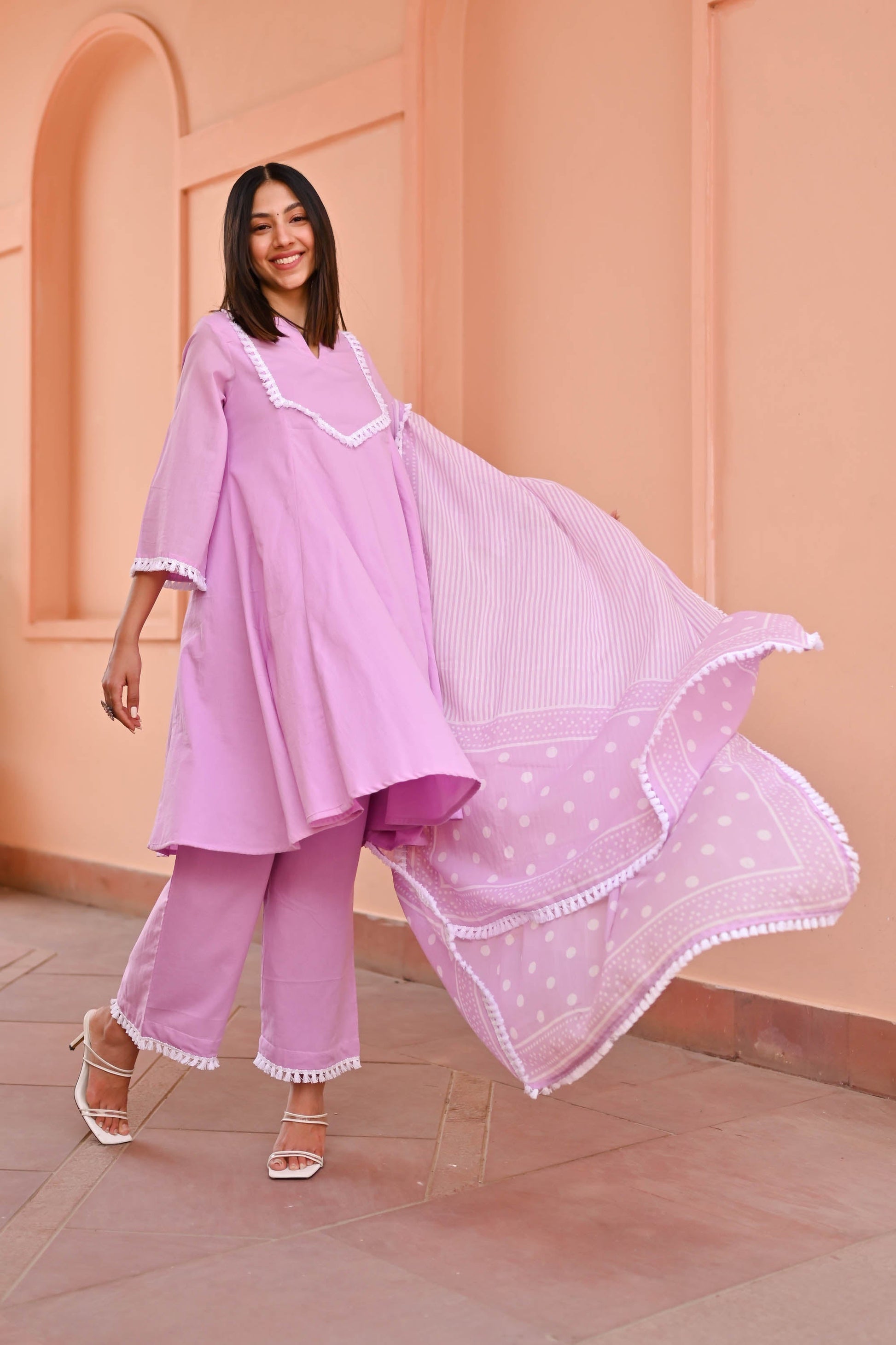 Discover timeless elegance with the Leya Trio Cotton Suit Set. Crafted from premium cotton, its soft lilac hues evoke sophistication. The relaxed-fit kurta features a round neck with a notch, enhanced by delicate lace detailing on the yoke and three-quarter sleeves. Paired seamlessly with matching pants and a printed dupatta, this ensemble epitomizes style and comfort for any occasion. Elevate your style when you dress to perfection in our Mulmul Cotton Suit. Crafted from premium cotton, this Anarkali suit features solid kurta pants paired with a beautifully printed dupatta. Embrace comfort and style in soft lilac hues, perfect for any occasion. Pakistani cotton suits for women exude timeless elegance and grace, offering unmatched breathability and sophistication. Discover the epitome of chic with our cotton Anarkali suit collection today.