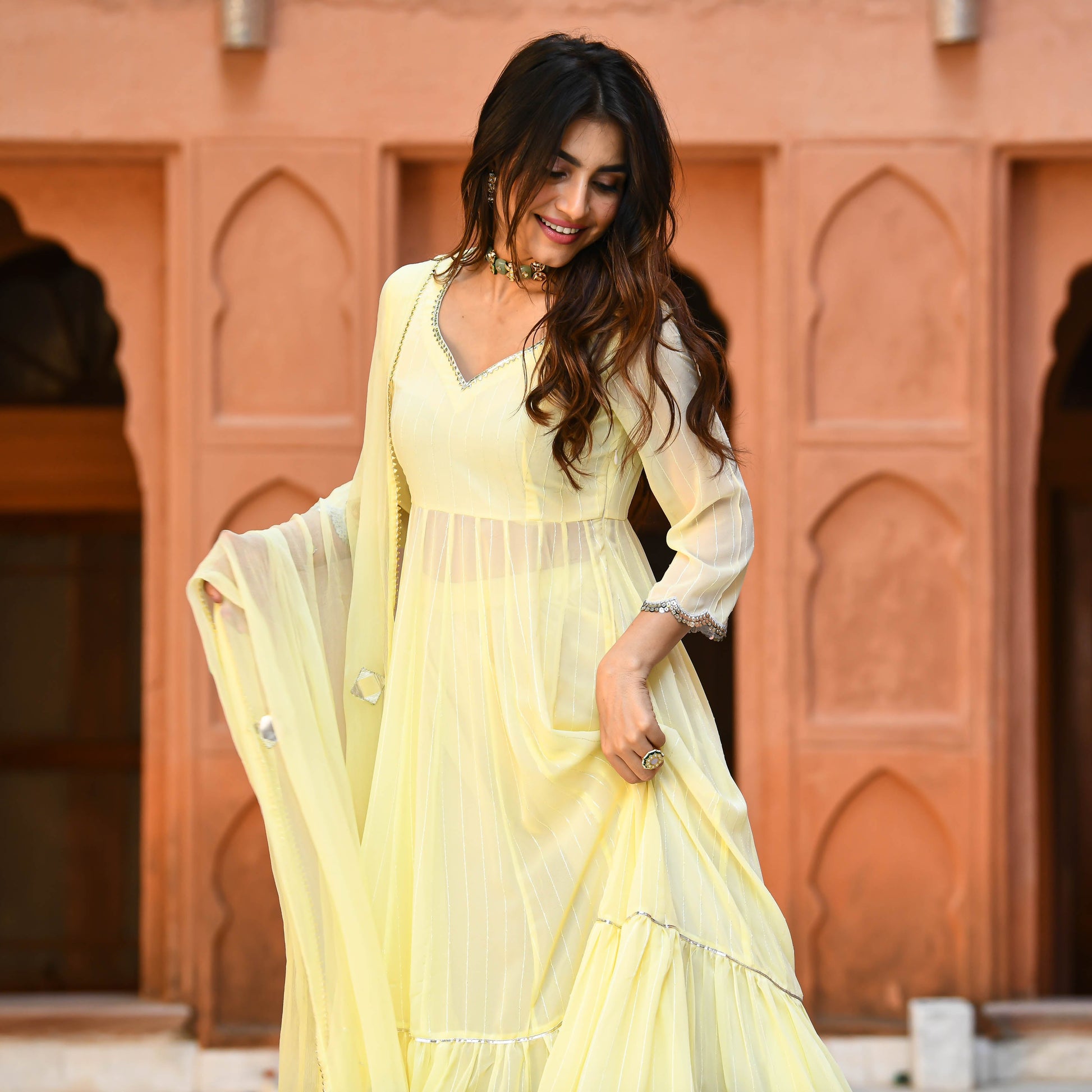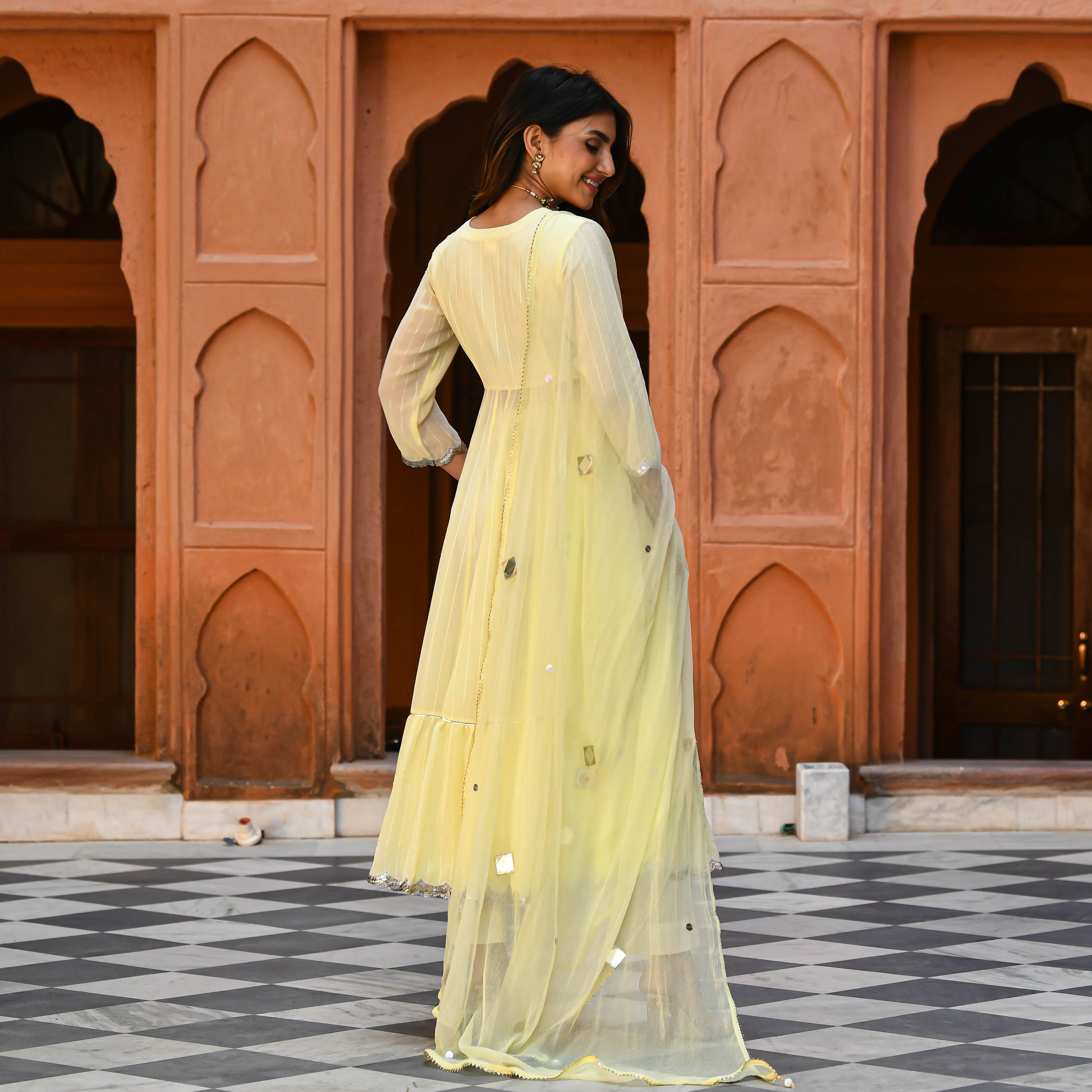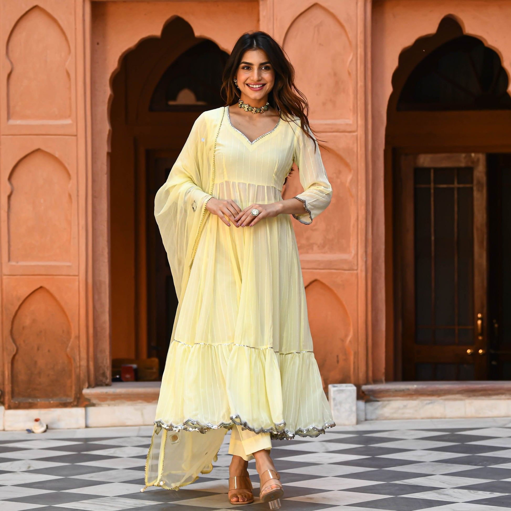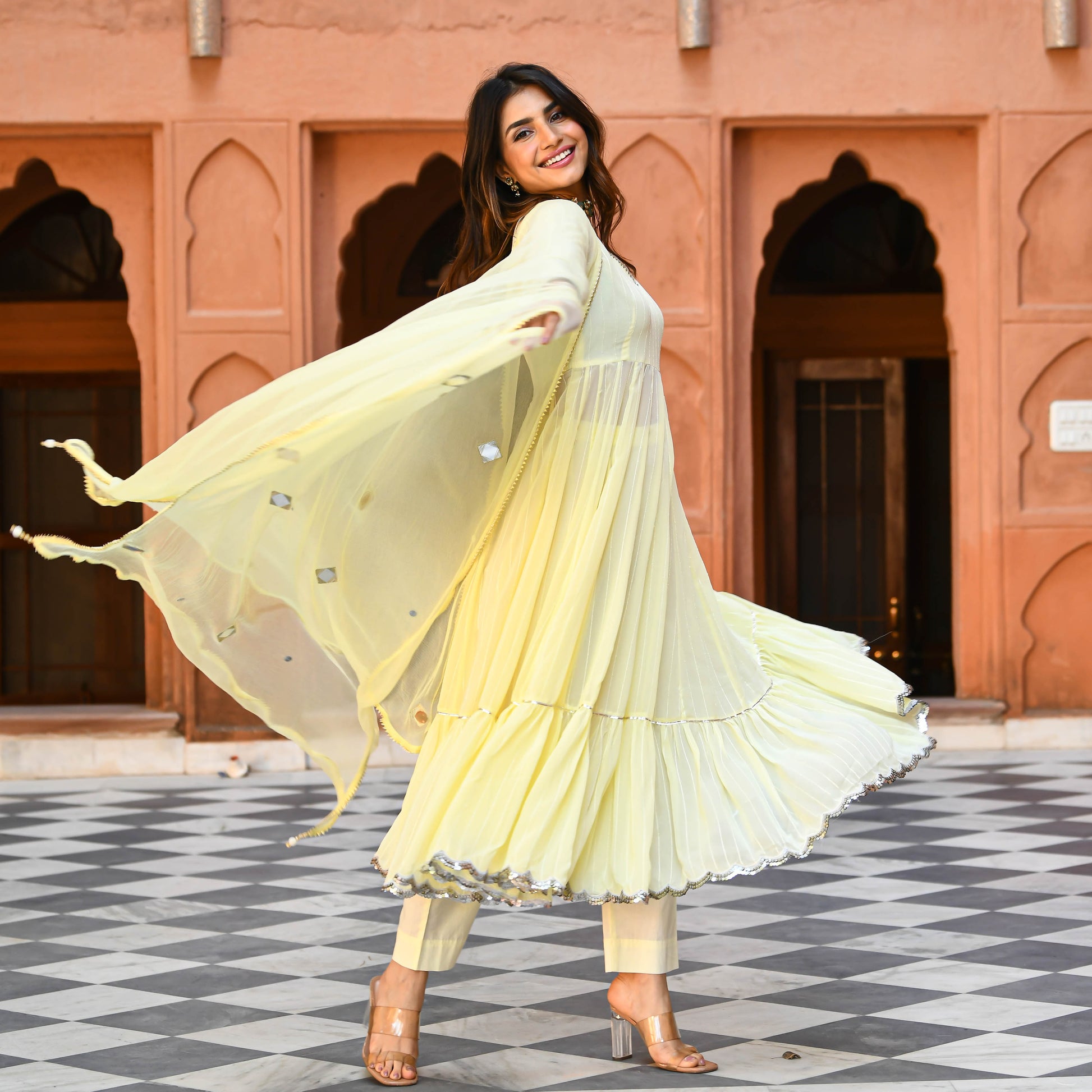 The chicest of all colours, this Suit Set is here to only steal hearts. The light yellow colour adds a touch of sunshine and brightness to your look, while the intricate mirror work adds a touch of shimmer and sparkle. The Anarkali silhouette is flowy and comfortable, making it perfect for weddings or family gatherings. The set includes a beautiful Anarkali kurta with intricate mirror work, paired with matching flared pants, and a coordinating dupatta with a border of the same mirror work.