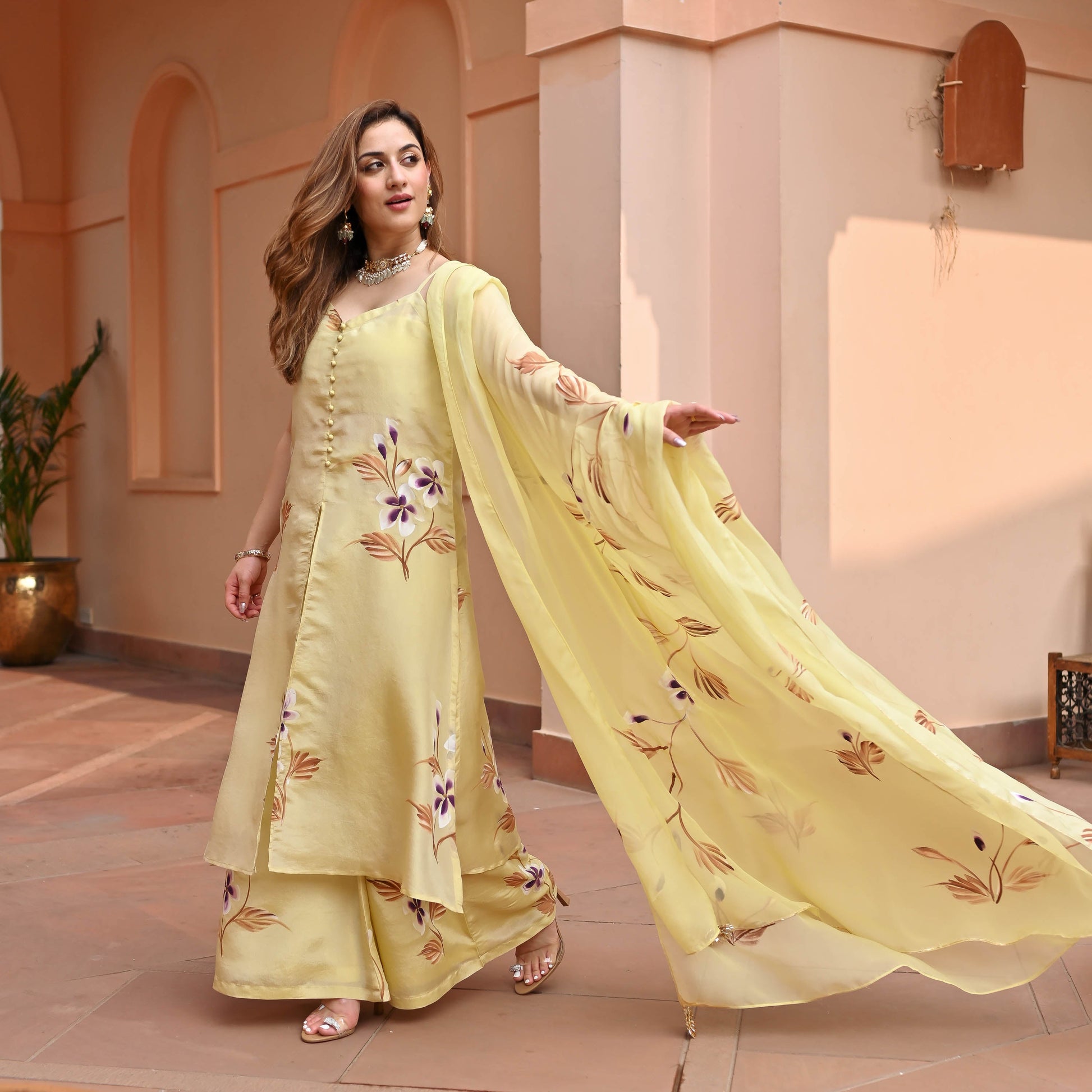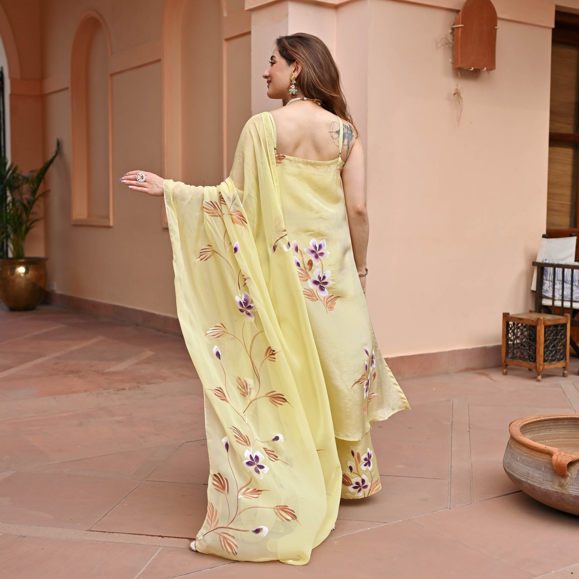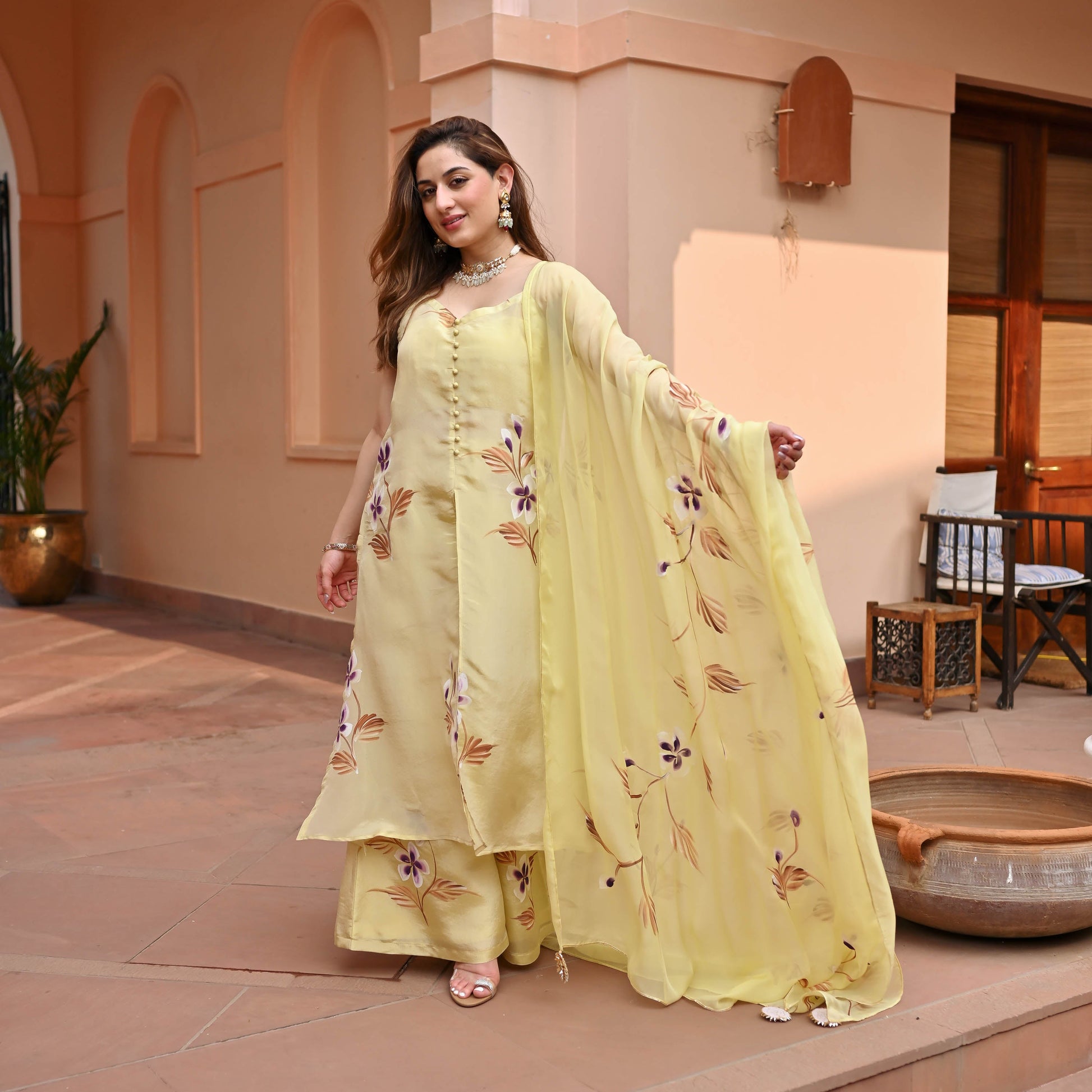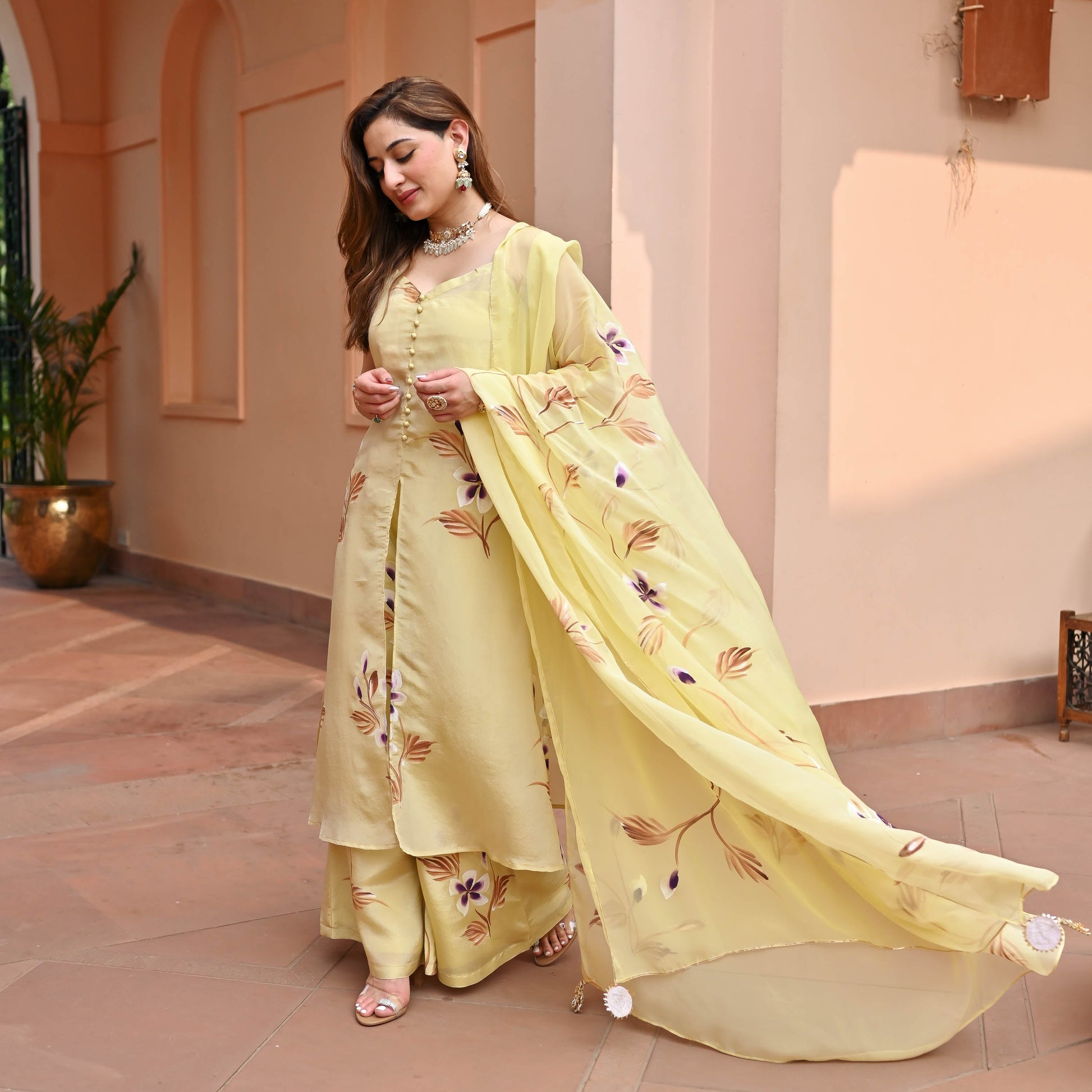Embrace graceful elegance with the Light Yellow Tissue Silk Suit Set. This light yellow handpainted kurta features a relaxed fit, V-neck, strappy sleeves, and buttons down the front placket with a stylish front slit. The straight-fit silhouette is paired with matching pants and a dupatta, offering a chic blend of comfort and sophistication for any occasion.