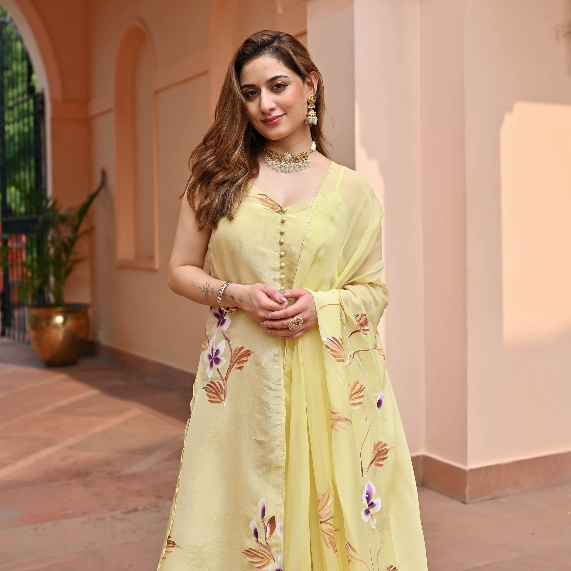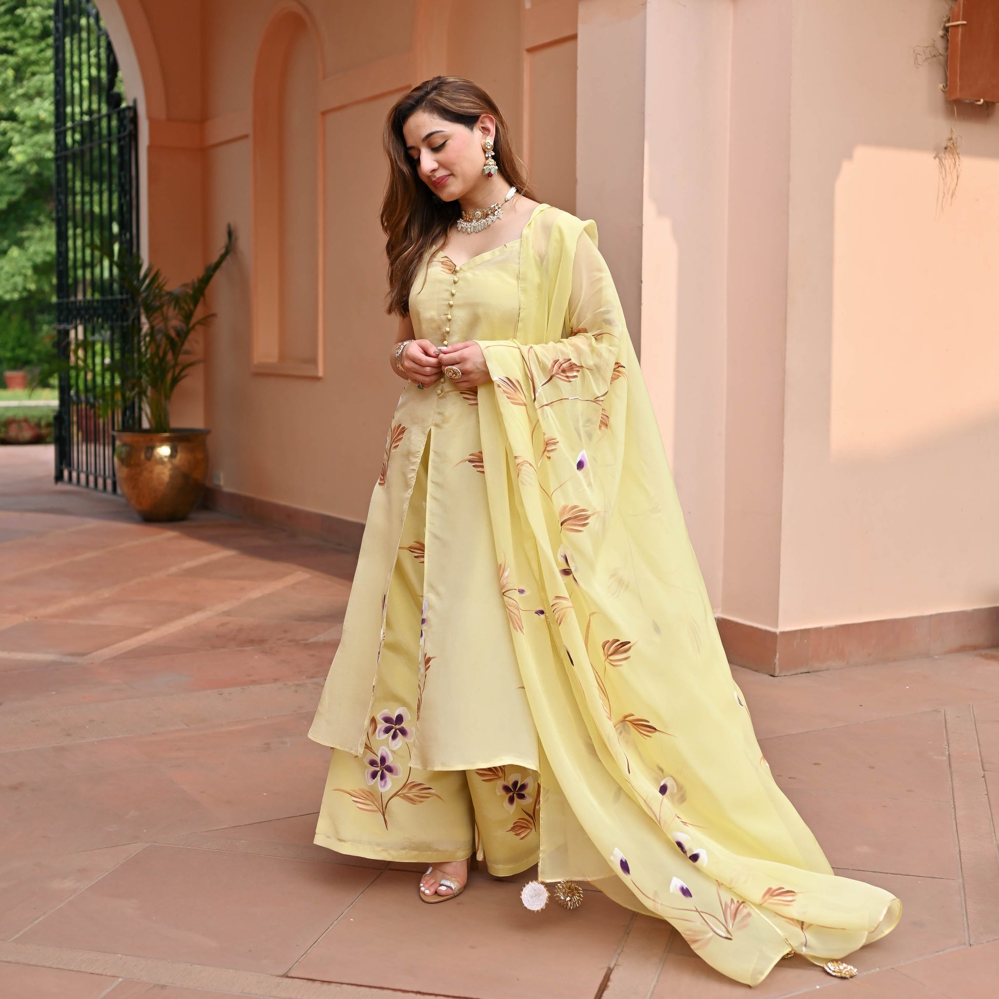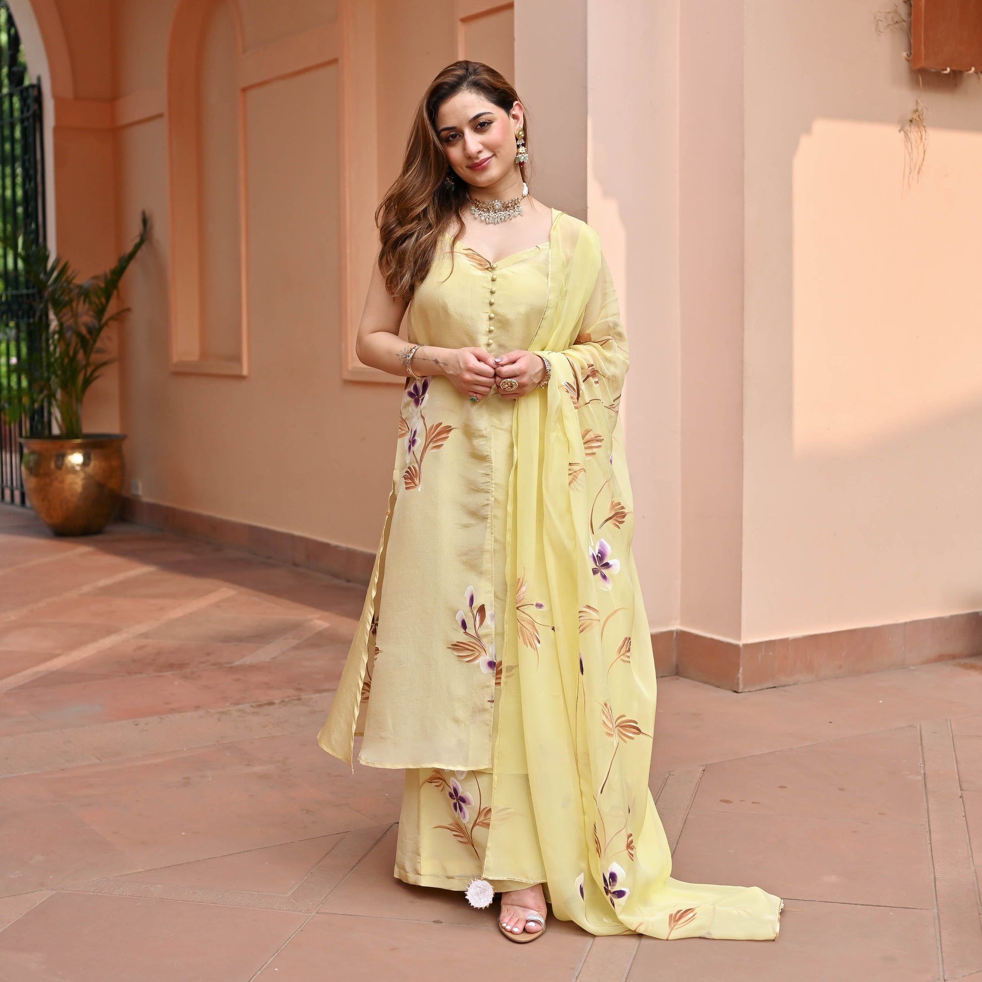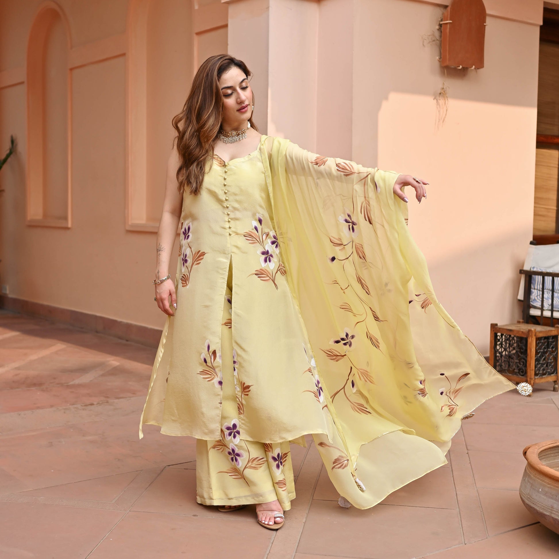 Embrace graceful elegance with the Light Yellow Tissue Silk Suit Set. This light yellow handpainted kurta features a relaxed fit, V-neck, strappy sleeves, and buttons down the front placket with a stylish front slit. The straight-fit silhouette is paired with matching pants and a dupatta, offering a chic blend of comfort and sophistication for any occasion.