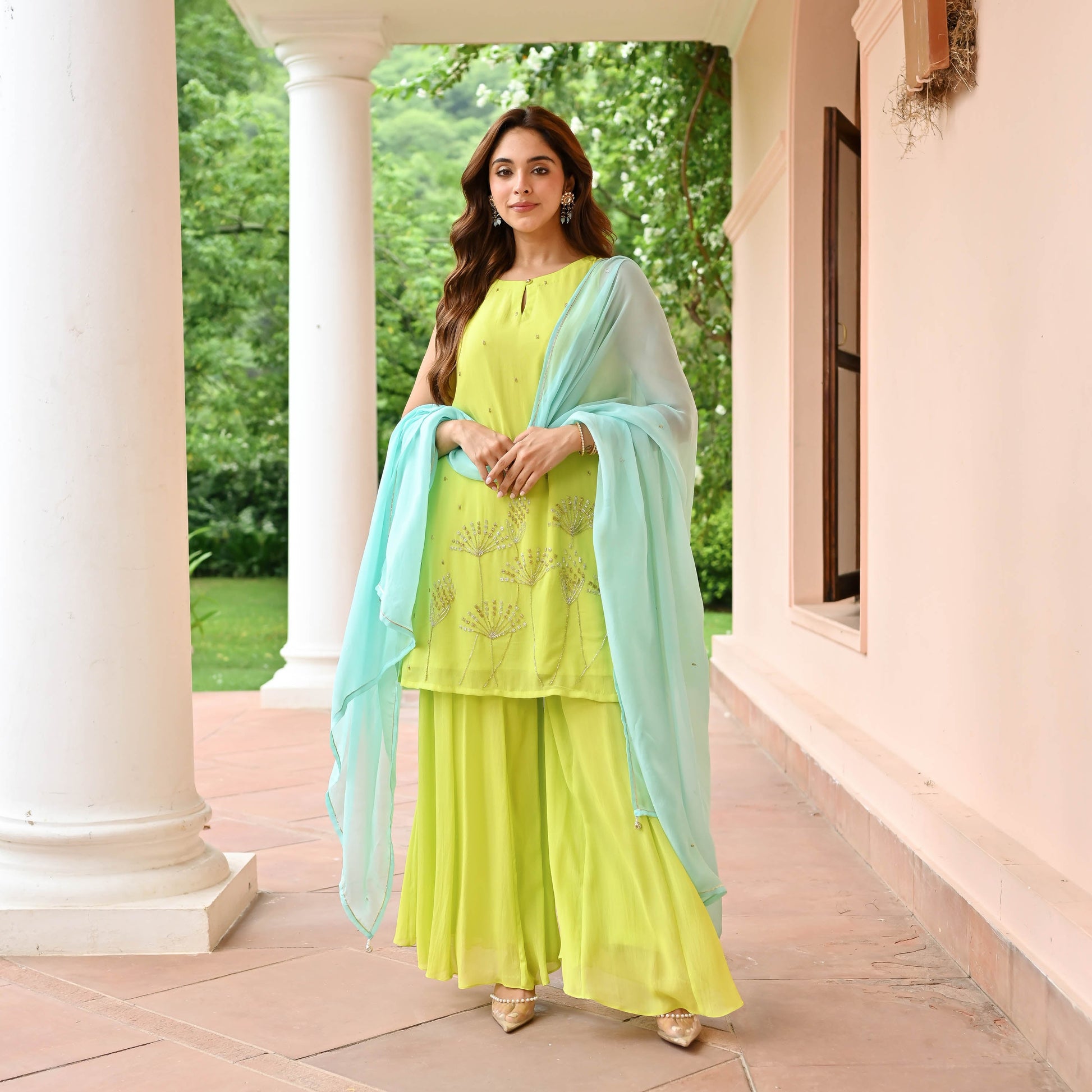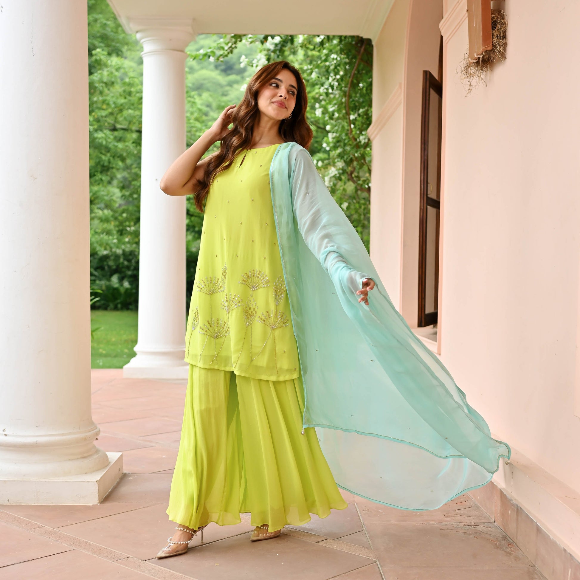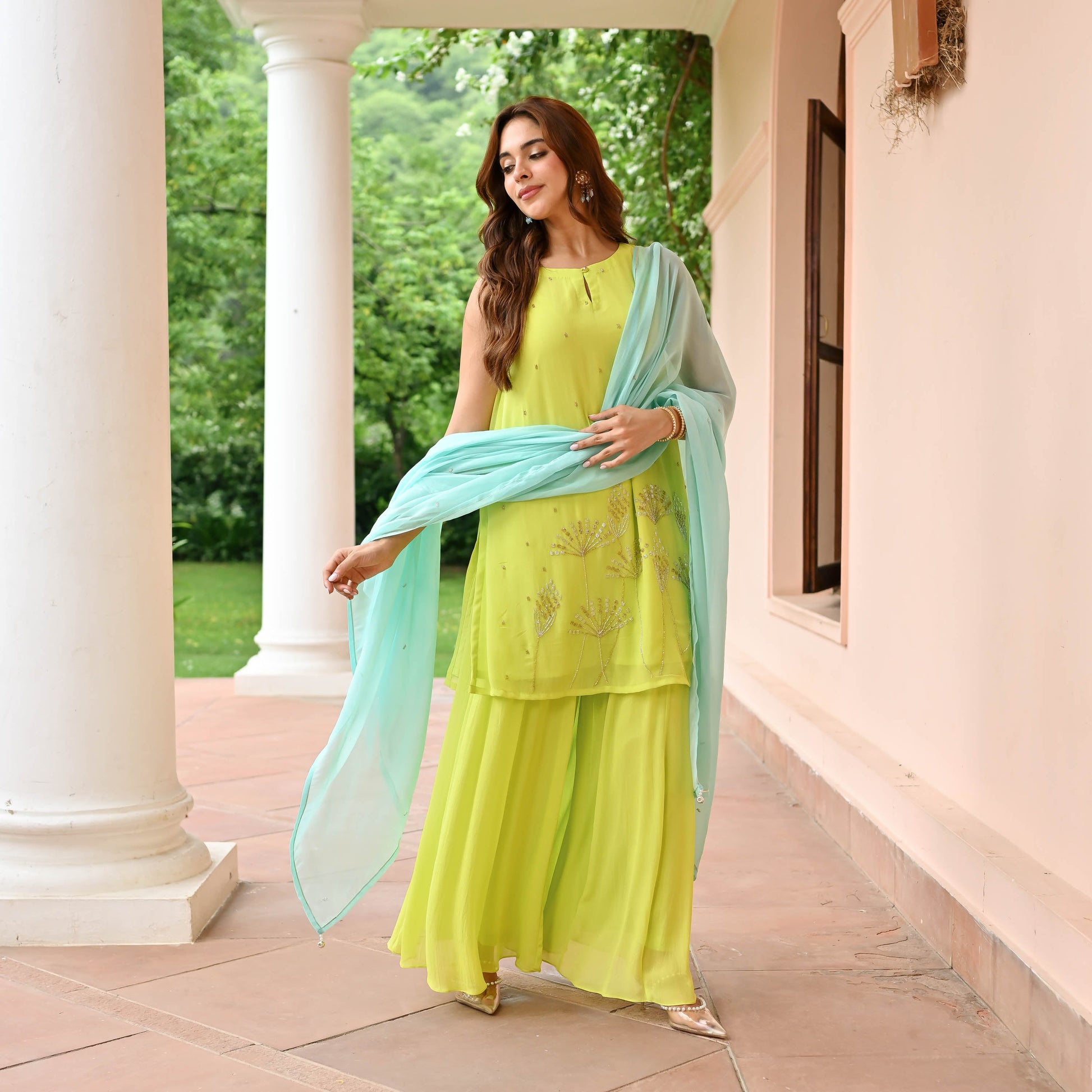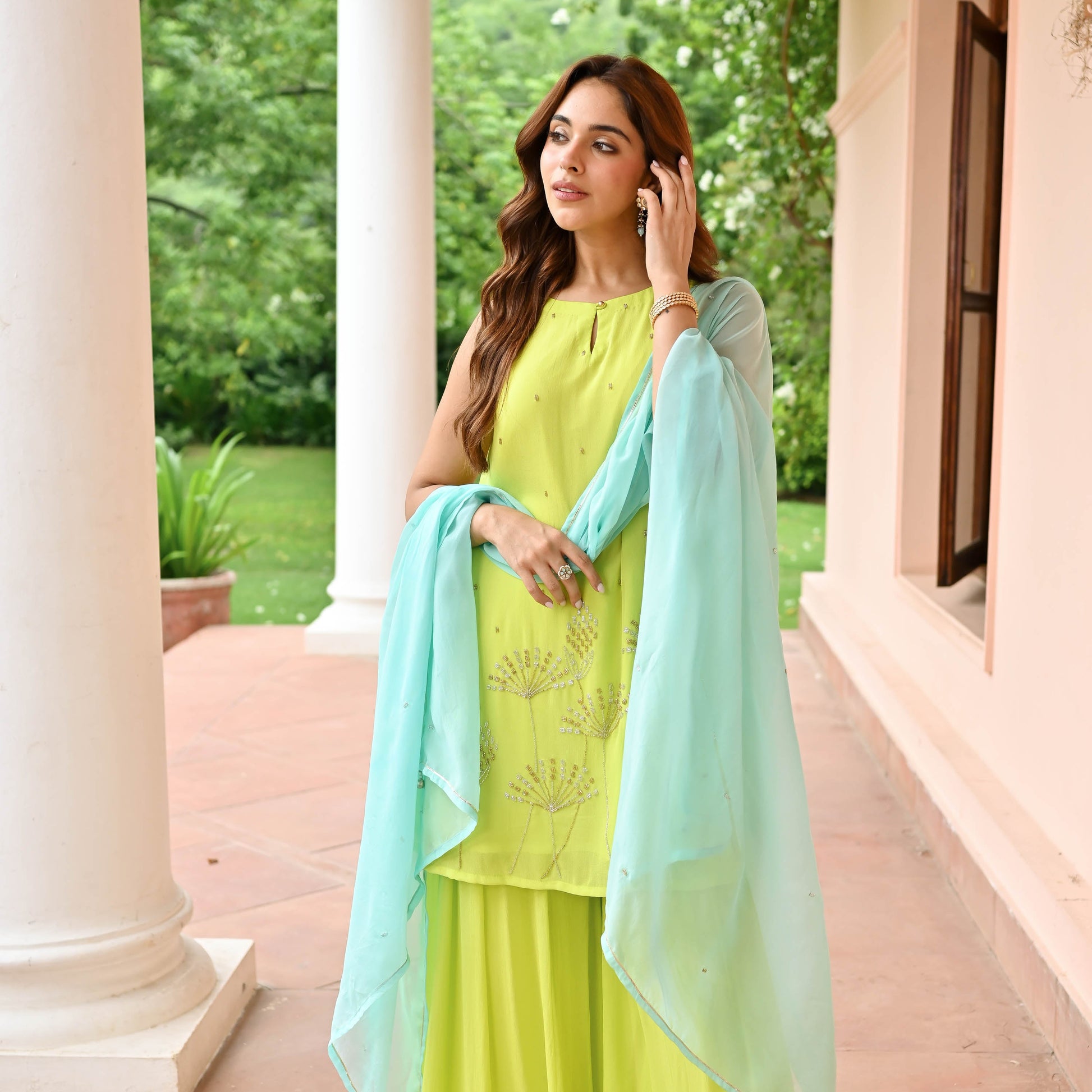 Illuminate your look with the Lime Mint Georgette Suit Set. The vibrant lime green hue is enhanced by luxurious georgette fabric, featuring a sleeveless straight kurta with a keyhole neckline, detailed placement embellishments, and a heavy floral design on the hemline. Paired with flared palazzo pants and a contrasting blue dupatta with sequin embellishments, this set exudes elegance and charm.