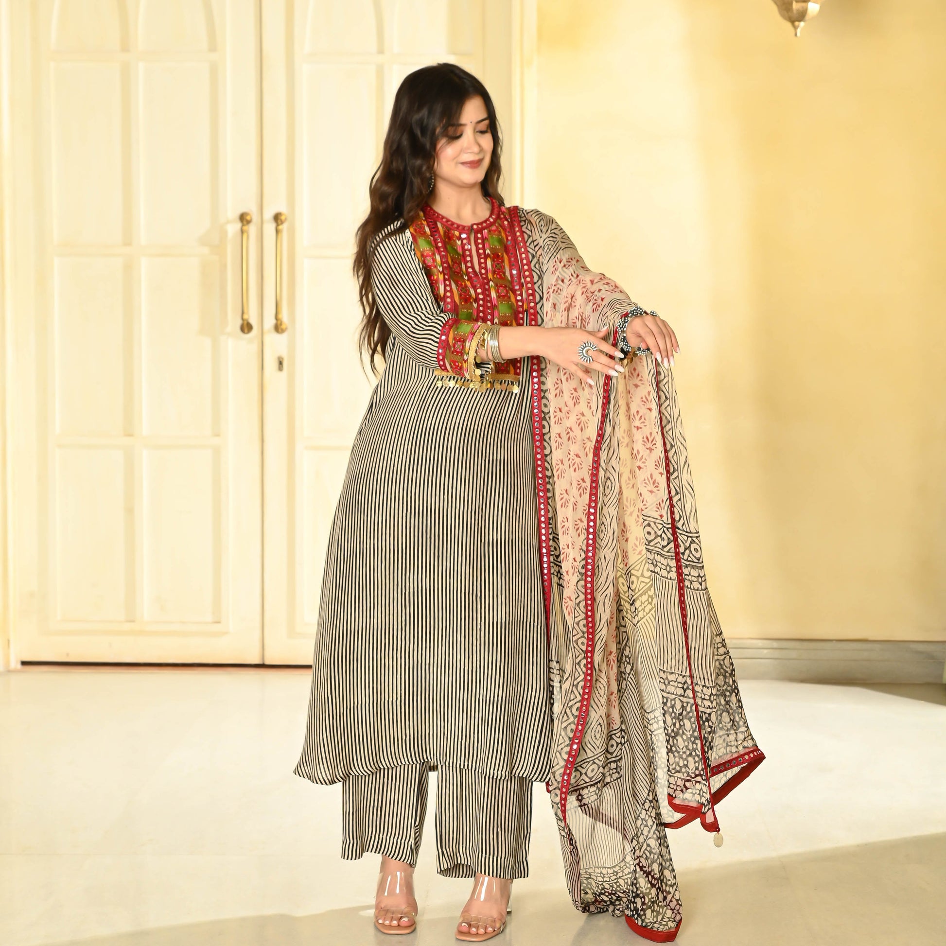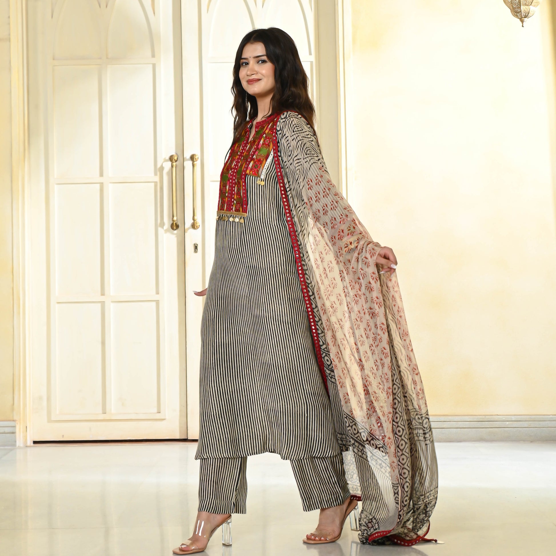 Our Lines Natural Dye Suit Set is where artistry meets elegance. Crafted from sumptuous cotton silk fabric, this ensemble showcases the exquisite craftsmanship of natural dye techniques. Adorned with intricate mirror and sequin work, the multicolour neckline adds a vibrant touch to your attire.