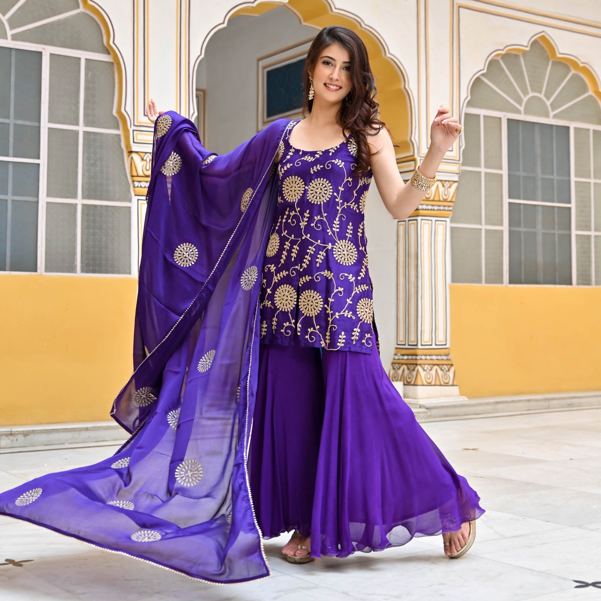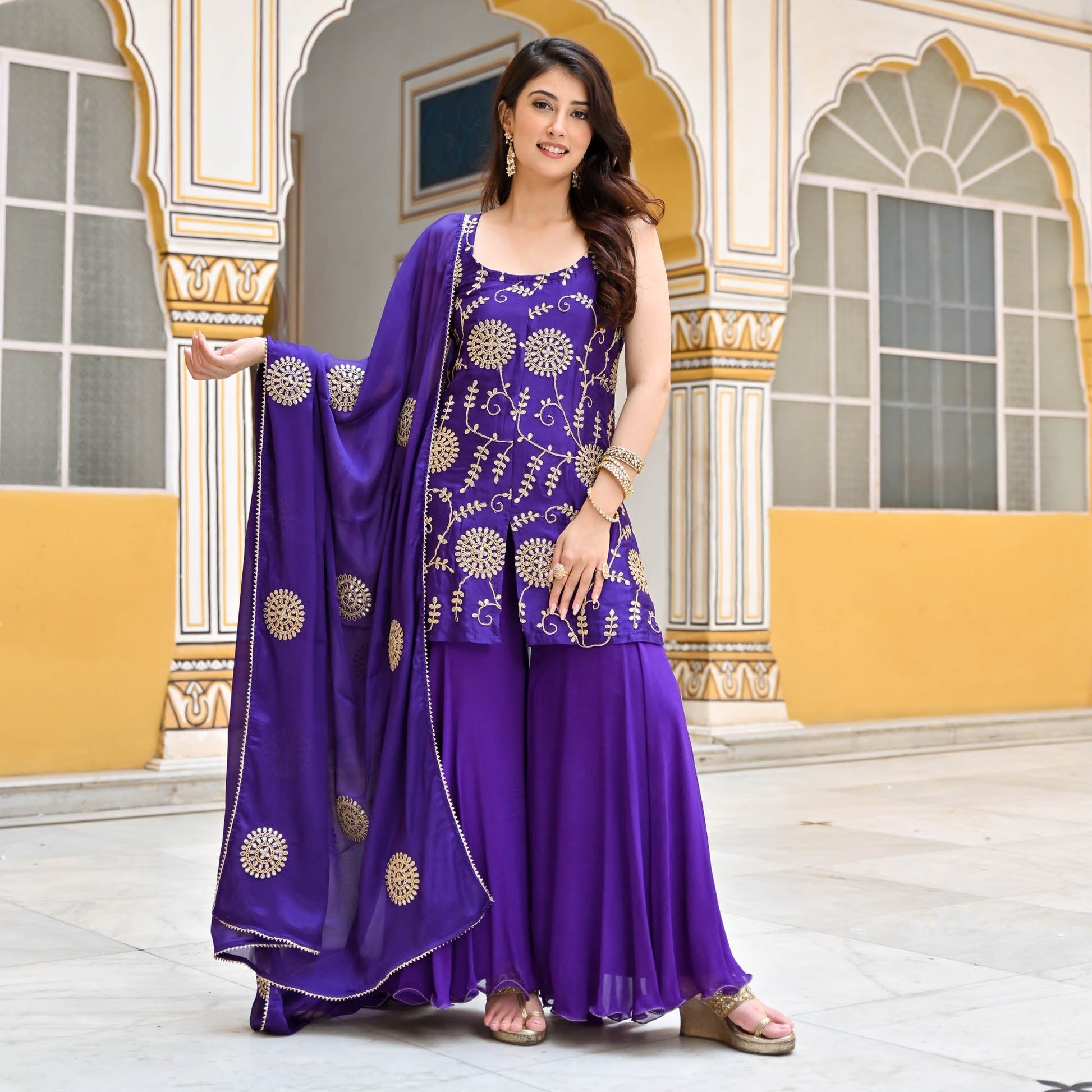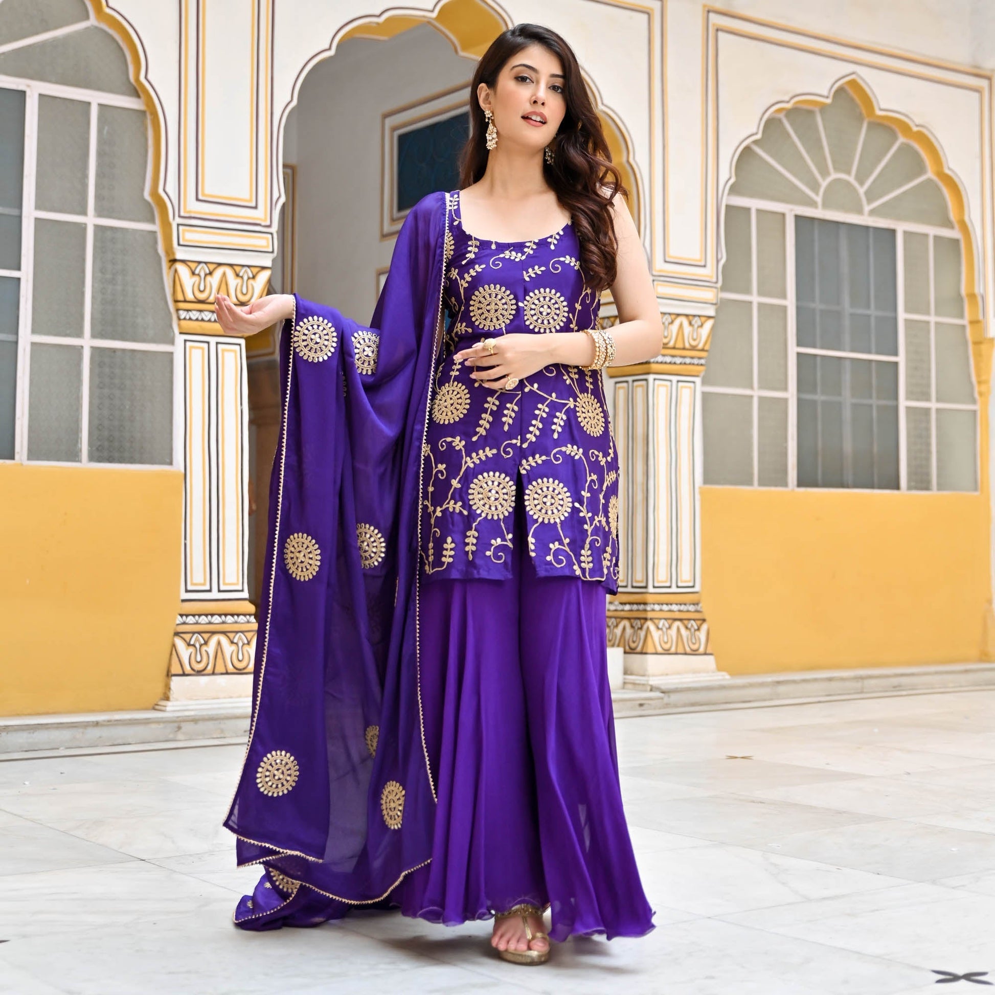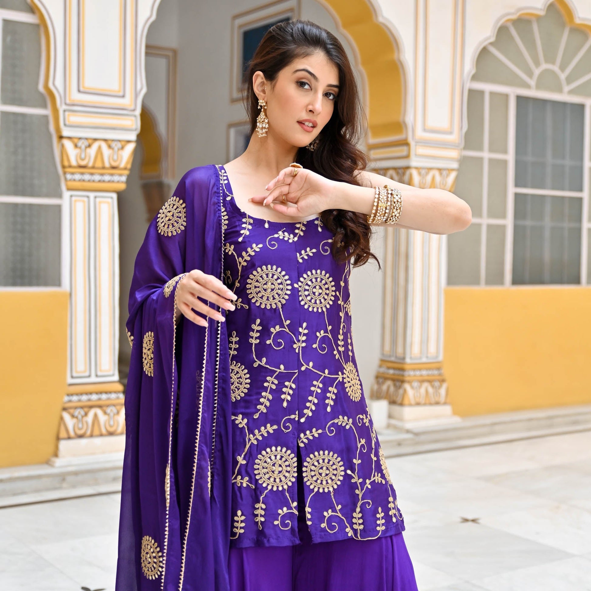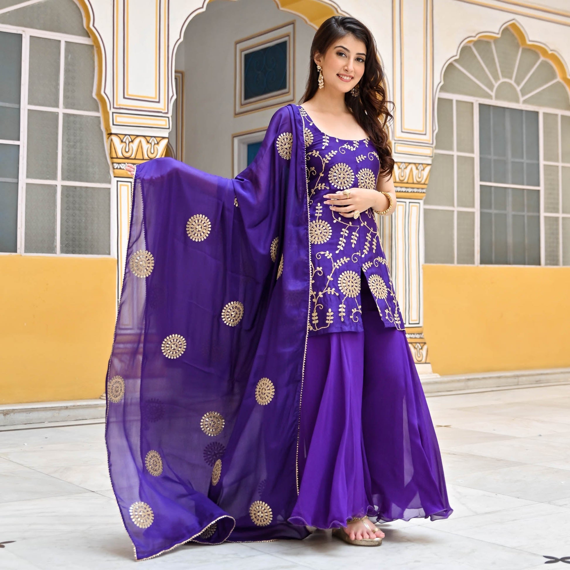Our vibrant Maahru Suit Set is as bold and beautiful as your personality. Crafted from a blend of bright purple georgette and cotton-silk fabric, it's a match made in fashion heaven. With golden Zari embroidery that sparkles like stardust and a matching dupatta, this suit set is a statement piece that will have you shining bright.