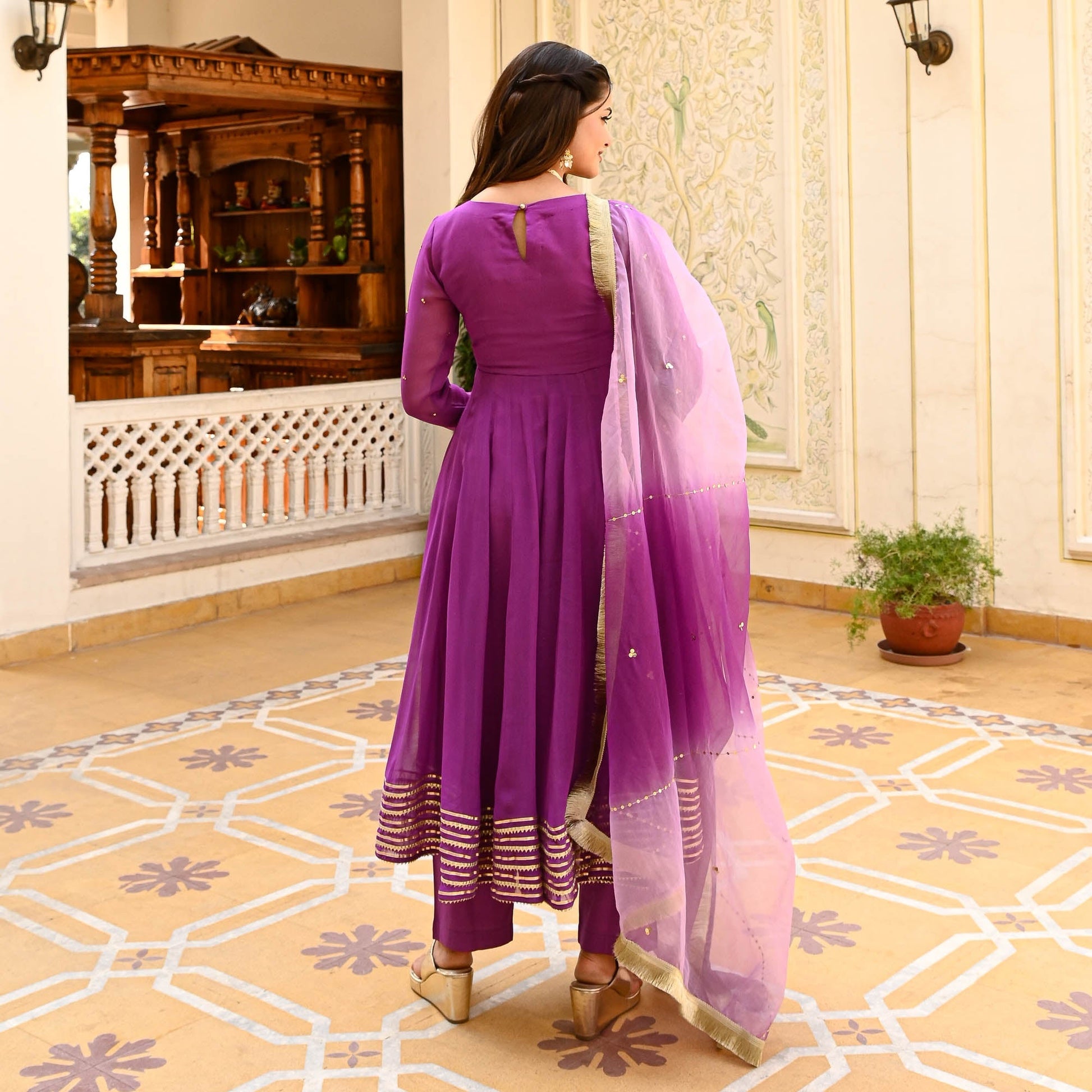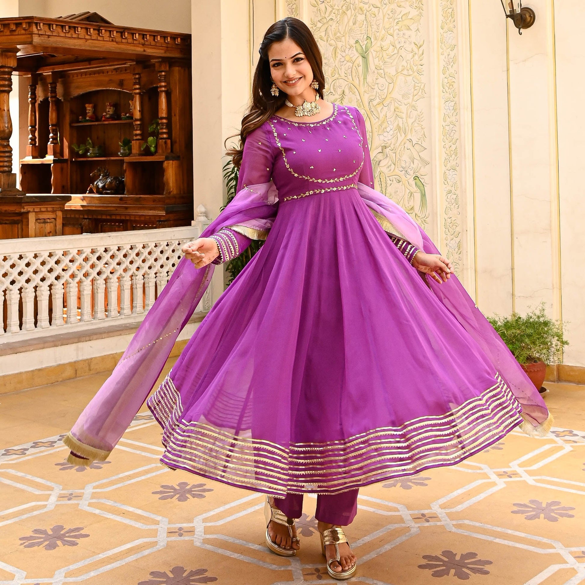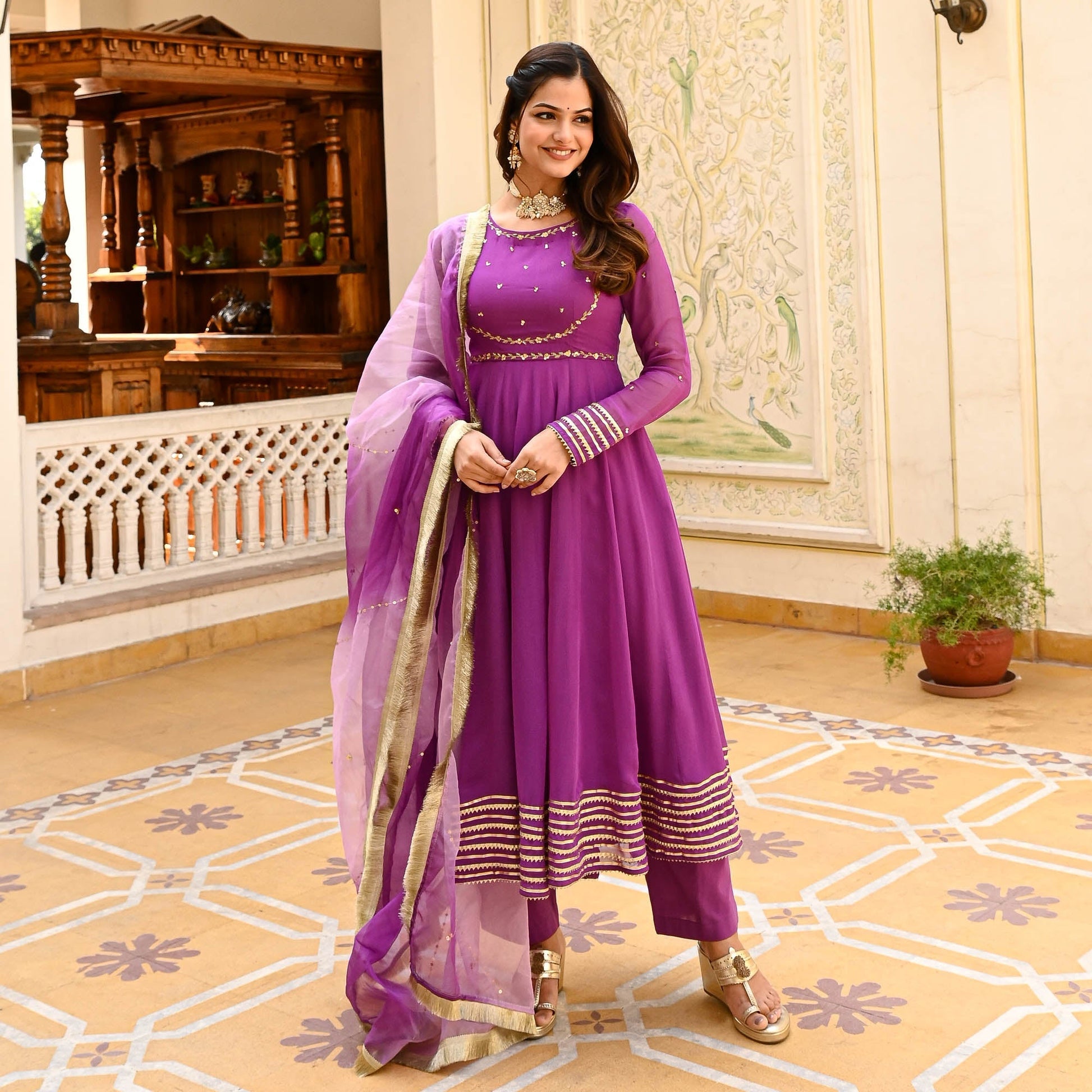 Introducing the Mahira Suit Set, a celebration of sophistication and charm, meticulously crafted from luxurious purple georgette fabric. Its allure lies in the intricately embellished yoke, adorned with exquisite zari and sequins, framing a round neck and elegant full sleeves accented with delicate gota lace detailing. The Anarkali-style kurta exudes timeless elegance with complementary gota lace along the hemline, while the ensemble is elevated by an organza ombre dupatta featuring fringe lace on the edges and intricate sequin work throughout. Paired with coordinating pants, this ensemble is a fusion of tradition and modernity, perfect for glamorous occasions and festivities, ensuring you radiate grace and allure effortlessly in the Mahira Suit Set.